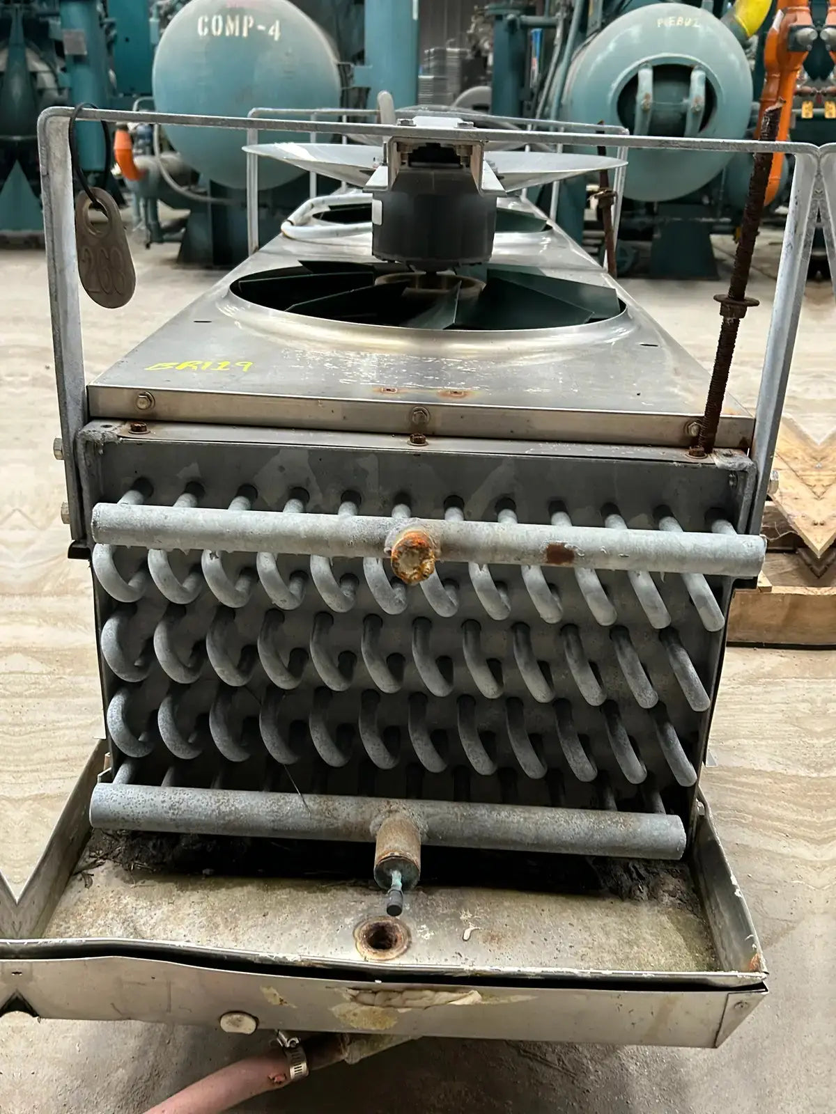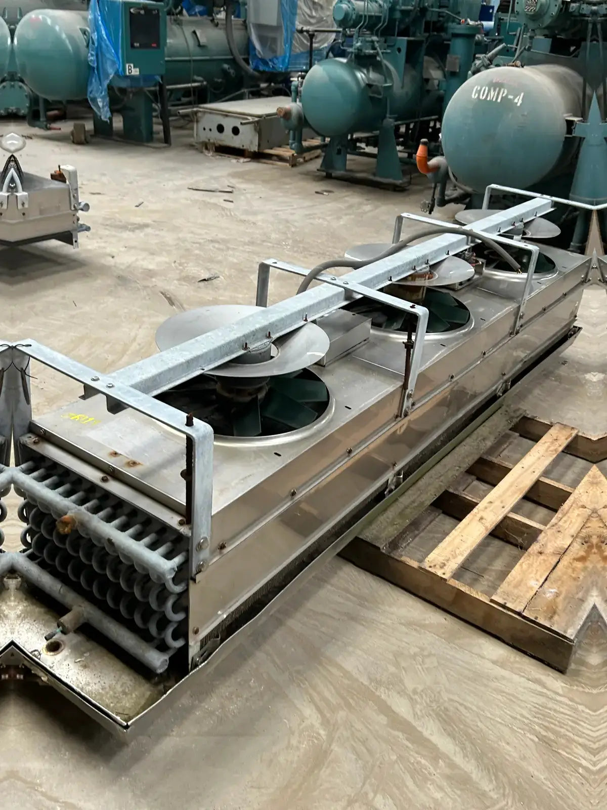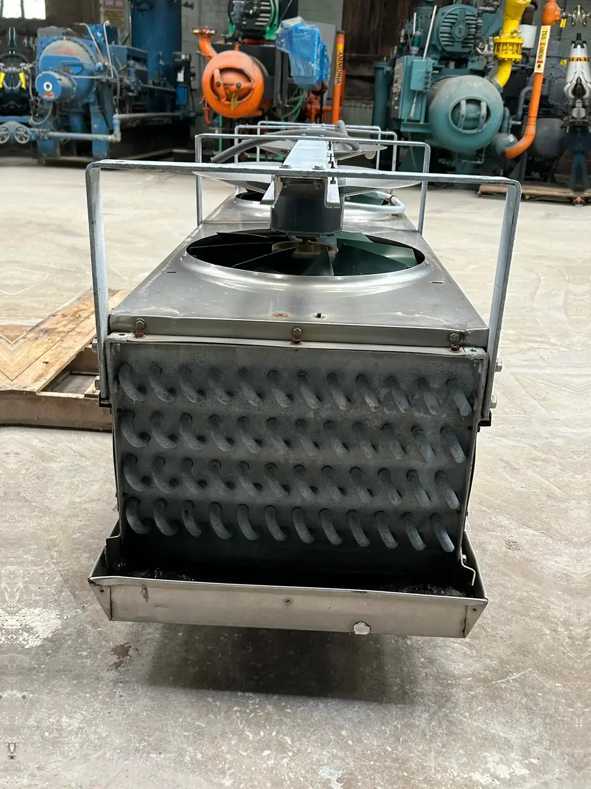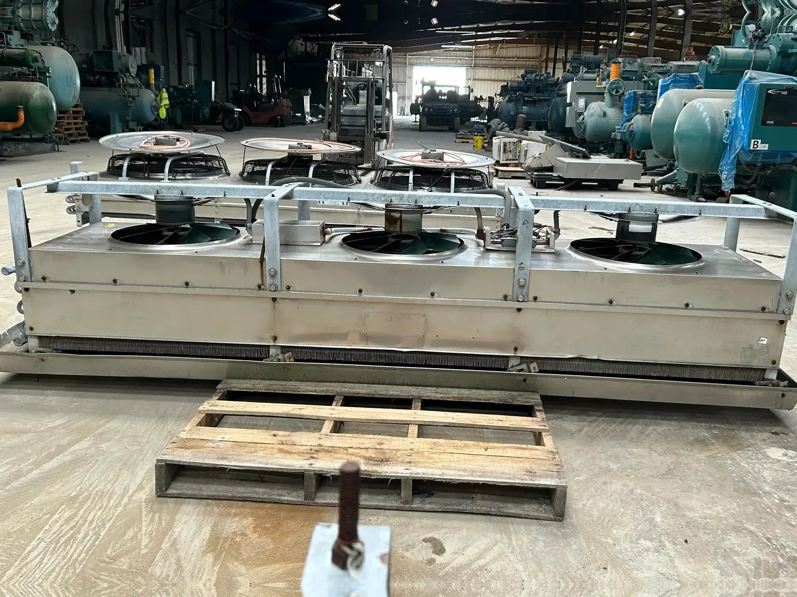 Evaporador enfriador Krack BTRS-38-RTA. 3 ventiladores, motores de 1/6 hp y 5550 CFM. Gabinete y bandeja de drenaje de acero inoxidable. 4,12 toneladas (49 500 Btuh a 10 °C).