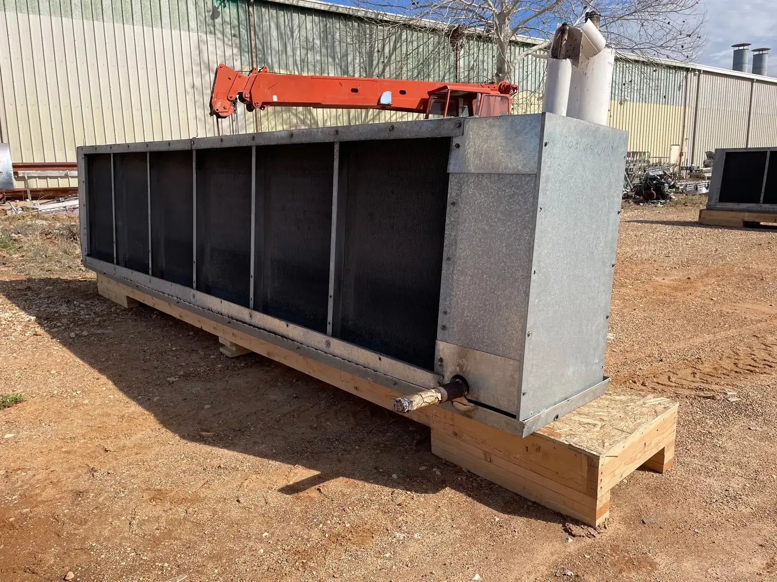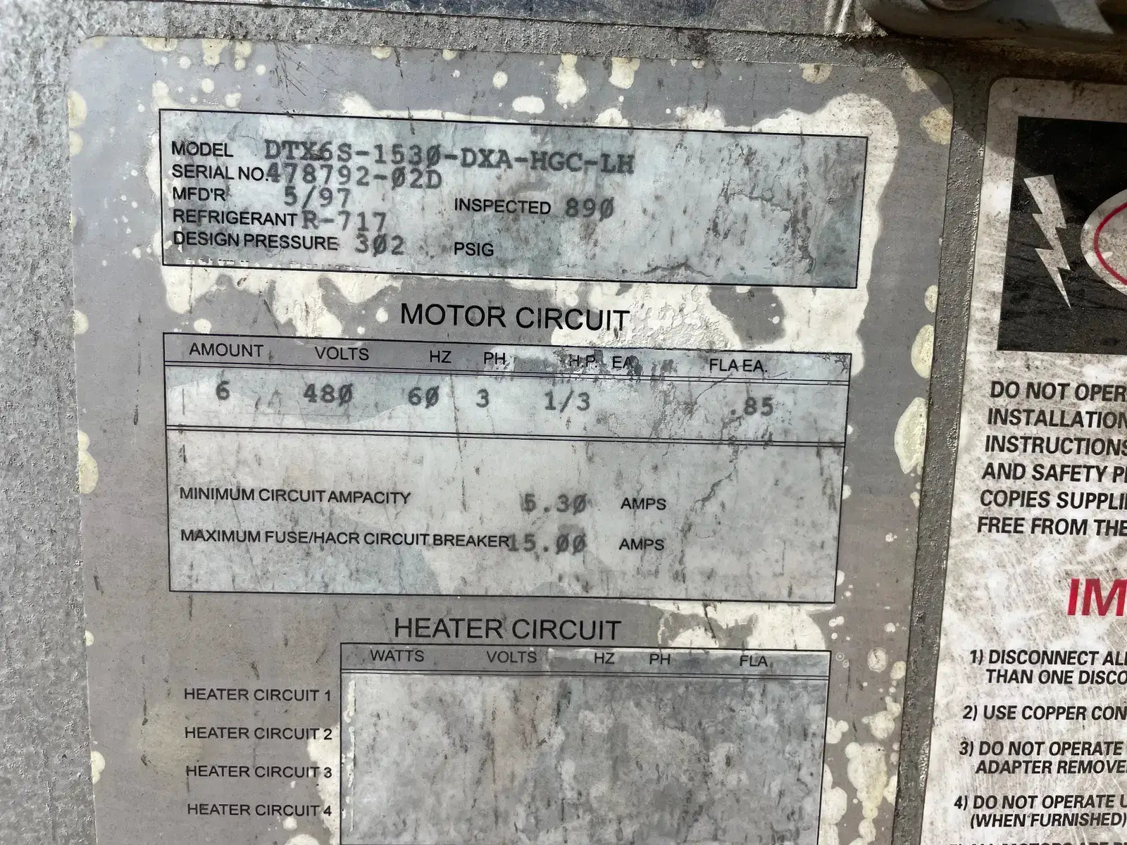 Serpentín Evaporador Serie DTX Temperatura Baja/Media. Modelo: DTX6S-1530-DXA-HGC-LH. Número de serie: 478792-02D. Capacidad húmeda BTUH (DX): 13970. Capacidad esmerilada BTUH (DX): 12700. CFM: 27000, FPM de cara: 605. Número de filas: 6. Aletas por pulgada: 4. Pies2 de cara: 44,6. Superficie Ft2: 3720. Volumen de la bobina Ft2: 4,4. Los tubos son bobinas de acero de 3/4 OD y el marco interno está galvanizado en caliente. Incluye bandeja de drenaje. Seis ventiladores totalmente protegidos de 22 diámetros y 0,75 HP.