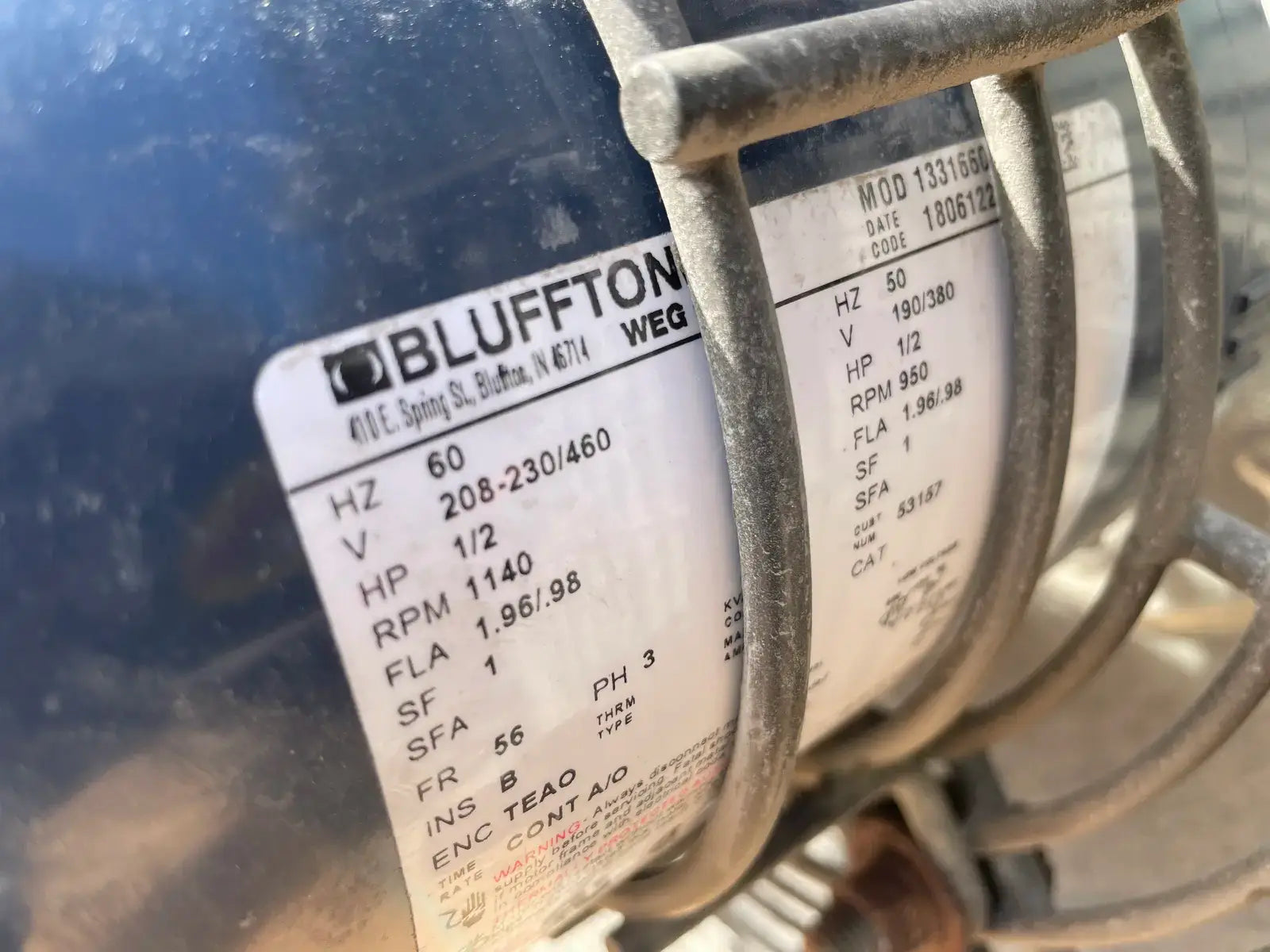 - Si hay varios motores, descripciones de motores frente a especificaciones: Fan Motors: Qty: 6, Volts: 480, Ph: 3, Hp: 0.75, Hz: 60, Amps: 0.85.