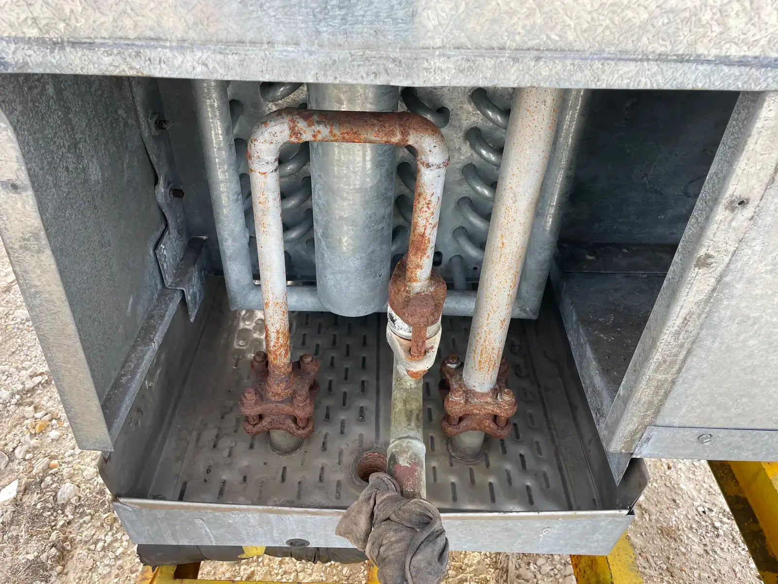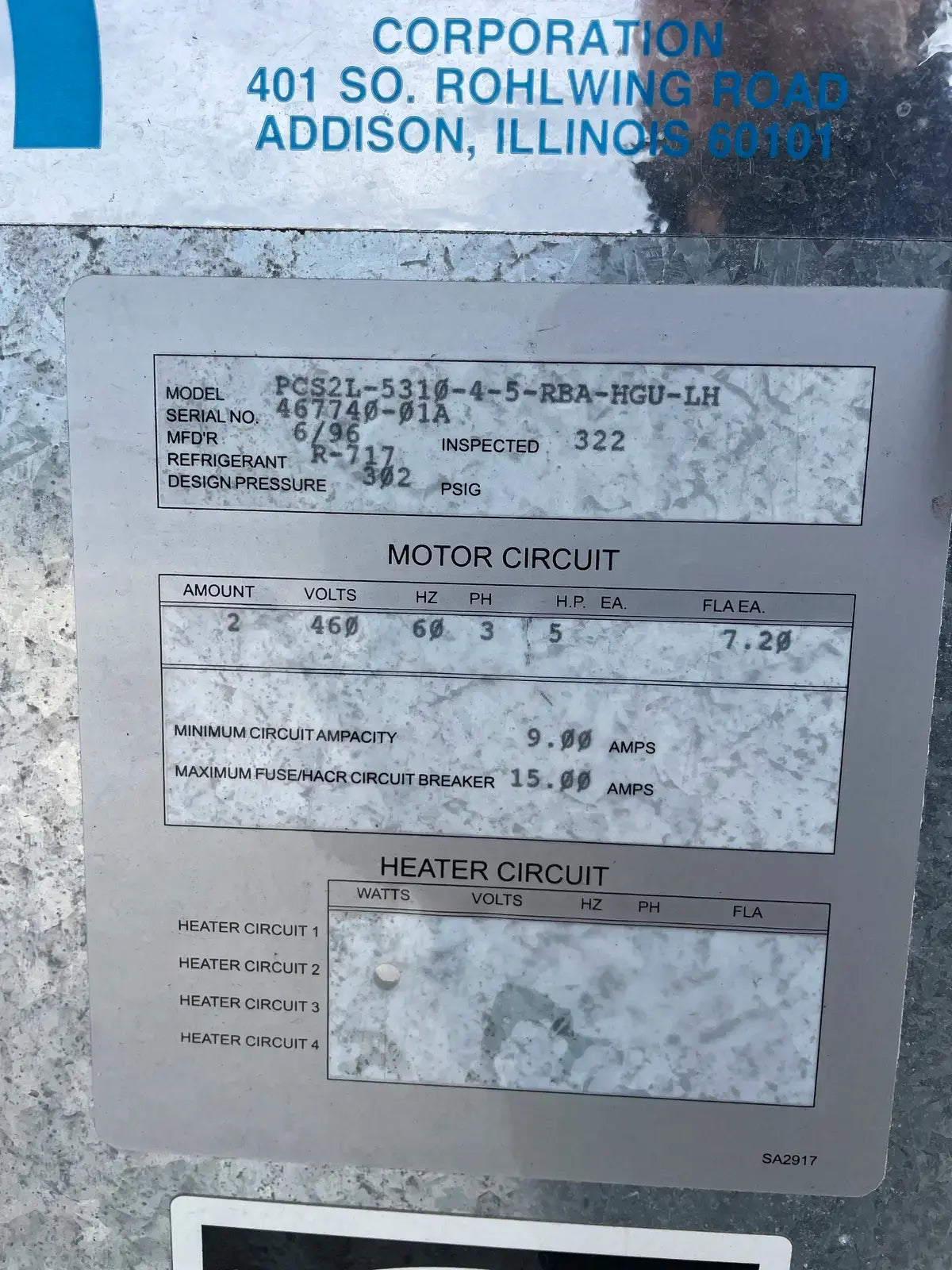 Serpentín evaporador de amoníaco Krack. Modelo:PCS2L-5310-4-5-RBA-HGU-LH. Número de serie: 467740-01A. Refrigerante: R-717. Presión de diseño: 302. Fecha de fabricación: 6/1996. Motores de ventilador (2): Voltios: 460, Hz: 60, Ph:3, Hp: 5. Diámetro del ventilador: 42 pulg.