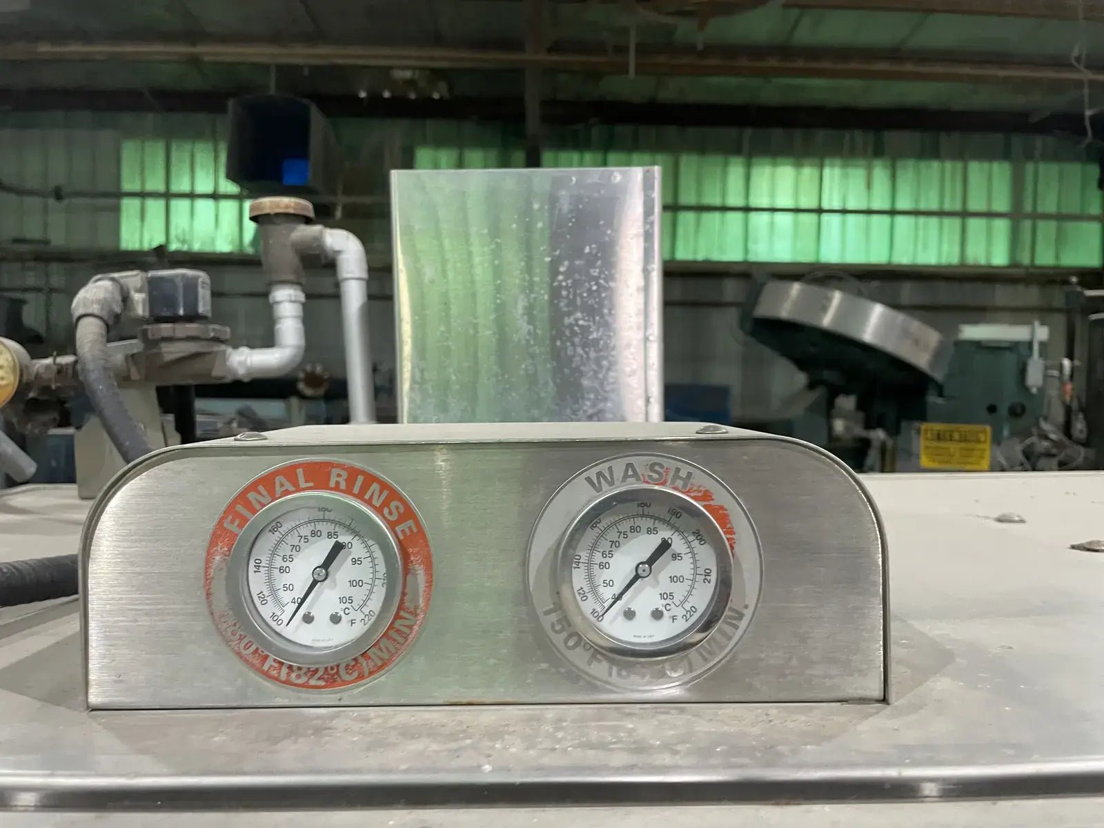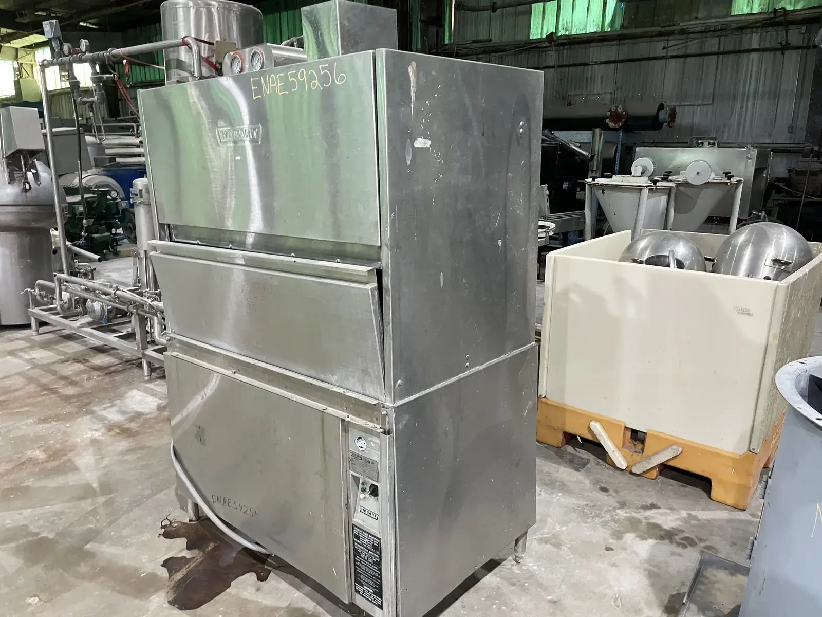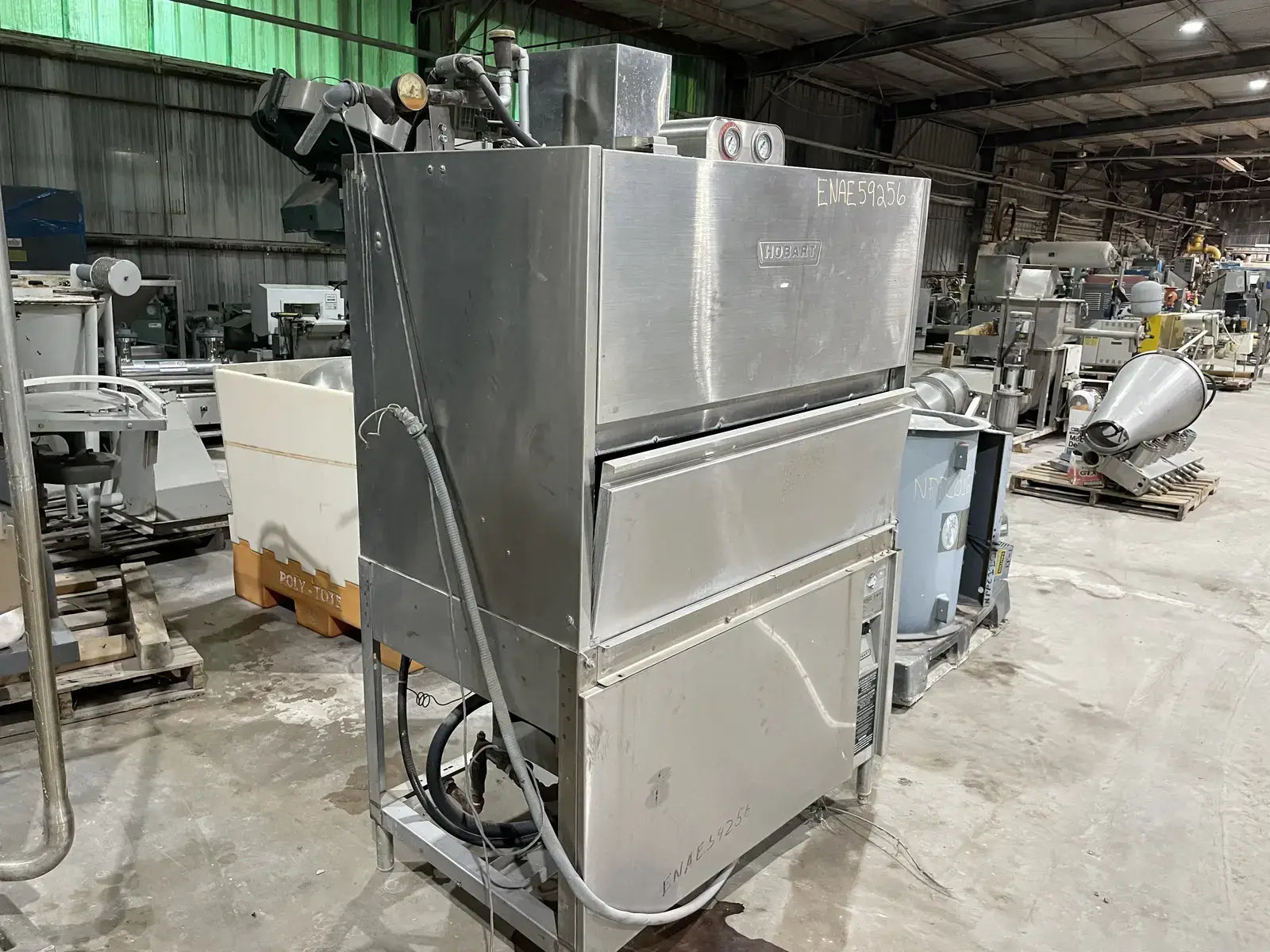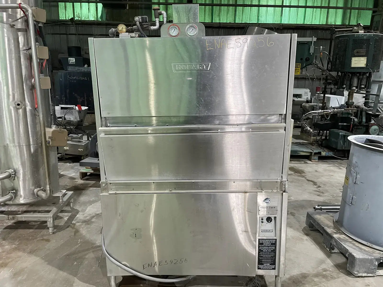 Lavavajillas comercial Hobart. Modelo: UW50. Número de serie: 85-1023016. Dimensiones interiores: 28-1/2 pulgadas de largo x 16-1/2 pulgadas de ancho x 14 pulgadas de alto. Desinfección con agua caliente: 150 °F (temperatura de lavado), 132 segundos (ciclo de lavado), 180 °F (enjuague temperatura), 24 segundos (ciclo de enjuague), presión de flujo de suministro del edificio: 20 +/- 5 psi. Desinfección química: 120 °F (temperatura de lavado), 132 segundos (ciclo de lavado), 120 °F (temperatura de enjuague), 24 segundos (ciclo de enjuague), presión de flujo de suministro del edificio: 20 +/- 5 psi. Solución desinfectante y tasa: solución de hipoclorito de sodio (lejía) al 5,2 %, 20,8 ml en 24 segundos. (máx.); Solución de hipoclorito de sodio (lejía) al 8,4 %, 13 ml en 24 segundos. (máx.). La unidad está equipada con (4) 3/8 pulg. de diámetro. Barras rociadoras giratorias de 21 pulgadas de largo cada una con (8) boquillas y (4) barras rociadoras giratorias de 4 pulgadas de ancho x 21 pulgadas de largo. Cesta de 14 pulgadas de largo x 3 pulgadas de ancho x 10 pulgadas de alto (partículas extrañas). Puede aceptar hasta 16 bandejas para hornear de tamaño completo o un tazón para mezclar de 140 cuartos. Requisitos eléctricos: 208 V, 20,3 amperios, 60 Hz, trifásico. Bomba centrífuga con motor, 5,4 hp, 3460 rpm, 208-360 V, 15/8,8 amperios, trifásica. Entradas: (1) 3/4 pulg. de diámetro. puerto (agua/desinfectante químico). Salidas: (1) 1 pulg. de diámetro. puerto de desbordamiento, (1) 2 pulg. de diámetro. descargar. Dimensiones totales: 4 pies. Largo x 2 pies 10 pulgadas de ancho x 6 pies 6 pulgadas de alto (H17) (ACN169).
