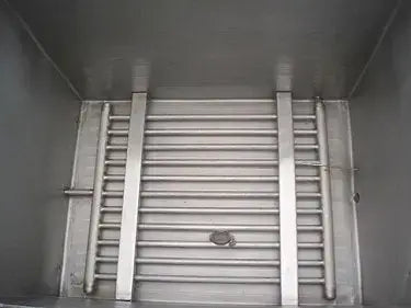 Tanque de cocción/enfriamiento de Letsch Corporation: 550 galones. Dimensiones interiores de pared recta: 4 pies 10 pulgadas de largo x 3 pies 6 pulgadas de ancho x 4 pies 4-1/2 pulgadas de alto. Número de tubos de calor/frío: 11. Dimensiones de los tubos: 1-1/ 4 pulgadas de diámetro. x 3 pies 6 pulgadas L. Volumen del tubo: 2,5 gal. Entradas: (1) 1-1/4 pulg. de diámetro. Accesorio FNPT, (1) 1-1/2 pulg. de diámetro. Accesorio FNPT, (1) entrada de producto de 4 pies 10 pulgadas de largo x 2 pies 6 pulgadas de ancho. Salidas: (2) 3/4 pulg. de diámetro. Conexiones FNPT, (1) conexión NPT, (1) 1 pulg. de diámetro. puerto (chaqueta), (1) 2-1/2 pulg. de diámetro. Puerto de drenaje S-line, (1) 1/2 pulg. de diámetro. puerto. Dimensiones totales: 5 pies 11 pulgadas de largo x 4 pies 3 pulgadas de ancho x 5 pies de alto.