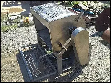 Licuadora de cinta. Dimensiones internas: 2 pies 10 pulgadas de largo x 1 pie 8 pulgadas de ancho x 2 pies de alto. Motor Dayton modelo 3KW98 de 2 HP. Descarga lateral manual. Dimensiones totales: 4 pies 1 pulgada de largo x 2 pies 3 pulgadas de ancho x 4 pies de alto.