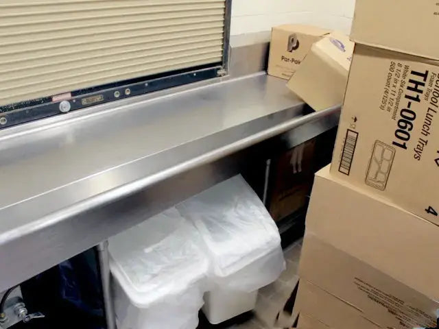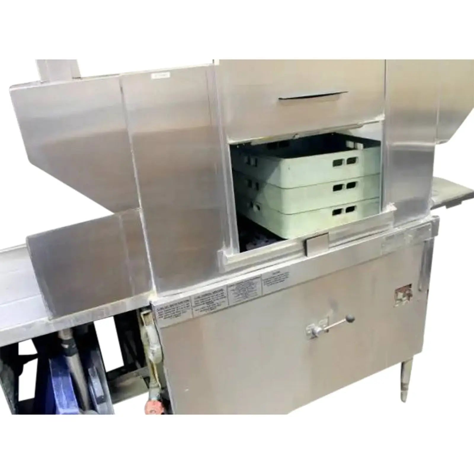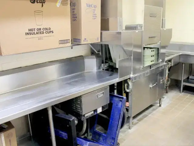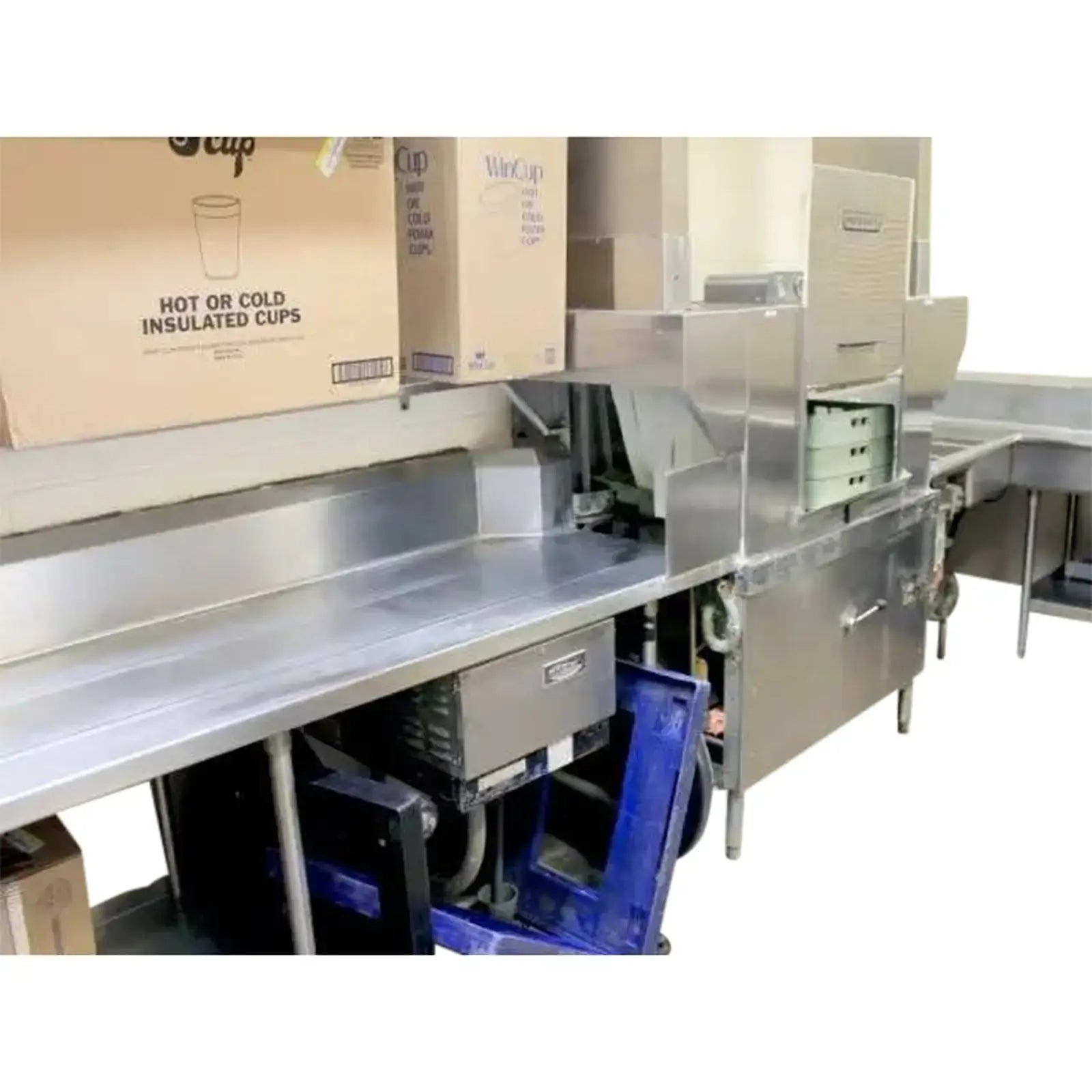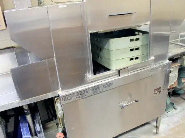 Línea de lavavajillas Hobart. Incluye lavadora Hobart C-44, 400-480v, trifásica, incluye rejillas de ventilación de acero inoxidable hasta el techo. Calentador de agua Hatco, trifásico. Eliminador de basura BusBoy 3000, trifásico. Línea de acero inoxidable de 212 x 144 pulgadas (tiene 3 estantes inferiores de acero inoxidable y patas de acero inoxidable). Tamaño actual de la bandeja: 19,75 pulgadas x 19,75 pulgadas x 3,75 pulgadas de alto. Capacidad máxima: 6 bandejas.