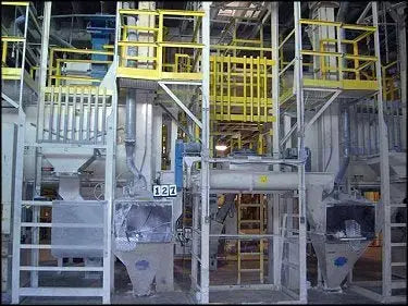 Líneas de llenado y mezcla de polvo/polvo. Incluye: (2) licuadoras de cinta horizontales de alta resistencia, aprox. 3 pies x 8 pies con motor y accionamiento. (2) elevador de cangilones vertical con tolva vibradora de aire, aprox. 18 pies de altura con conducto de descarga. (2) transportadores de sinfín de alimentación horizontal, aprox. 7 pies de largo con motores y variadores. (1) Báscula digital electrónica para bolsos Toledo con aprox. Marco de 20 pies. (2) Báscula digital electrónica para bolsos IQ-Plus, con aprox. Marco de 20 pies. (2) alimentador/tolva de acero con aprox. Soporte de 18 pies. (5) Transportador de cangilones vertical universal, aprox. 20 pies de altura. Barandillas, escaleras y pasarelas de seguridad amarillas.
