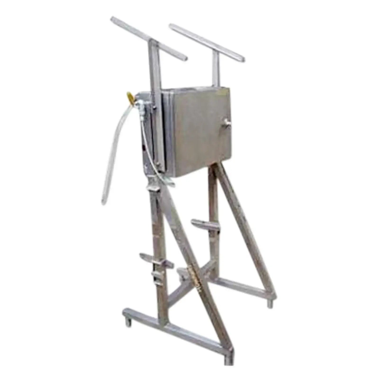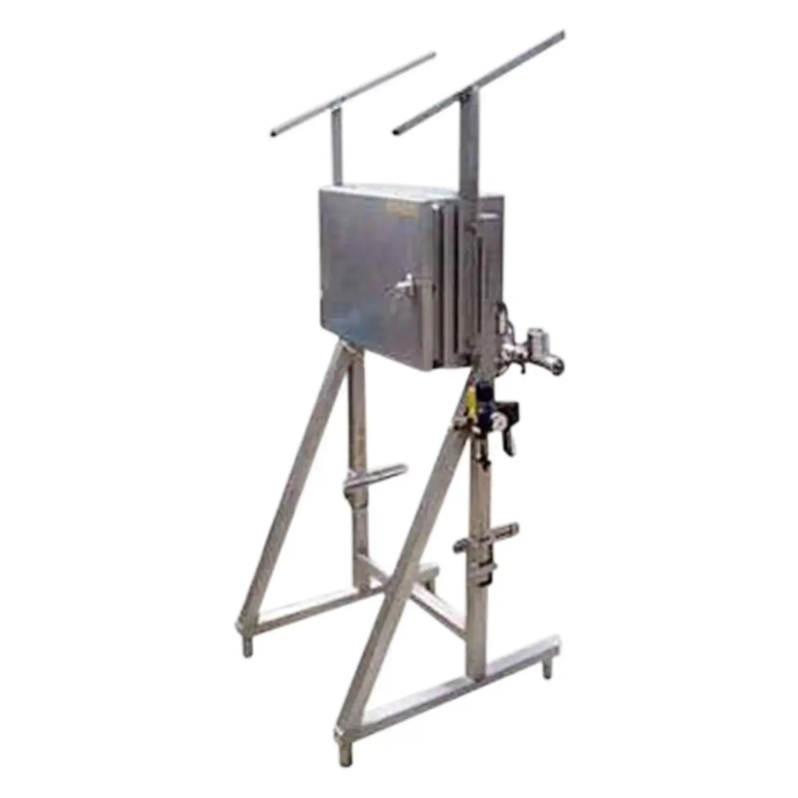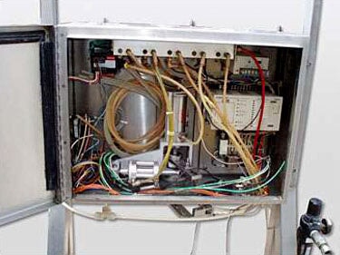 Llenadora de cajas y bolsas de acero inoxidable Liqui-box. Diámetro de la boquilla: 3/4 pulg. Controlador industrial Sysmac S6 ProgRam. Entradas: (2) 2 pulg. de diámetro. Accesorios de línea S, (1) 1 pulg. de diámetro. Racor ACME (entrada de aire). Salidas: (1) 3/4 pulg. de diámetro. Puerto (descarga de producto), 1/4 pulg. de diámetro. (salida de aire). Dimensiones totales: 3 pies de largo x 2 pies 8 pulgadas de ancho x 6 pies 6 pulgadas de alto (GI).