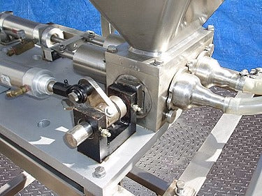 Llenadora de pistón neumático de 2 cabezales de acero inoxidable FMC, 19,6 fl. onz. (Cada Cabeza). Diámetro de la válvula: 1/2 diá. Volumen de llenado ajustable. Distancia entre válvulas: 6 pulg. Dimensiones máximas de llenado interno: 3 pulg. de diámetro. x 5 pulgadas de largo. Dimensiones de la tolva: 37-1/2 pulgadas de largo x 32 pulgadas de ancho x 26 pulgadas de alto. Ancho máximo del transportador: 4 pulgadas. Transportador: 35 pulgadas de altura de entrada/salida. Dimensiones totales: 60 pulgadas de largo x 57-1/2 pulgadas de ancho x 62 pulgadas de alto (XMR47a).