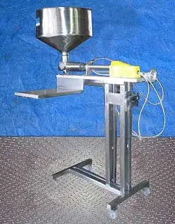 Llenadora neumática de pistón único, 24 onzas líquidas. Onz. Dimensiones de la tolva: 2 pies de diámetro. x 10 pulg. H. Capacidad: 19 gal. Dimensiones del pistón: 3 pulg. de diámetro. x 1 pulg. W. Dimensiones del cilindro: 3 pulg. de diámetro. x 7 pulg. L. Recorrido del pistón ajustable. La unidad está equipada con un interruptor de pie para iniciar el ciclo. Dimensión desde la base hasta el puerto de descarga (ajustable): Portaproducto V-Block de 6-7/8 pulg.: 5 pulg. de ancho x 4 pulg. de alto. Suministro de aire controlado por filtro-regulador-lubricador Wilkerson. Unidad montada sobre (4) ruedas para un fácil posicionamiento. Salida: (1) 3/8 pulg. de diámetro. Puerto de descarga. Dimensiones totales: 4 pies 4 pulgadas de largo x 4 pies 6 pulgadas de ancho x 6 pies de alto (XMR45)