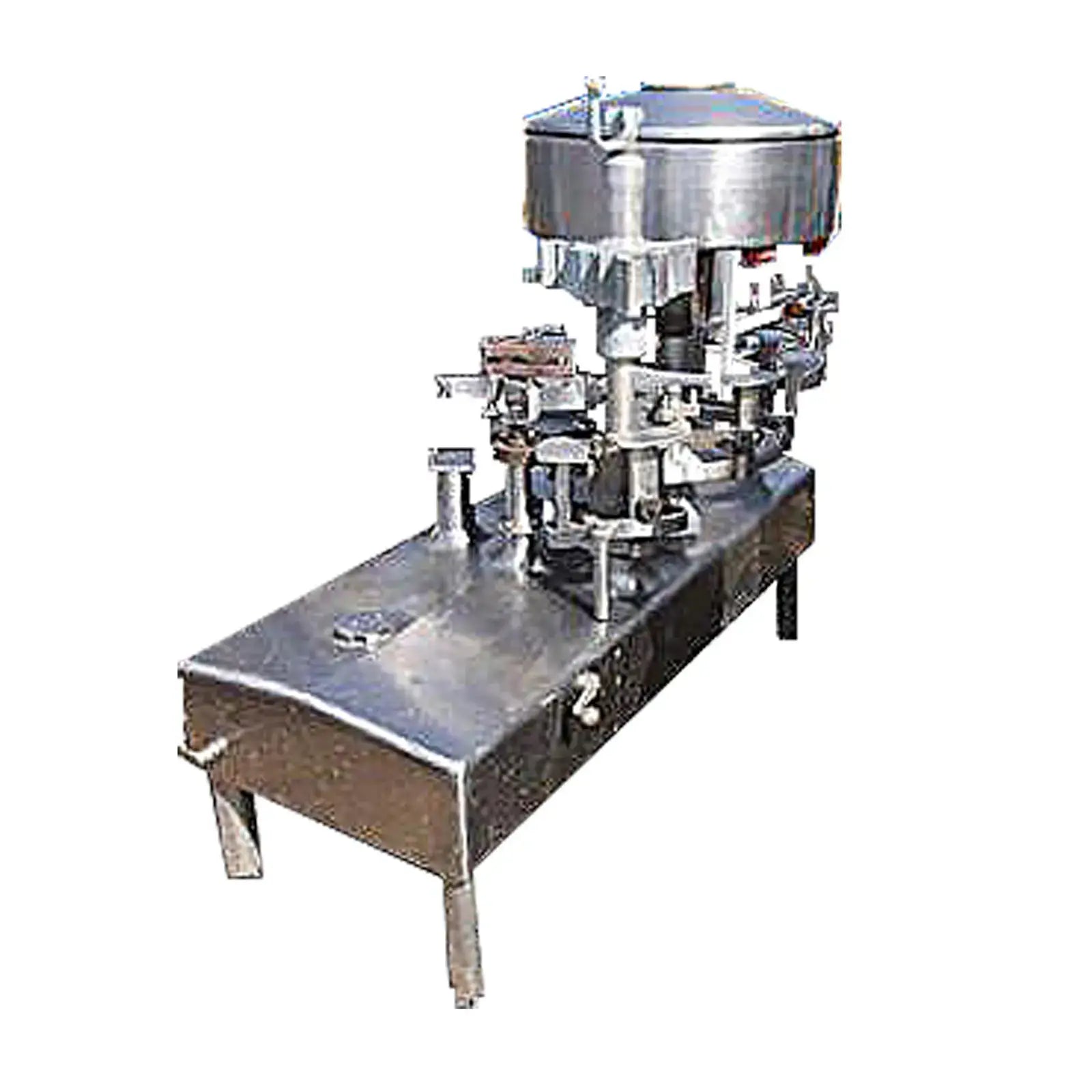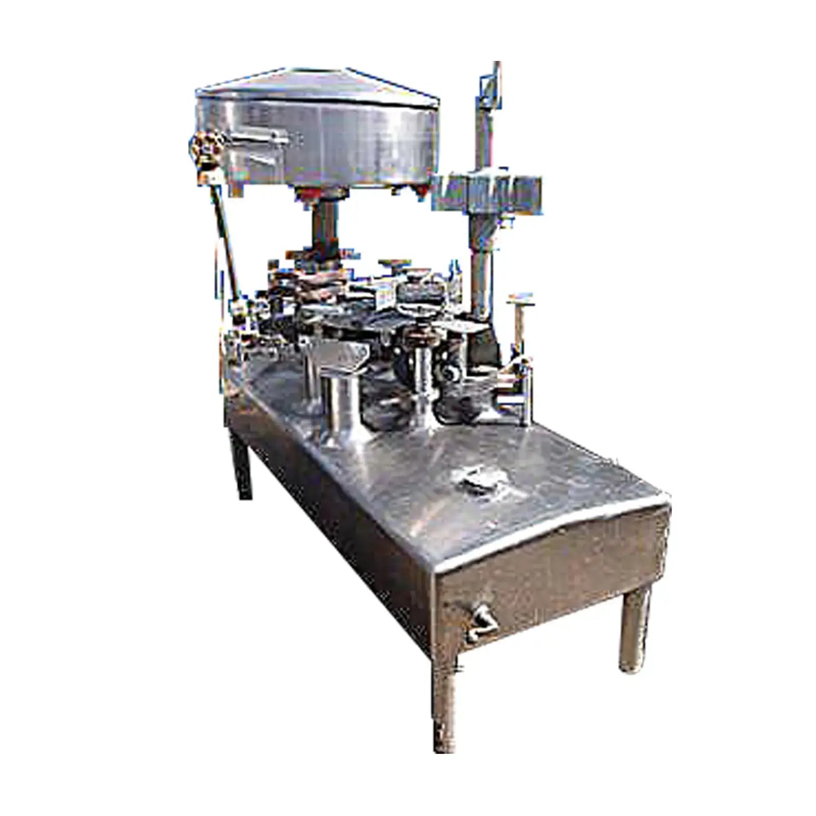 Llenadora rotativa de 8 cabezales Cherry-Burrell. Modelo: G83L. Diámetro de válvula: 1 pulg. Distancia entre válvulas: 10-1/2 pulg. Tamaño máximo del contenedor: 6-1/2 pulg. L x 4-1/2 pulg. Ancho x 9-1/2 pulg. Alto. Altura ajustable . Capacidad del tanque: 30 gal. Entradas: (1) 6 pulg. de diámetro. puerto, (1) puerto de 10 pulgadas de largo x 7 pulgadas de ancho. Dimensiones totales: 73 pulgadas de largo x 31 pulgadas de ancho x 63 pulgadas de alto.