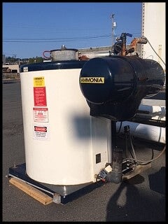 Máquina de hielo en escamas North Star usada. Modelo: M40-SS-LMC-04. Serie: 1435. Año: 2004. Superficie de congelación de acero inoxidable. Previamente funcionado con refrigerante amoniaco. Capacidad nominal: 19,3 toneladas por 24 horas (temperatura de evaporación de -25 °F, espesor de hielo de 1,5 mm, temperatura de entrada de agua de 60 °F). Peso: 4100 libras. Dimensiones totales: 83 pulgadas de largo x 56 pulgadas de ancho x 80 pulgadas de alto.