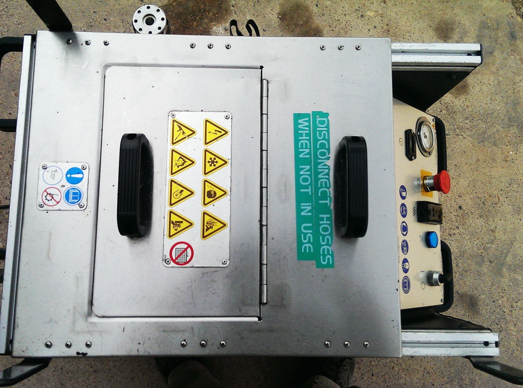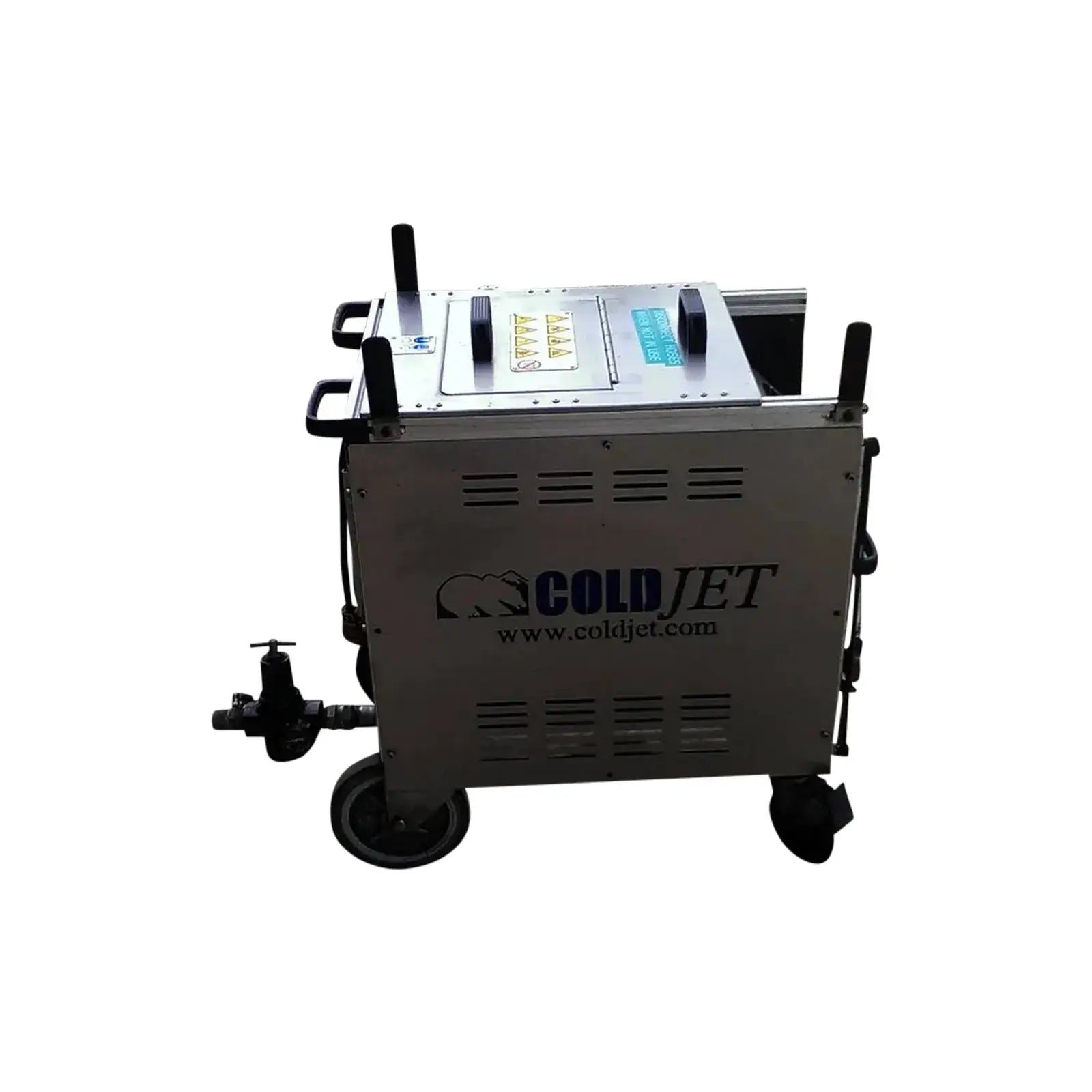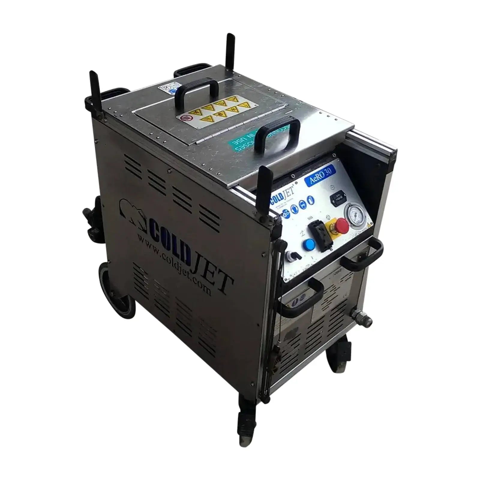 Máquina de limpieza con hielo seco Cold Jet, LLC. Modelo: AeRO30. N.° de serie: 61L2-F-560. Año: 2005. N.° de conjunto: 2A0150. Sistema de limpieza portátil, compacto y ligero con una sola boquilla. Presión de chorro neumático (máx. 140 PSI). Velocidad fija de alimentación de hielo seco: 1,5 o 3 libras por minuto. Capacidad de la tolva: 30 libras. Las boquillas se pueden cambiar para adaptarse a una aplicación de limpieza específica. El requerimiento de CFM del compresor depende de la aplicación: 50-150 CFM a 80 PSI. Requisitos eléctricos: 100-120 V, 10 amperios, 50/60 Hz, monofásico. Autonomía: 620 horas. Manual disponible. Peso: 165 libras. Dimensiones: 30 pulgadas de largo x 18 pulgadas de ancho x 34 pulgadas de alto (ACN140). Boquilla y puntas faltantes.
