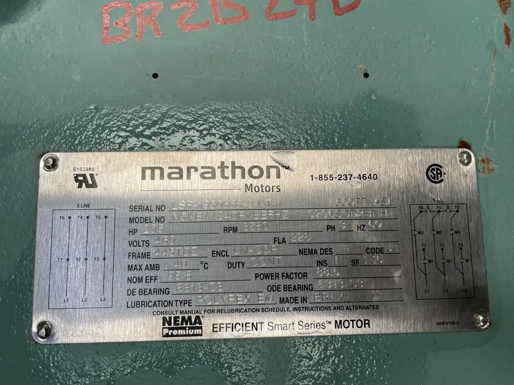 Marthon Efficient Smart Series Motor. Model:N5KBXX240PVBEFHZ 0206SCD2BNH. Serial No: LSP-1950668-2-KT-1 4600FT ASL. Power Supply - 206 HP, 3580 RPM, 3 Ph, 60 Hz, 460 Volts, 228 FLA, 445TDZ Frame.