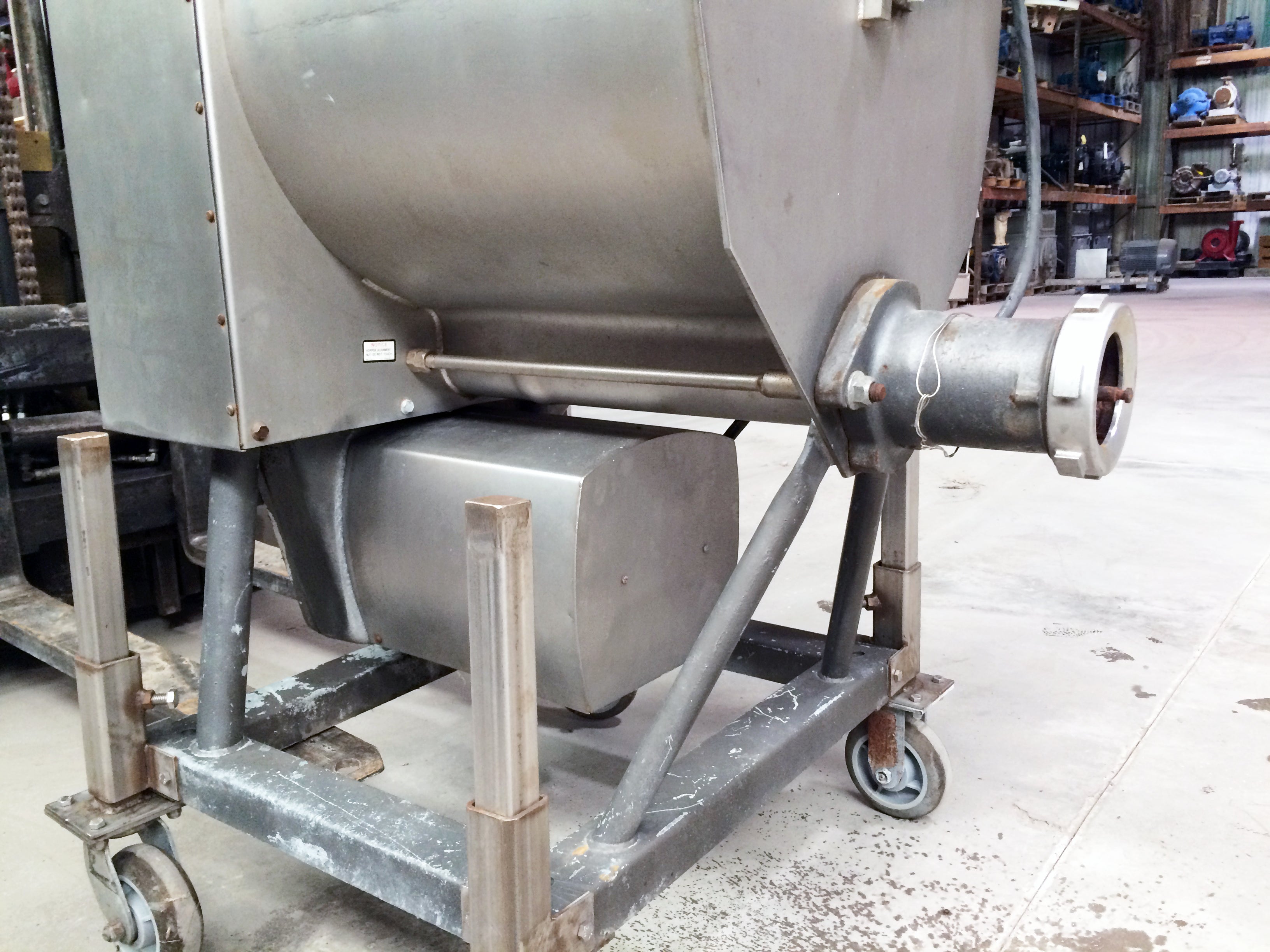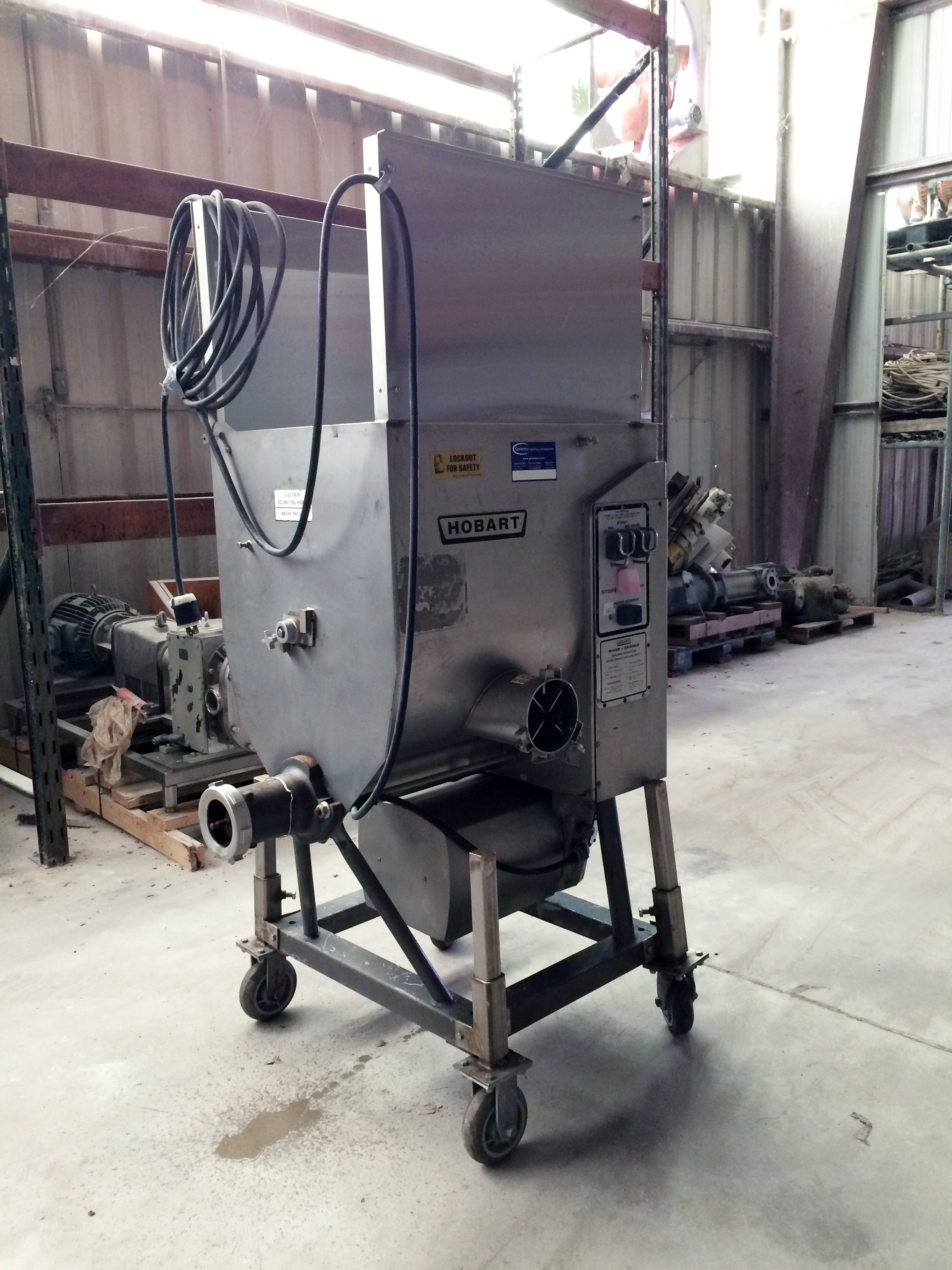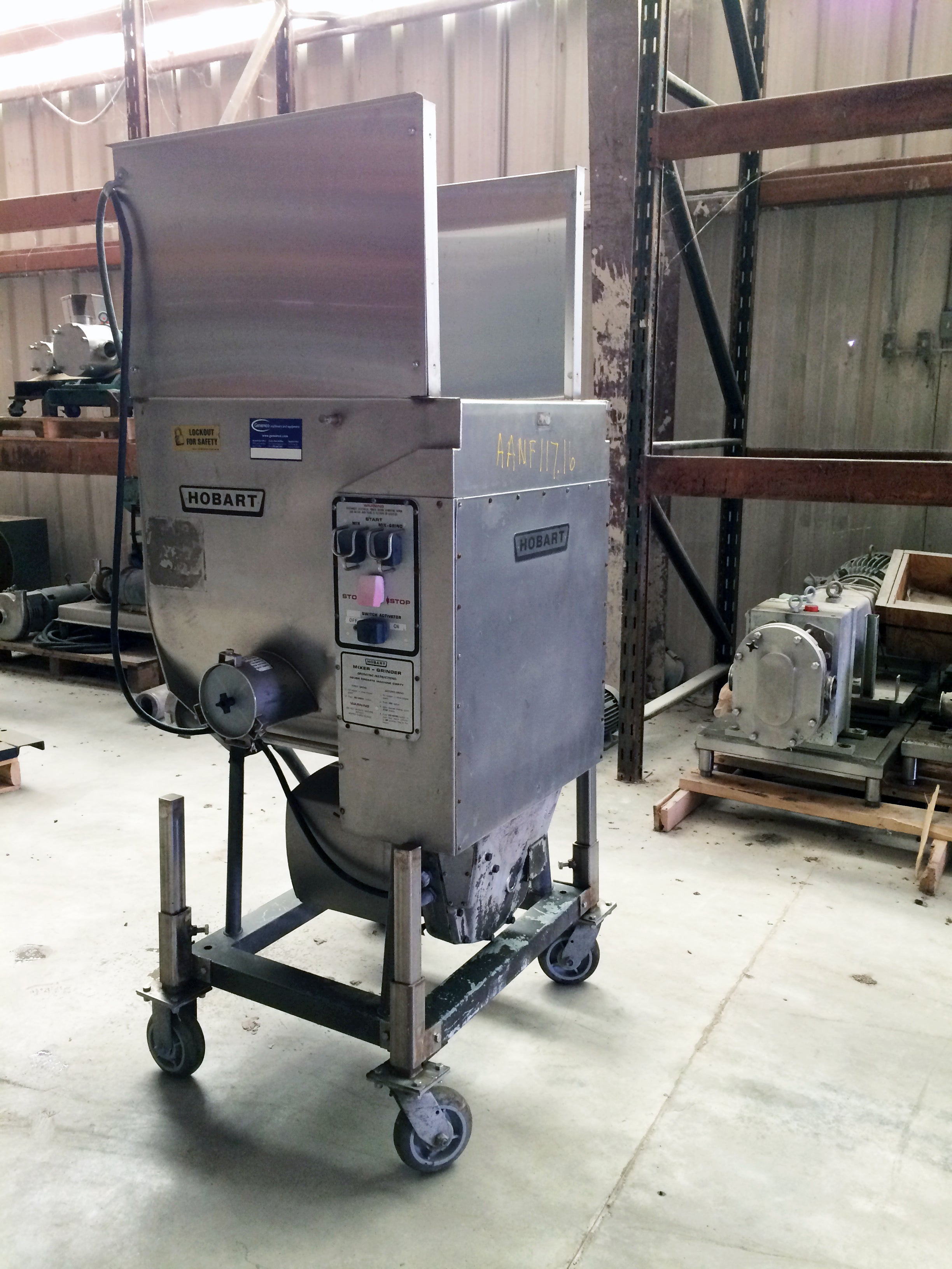 Batidora/Molinillo Industrial Hobart vertical con ruedas. Modelo 4346. Capacidad nominal: 60 lbs. de carne fresca y deshuesada por minuto. Diseñado para mezclar y moler o simplemente mezclar, el 4346 es ideal para variedades de carnes y procesamiento de salchichas. Los materiales de construcción incluyen: tolva de acero inoxidable, protección de la tolva, cubierta del motor y panel trasero. El conjunto de base es de acero galvanizado. Los artículos estañados incluyen: deflector y brazo mezclador, cilindro de hierro fundido y anillo y gusano ajustables. Especificaciones del motor: 7,5 hp, 1725 rpm, 200 V, 22,0 amperios, 60 Hz, trifásico. Dimensiones totales: 3 pies 3 pulgadas de largo x 2 pies 4 pulgadas de ancho x 4 pies 10 pulgadas de alto (ACN114).