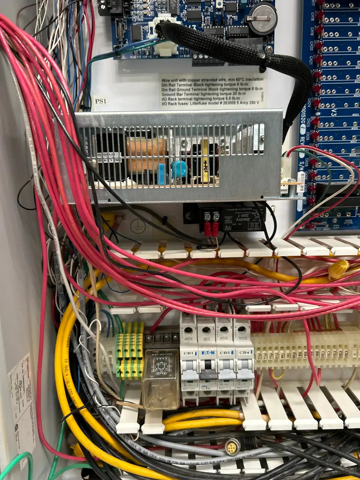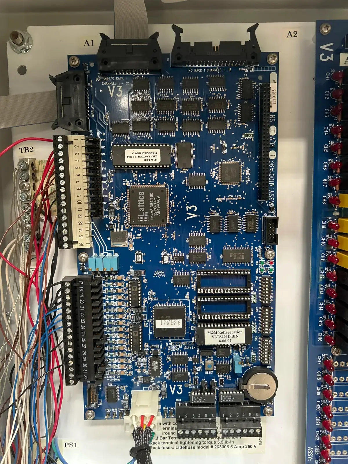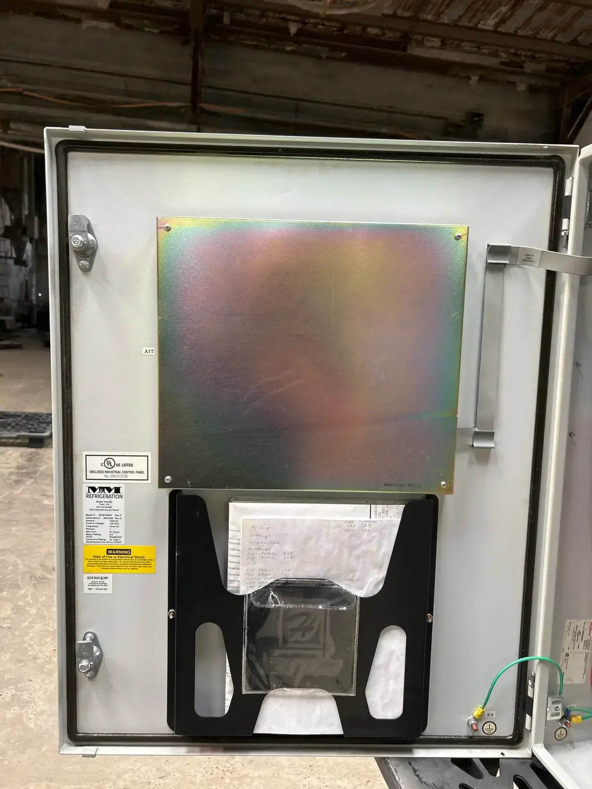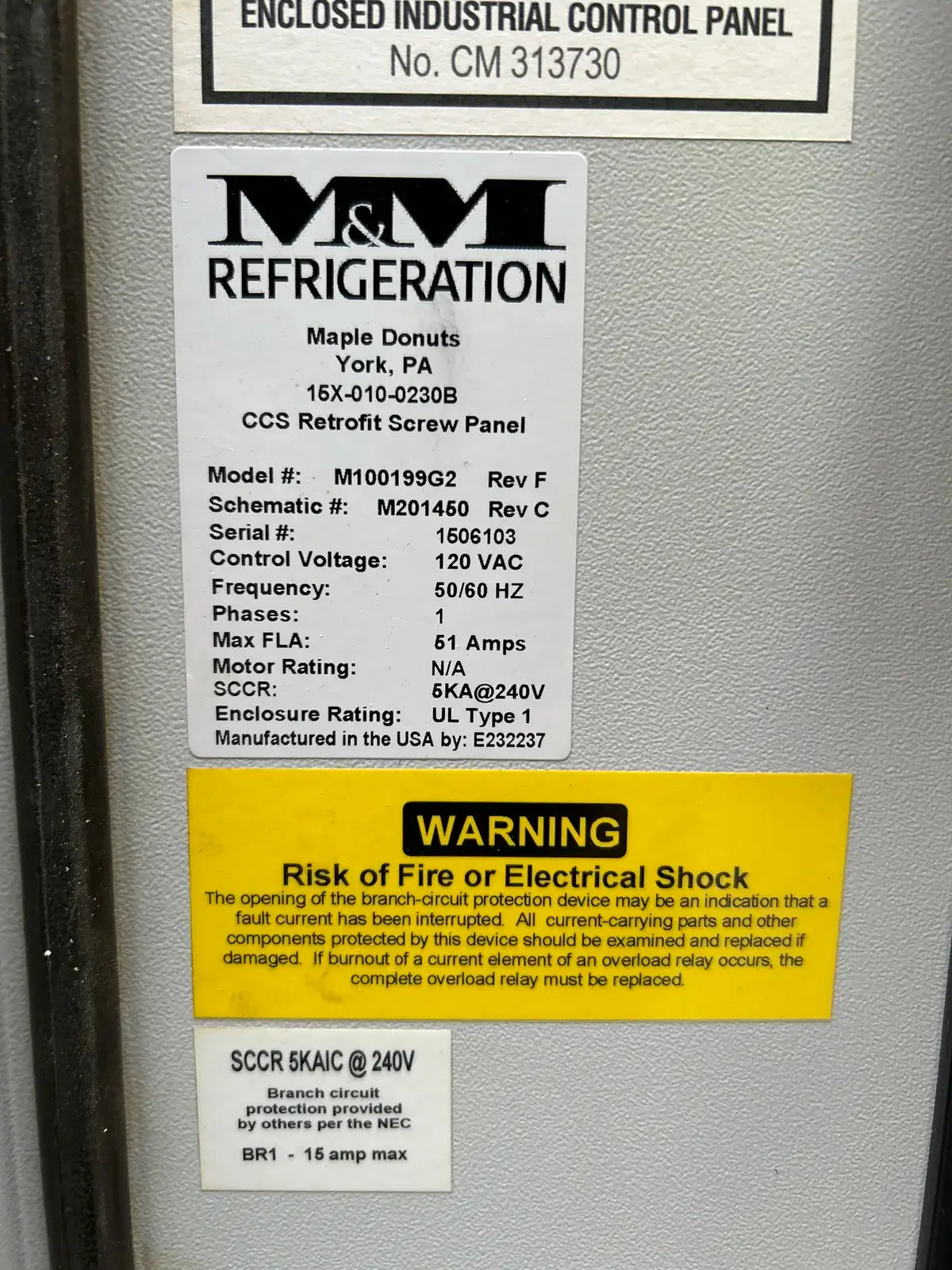 Panel de control de tornillo de reacondicionamiento CCS de M&M Refrigeration. Modelo: M100199G2. N.º de serie: 1506103. Voltaje de control: 120 V CA. Frecuencia: 50/60 Hz. Fase: 1. Corriente máxima a plena carga (FLA): 51 A. SSCR: 5KA a 240 V. Tipo de gabinete: UL tipo 1.