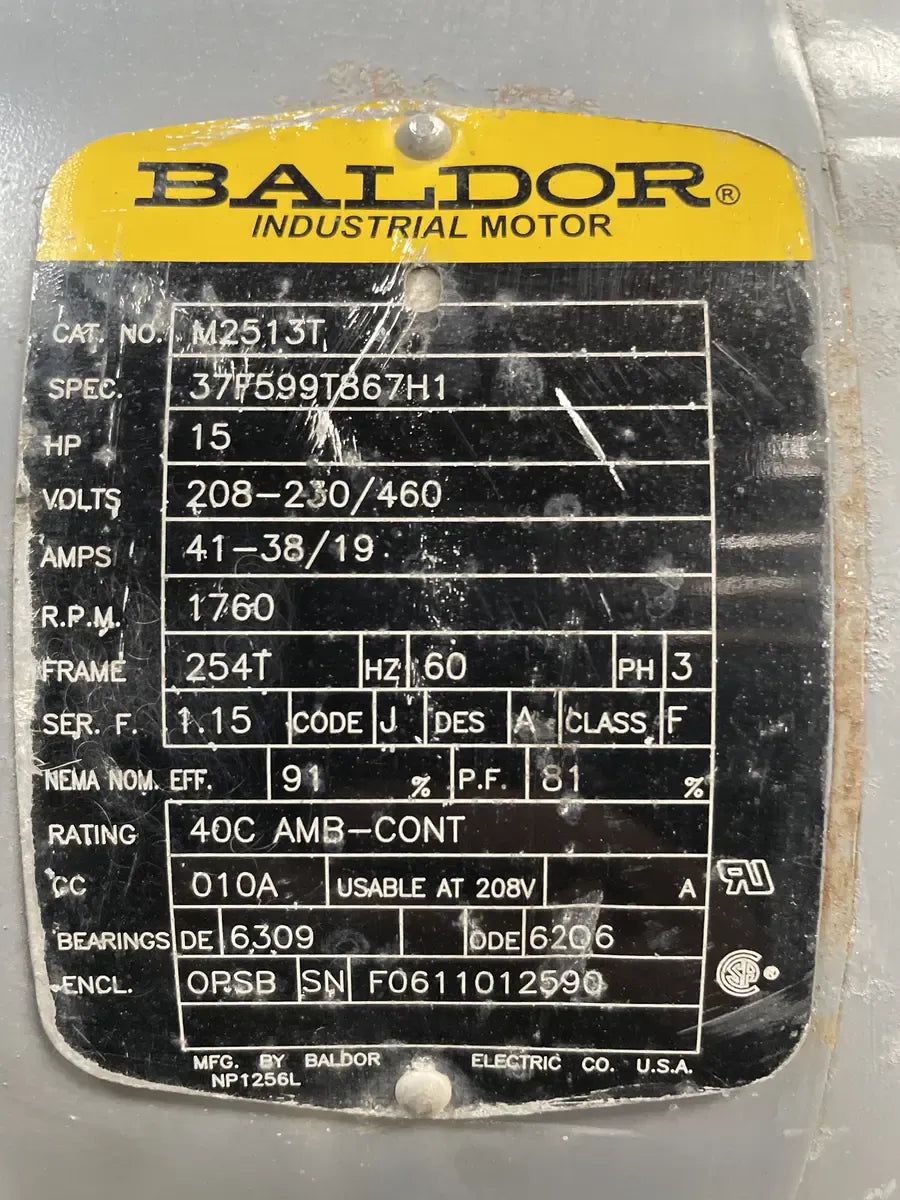 Motor Baldor M2513T (15 HP, 1760 RPM, 208-230/460 V) Número de serie: F0611012590. 15 CV. RPM del motor: 1760. Voltaje del motor: 1760. Voltaje del motor: 208-230/460. Amperios del motor: 41-38/19. Hercios del motor (HZ): 60. Fases del motor: 3. Tamaño del bastidor del motor: 254T. Dimensiones de envío (pulgadas): 43x15x17. Peso (libras): 170 N.º de especificación: 37F599T867H1