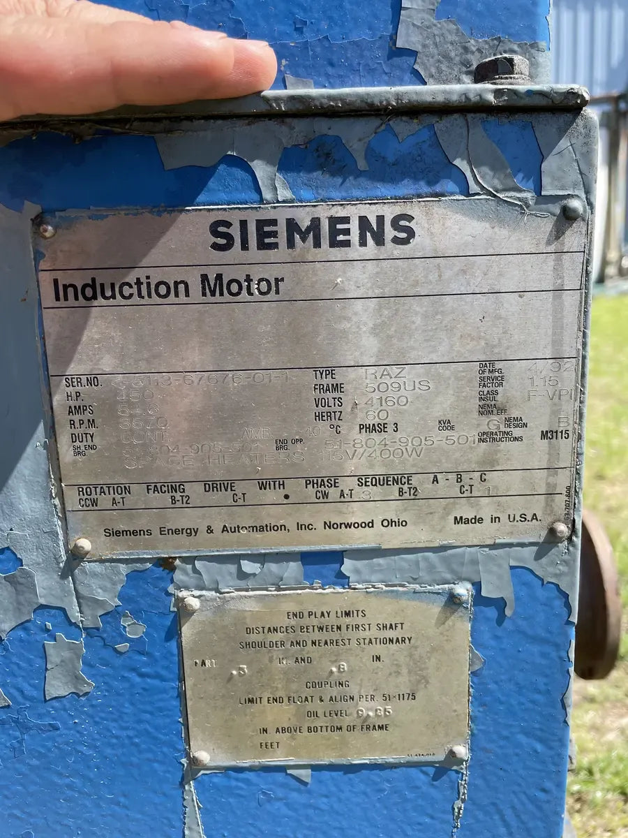 Motor de inducción Siemens. Número de serie: 1-5113-67676-01-1, HP: 450, AMPS: 54.6, RPM: 3570, Servicio: CONT, Tipo: RAZ, Marco: 509US, Voltios: 4160, Hz: 60, PH: 3. Mfg Fecha: 4/1992, Clase de aislamiento: F-VPI, Diseño Nema: B, Instrucciones de funcionamiento: M3115.