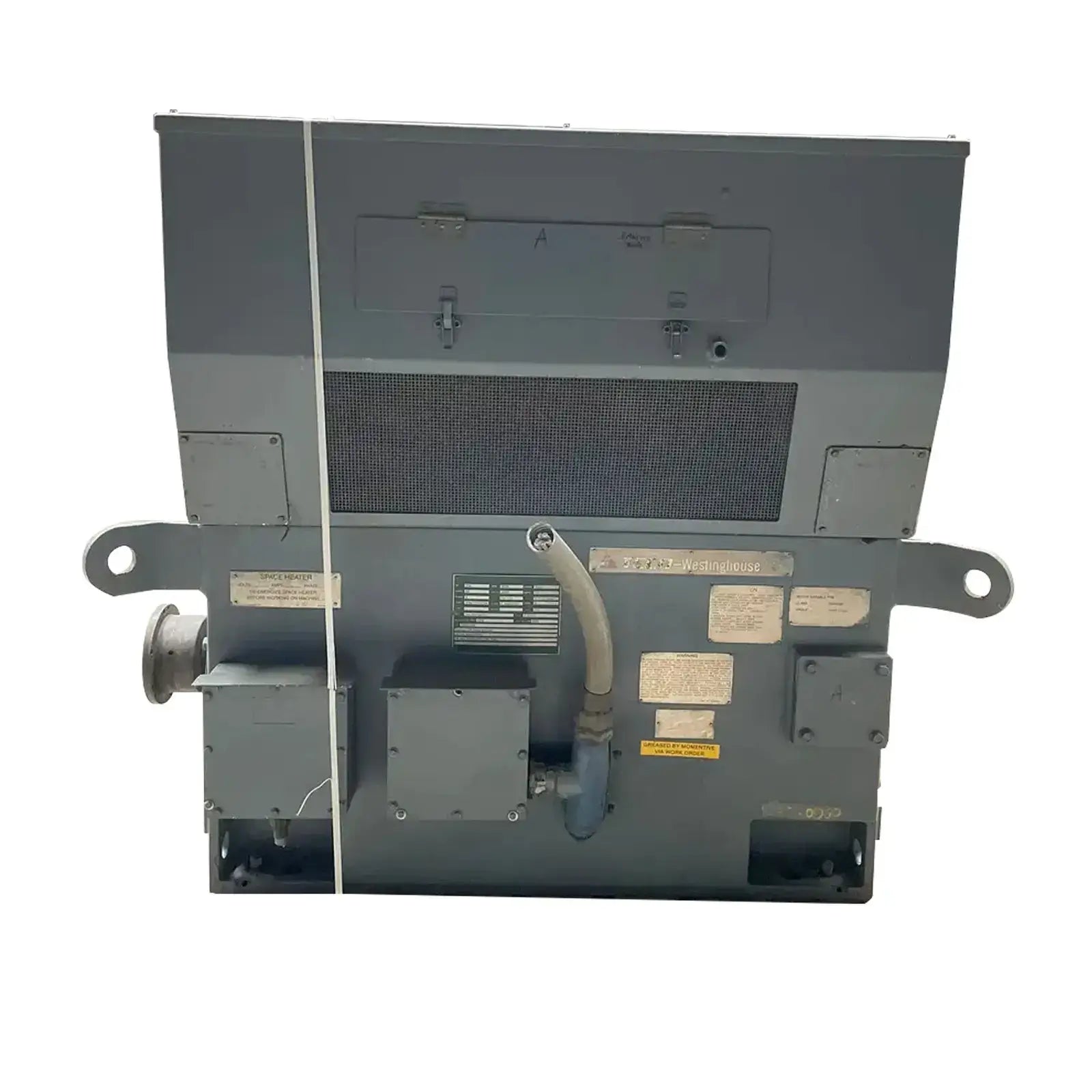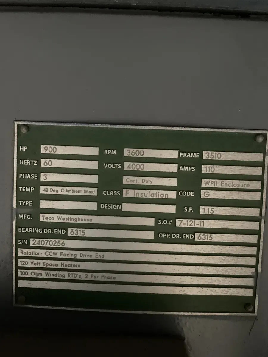 Motor eléctrico Teco Westinghouse. Hp: 900, RPM: 3600, Marco: 3510, Hz: 60, Voltios: 4000, Amperios: 110, Ph: 3, Temperatura: 40 grados. C Ambiente (Máx.). Clase: F Insultación. Código: G. Número de serie: 24070256. Rotación: CCW mirando hacia el extremo de transmisión. Calentadores espaciales de 120 voltios.