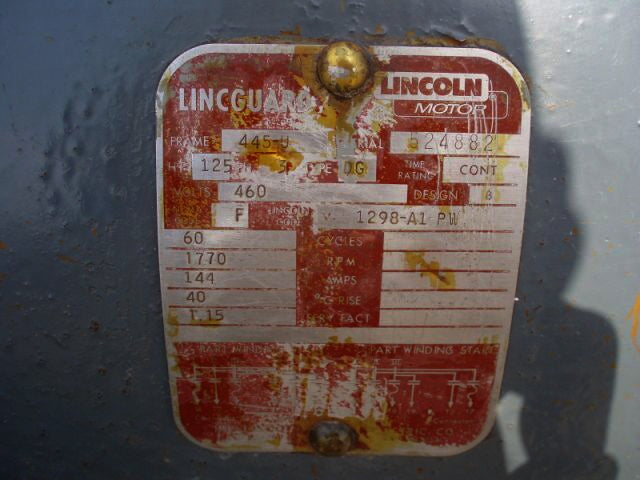 Motor eléctrico Lincoln: 125 CV. Especificaciones del motor: Estructura 445-U, Fase 3, Voltios 460, Tipo DG, Código NEMA F, Diseño NEMA B. Código Lincoln 1298-A1-PW, Hz.60, RPM 1770, Amperios 144, Diámetro del eje 3 pulgadas. Dimensiones totales L 3 pies. 4 pulgadas. x ancho 2 pies. 7 pulgadas. x Alto 2 pies. 4 pulgadas (H10).