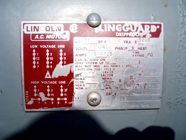 Motor eléctrico Lincoln: 50 CV. Especificaciones del motor: RPM 1770, estructura 326T, voltios 230/460, fase 3, Hz.60, amperios 125/62.5, código INS F, código NEMA G, diseño NEMA B. Diámetro del eje 2 pulgadas. Dimensiones totales L 2 pies. 3 en. x ancho 1 pie. 9 pulgadas. x Alto 1 pie. 6 pulgadas. (CAMA Y DESAYUNO)