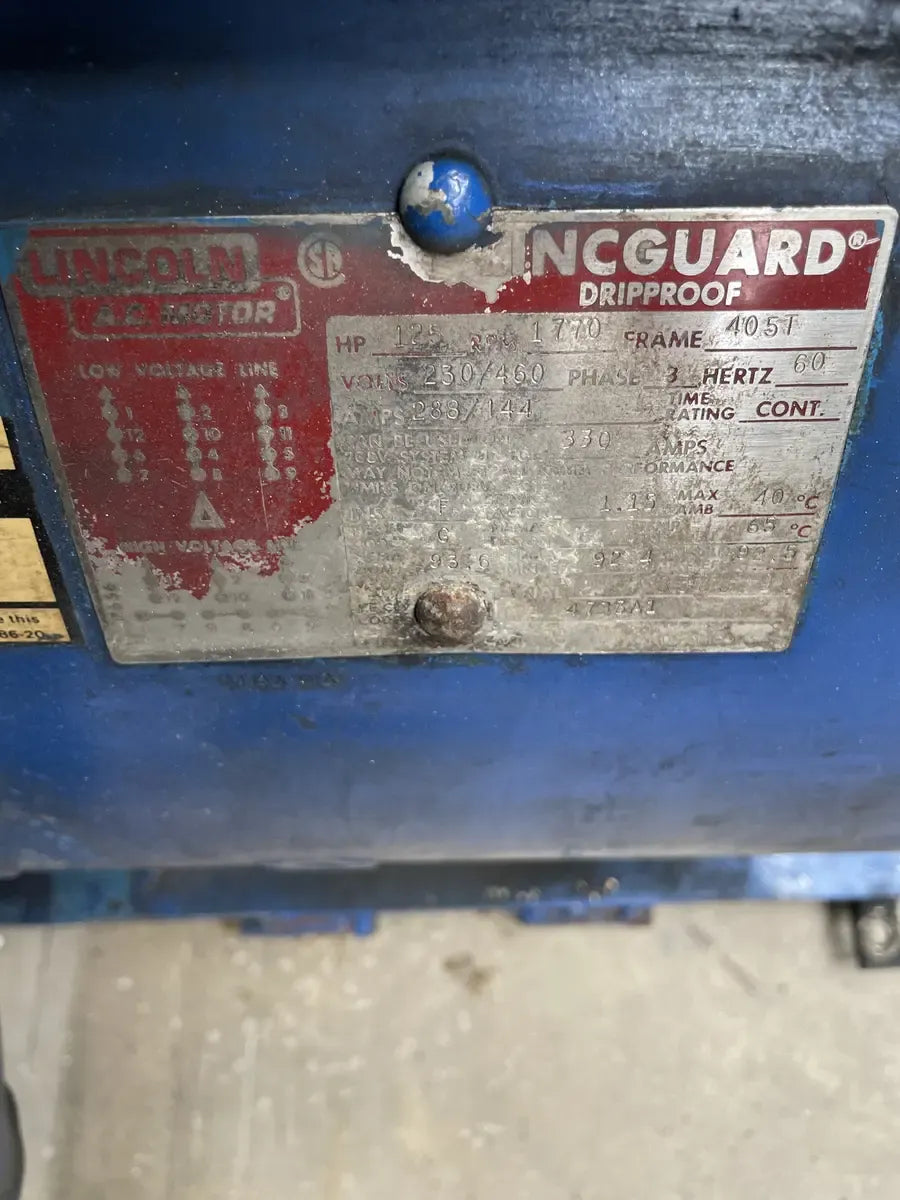 Motor de CA Lincoln Lincguard a prueba de goteo (125 HP, 1770 RPM, 230/460 V) Número de serie: 3583498. 125 HP. RPM del motor: 1770. Voltaje del motor: 1770. Voltaje del motor: 230/460. Amperios del motor: 288/144. Hercios del motor (HZ): 60. Fases del motor: 3. Tamaño del bastidor del motor: 405T. Dimensiones de envío (pulgadas): 47x30x32. Peso (libras): 850