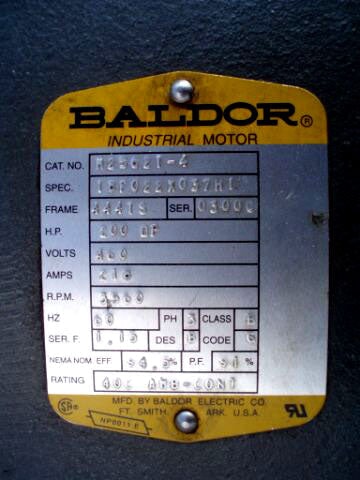 Motor Eléctrico Baldor de Alta Eficiencia – 200 HP. Número de catálogo: M2562T-4. Especificaciones. nº: 18F022X037H1. Especificaciones del motor: 3560 rpm, 460 V, 218 amperios, 60 Hz, trifásico. Cuadro: 444TS. Clase de aislamiento: B. Diseño Nema: B. Código: G. Diámetro del eje: 2 0,375 pulg. Dimensiones totales: 3 pies 2 pulg. de largo x 2 pies 9 pulg. de ancho x 2 pies 2 pulg. de alto. (H10).