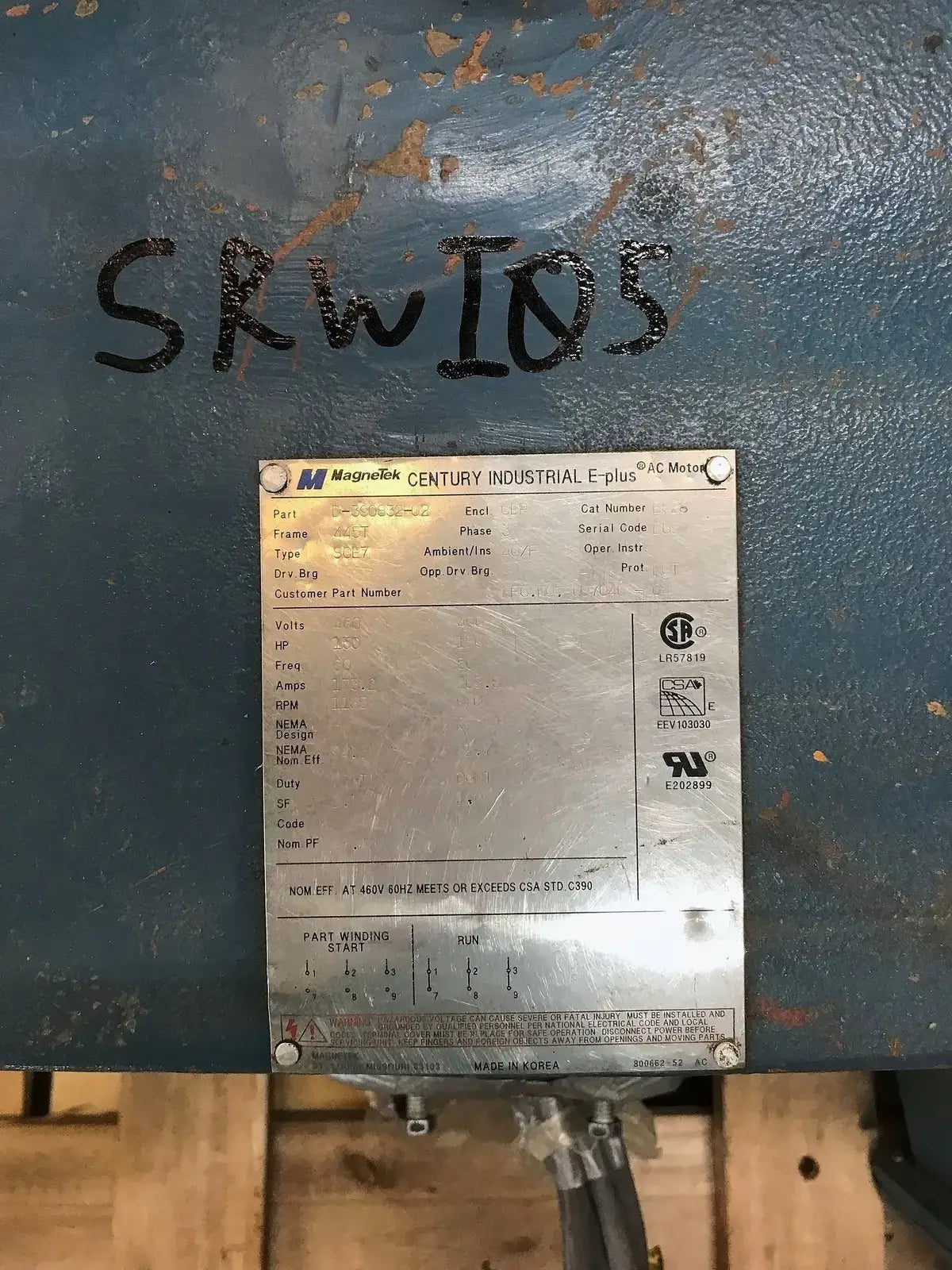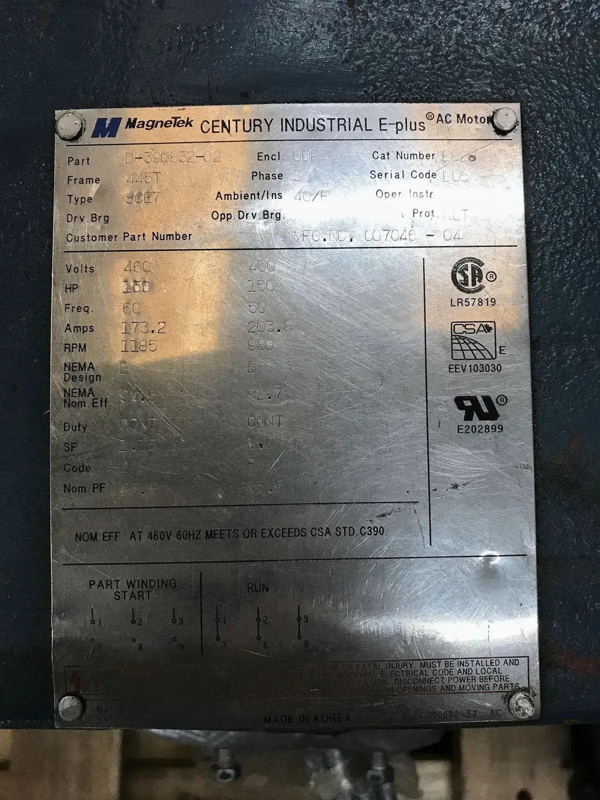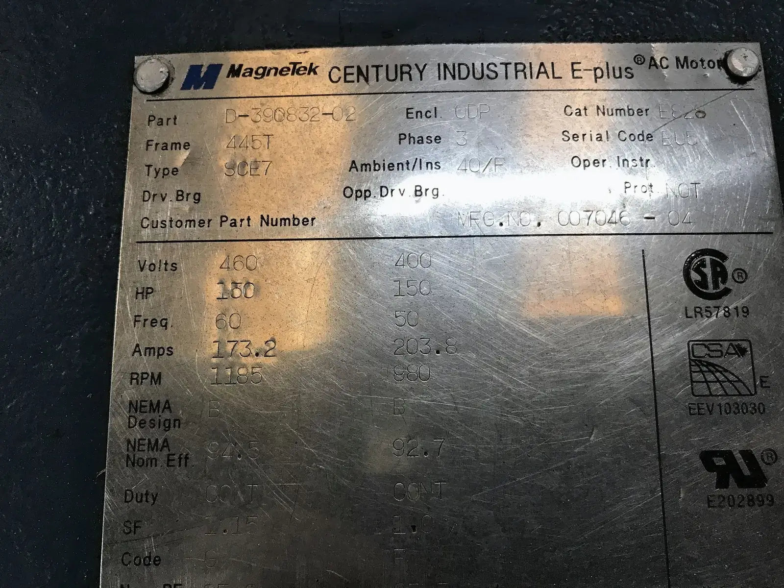 Motor eléctrico Magnetek Century Industrial E-Plus. 150 HP, 1185 RPM, 460 voltios, 173,2 amperios, 60 Hz, trifásico, marco 445T, gabinete ODP. También clasificado para 400 V 50 Hz.