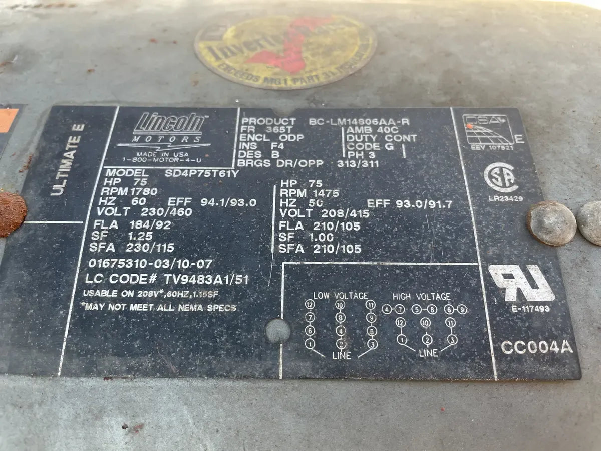 Motor Lincoln SD4P75T61Y (75 HP, 1780 RPM, 230/460 V) Número de serie: BC-LM14806AA-R. 75 CV. RPM del motor: 1780. Voltaje del motor: 1780. Voltaje del motor: 230/460. Amperios del motor: 184/92. Hercios del motor (HZ): 60. Fases del motor: 3. Tamaño del bastidor del motor: 365T. Dimensiones de envío (pulgadas): 26x32x68. Peso (libras): 1500
