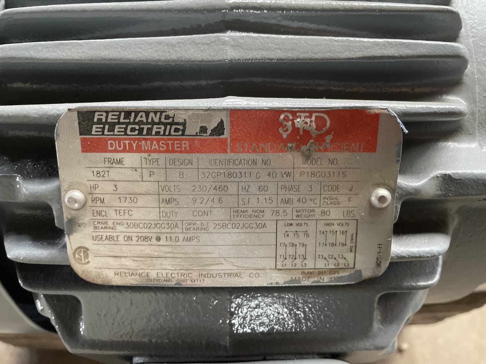 Motor Reliance P18G0311S (3 HP, 1730 RPM, 230/460 V) Número de serie: 32GP180311C40VW. 3 CV. RPM del motor: 1730. Voltaje del motor: 1730. Voltaje del motor: 230/460. Amperios del motor: 9,2/4,6. Hercios del motor (HZ): 60. Fases del motor: 3. Tamaño del bastidor del motor: 182T. Dimensiones de envío (pulgadas): 19x17x10. Peso (libras): 80