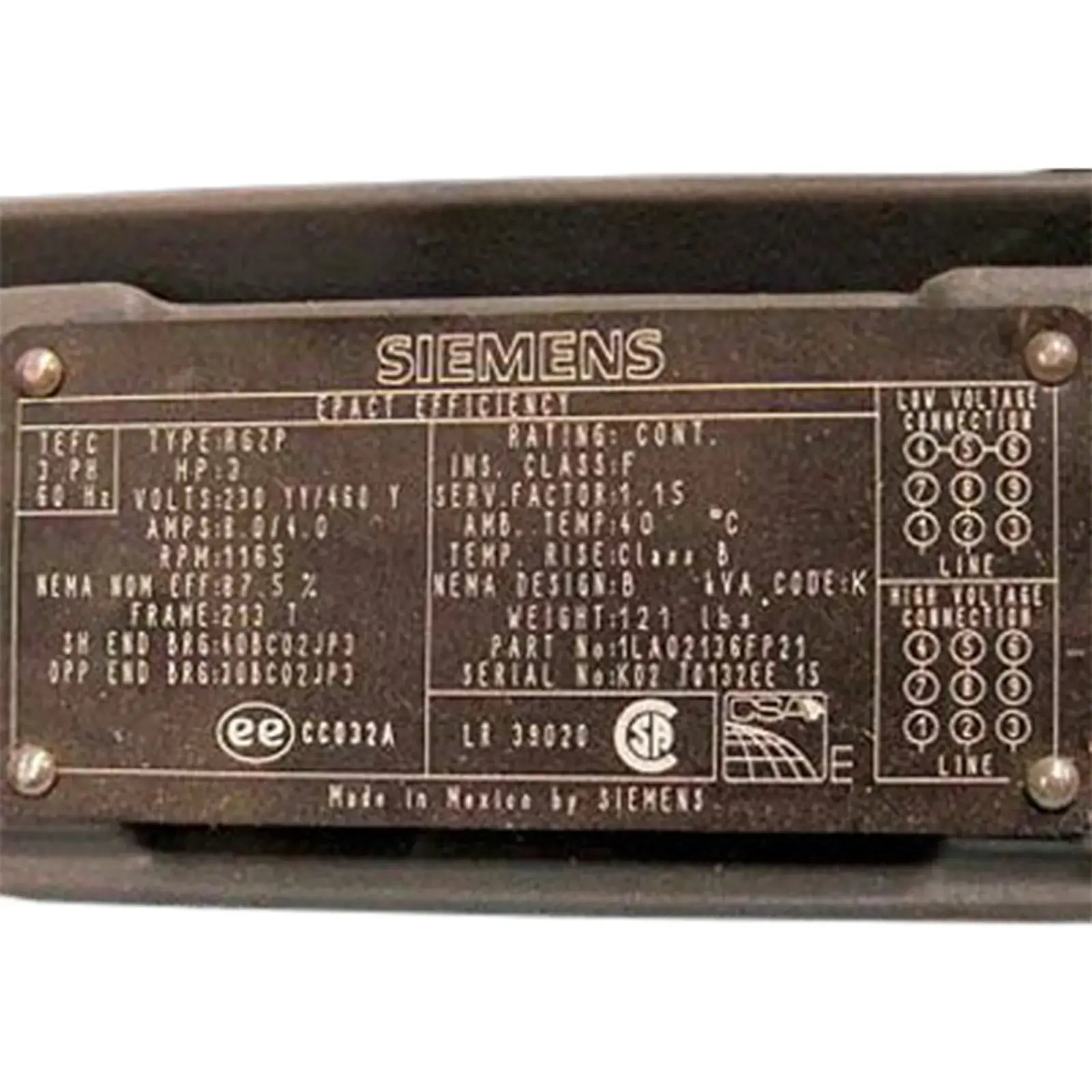Motor Siemens sin uso. 3HP TEFC trifásico 60Hz. Tipo: RGZP. CV: 3. Voltios: 230/460. Amperios: 8,0/4,0. RPM: 1165. Ef nom NEMA: 87,5%. Cuadro: 213T. En s. Clase: F. Factor de servicio: 1,15. Peso: 121 libras. Fabricado en México por Siemens.