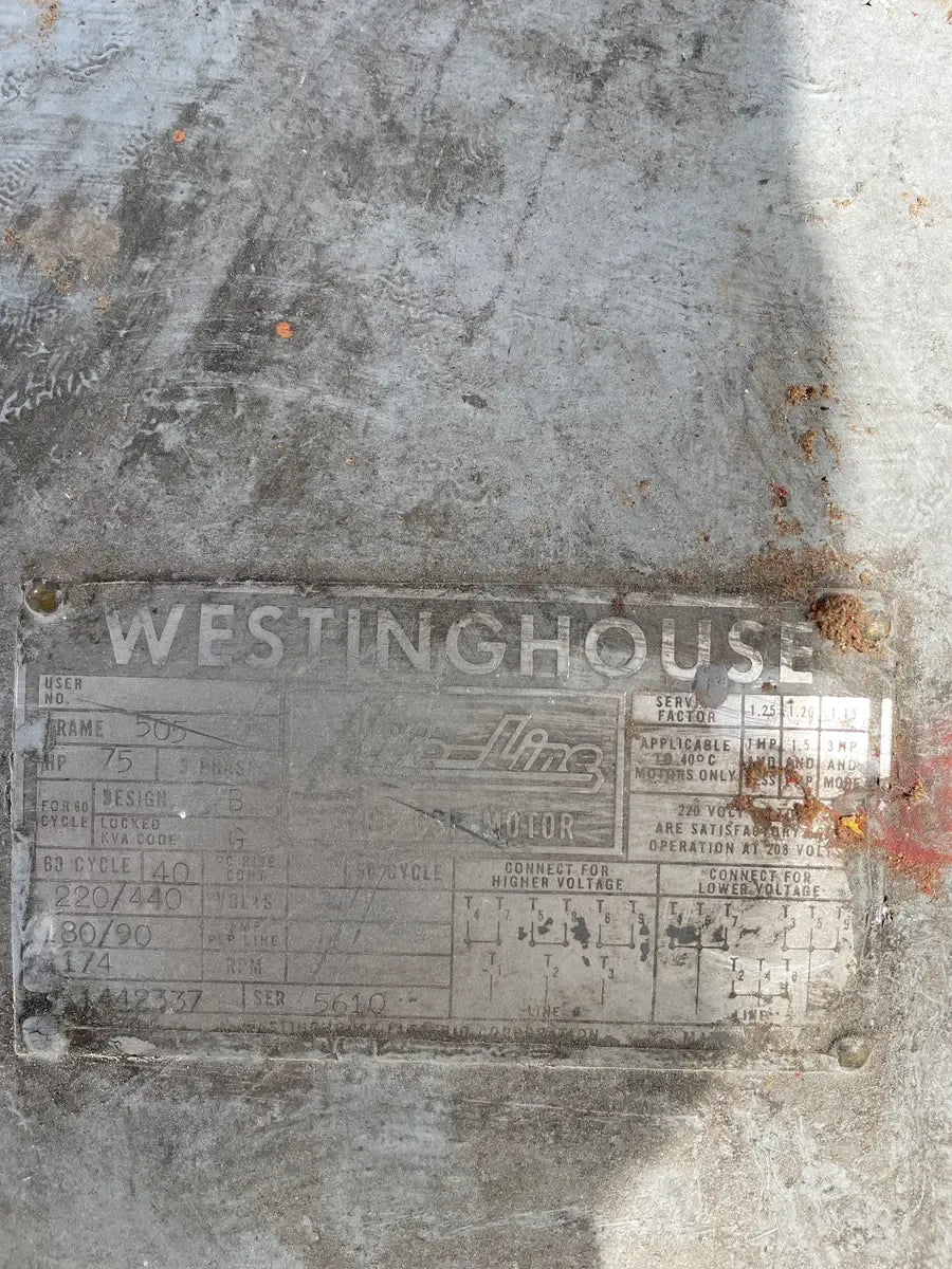 Motor Westinghouse CSP (75 HP, 1174 RPM, 220/440 V) Número de serie: 5610. 75 HP. RPM del motor: 1174. Voltaje del motor: 1174. Voltaje del motor: 220/440. Amperios del motor: 80/90. Hercios del motor (HZ): 60. Fases del motor: 3. Tamaño del bastidor del motor: 505. Dimensiones de envío (pulgadas): 48x18x22. Peso (libras): 740