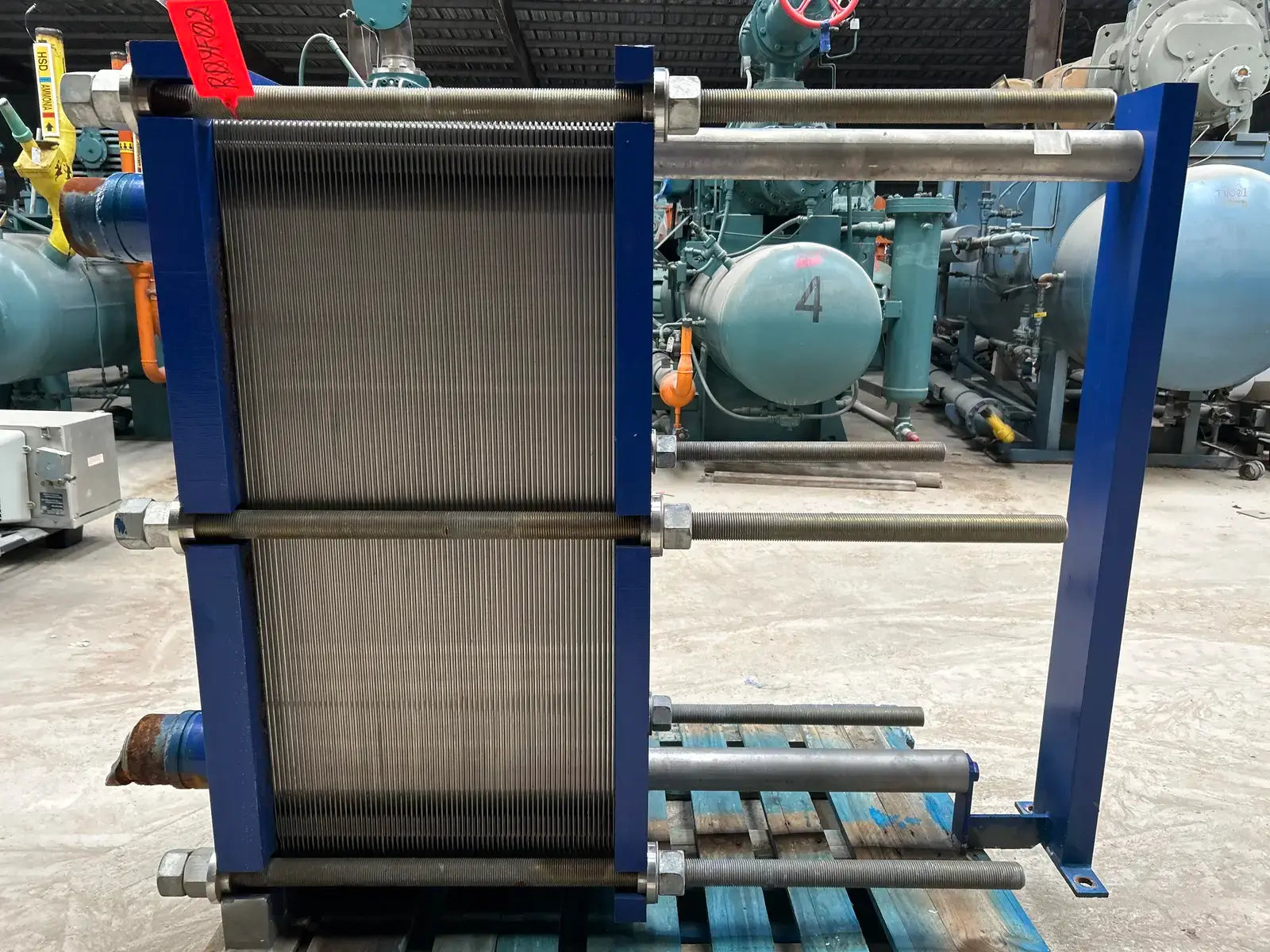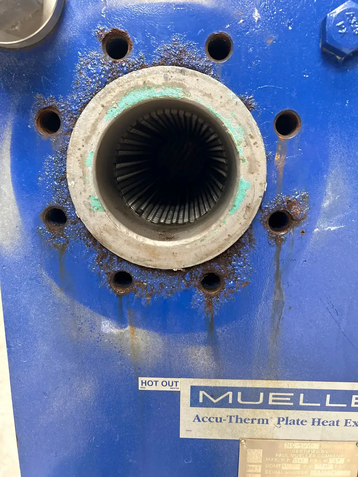 Intercambiador de calor de placas certificado por Paul Mueller Company. National Board: 46775. N.º de serie: 1002358. Modelo: AT25W. N.º de pieza: 9830236. Año de fabricación: 2010. MAWP: 250 PSI a 200 F. MDMT: -20 F a 250 PSI. Tamaño del puerto: