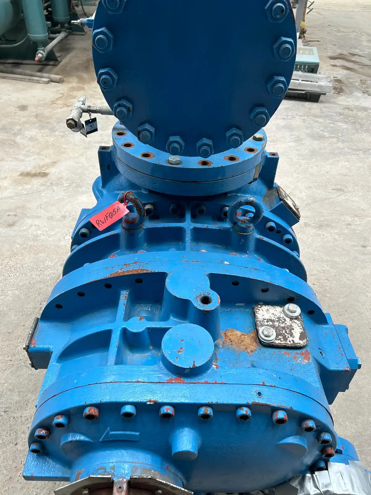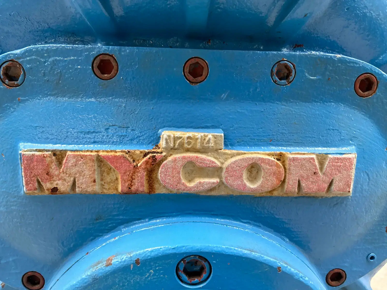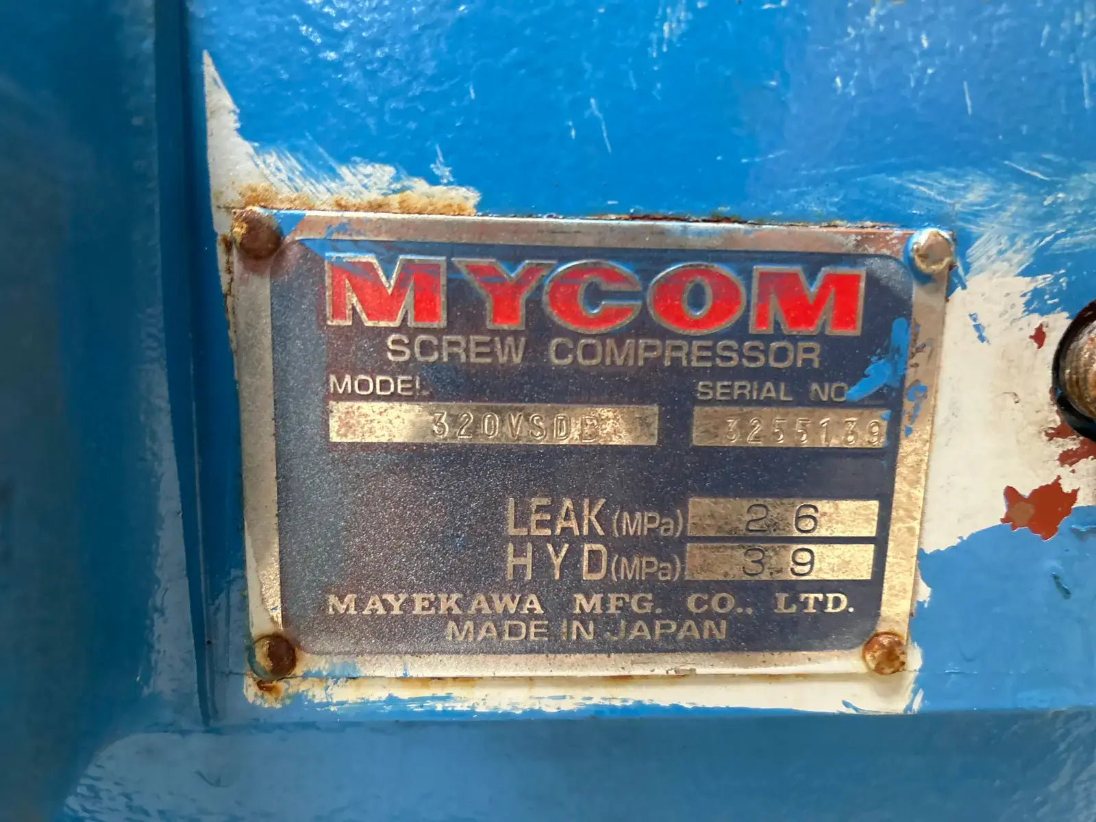 Compresor de tornillo rotativo Mycom. Modelo: 320VSDB. N.º de serie: 3255139. RPM máximas: 3600. Desplazamiento teórico a 60 Hz: 2802 CFM. FUGA (MPa): 2,6. HID (MPa): 3,9.