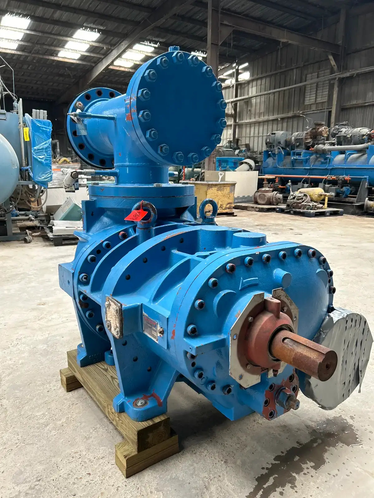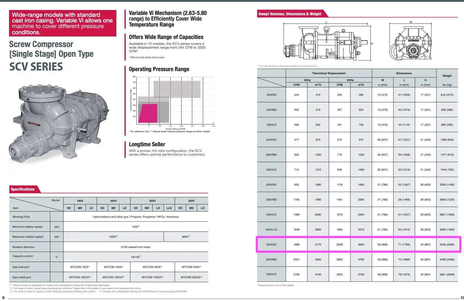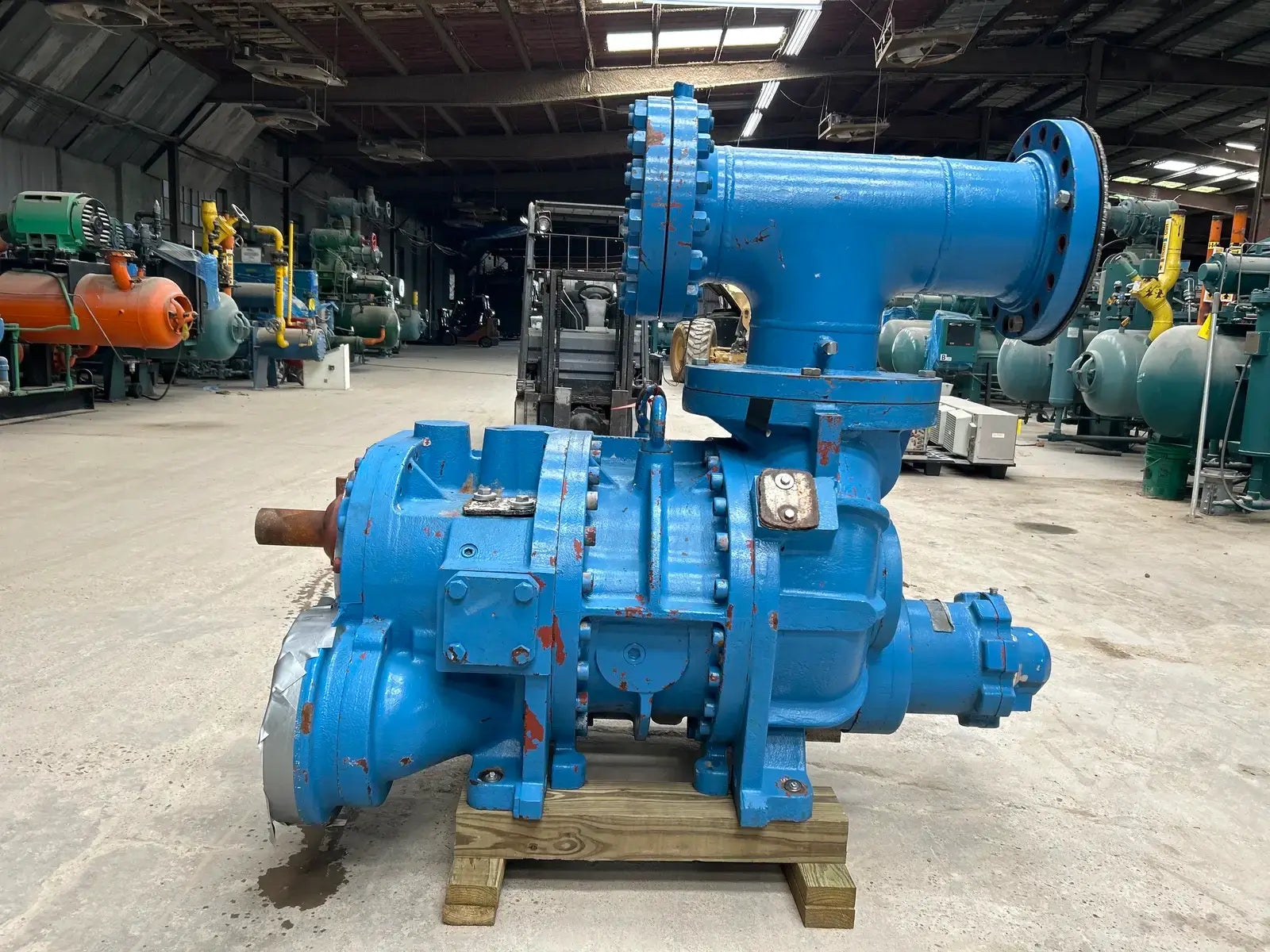 Compresor de tornillo rotativo Mycom. Modelo: 320VSDB. N.º de serie: 3255139. RPM máximas: 3600. Desplazamiento teórico a 60 Hz: 2802 CFM. FUGA (MPa): 2,6. HID (MPa): 3,9.