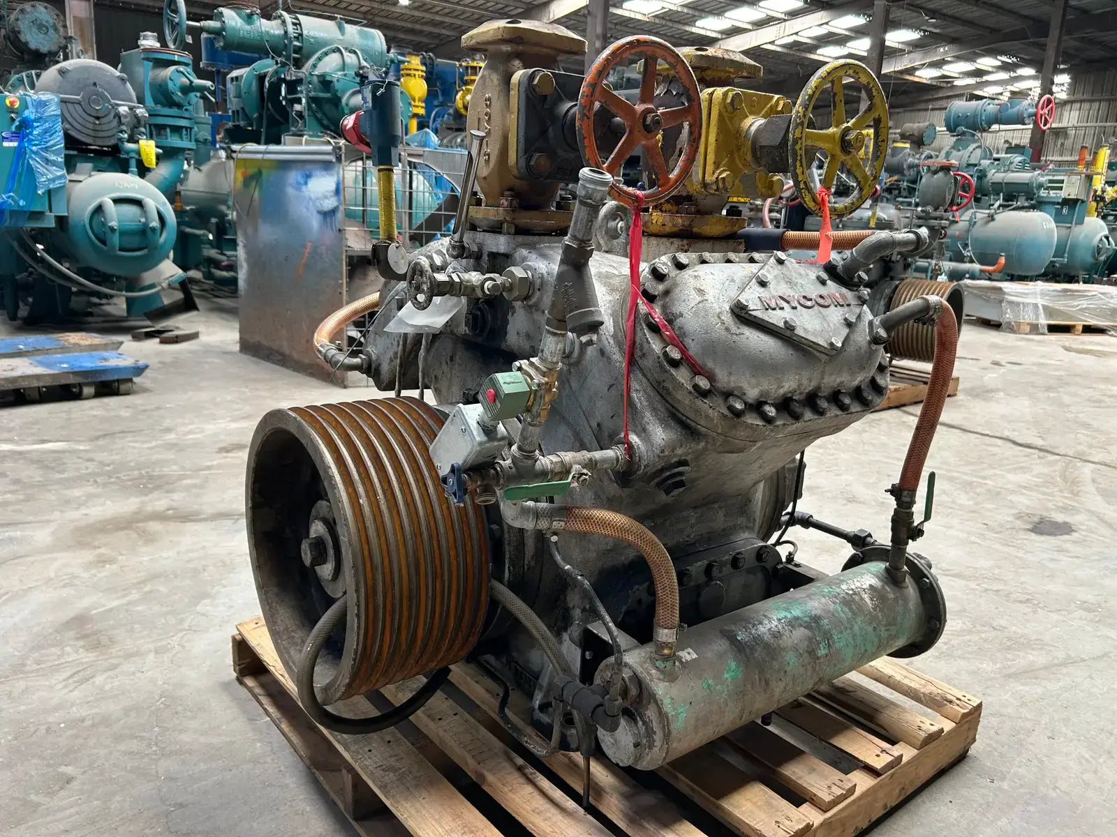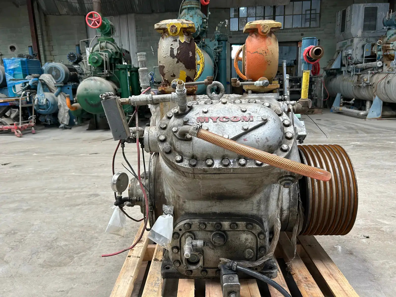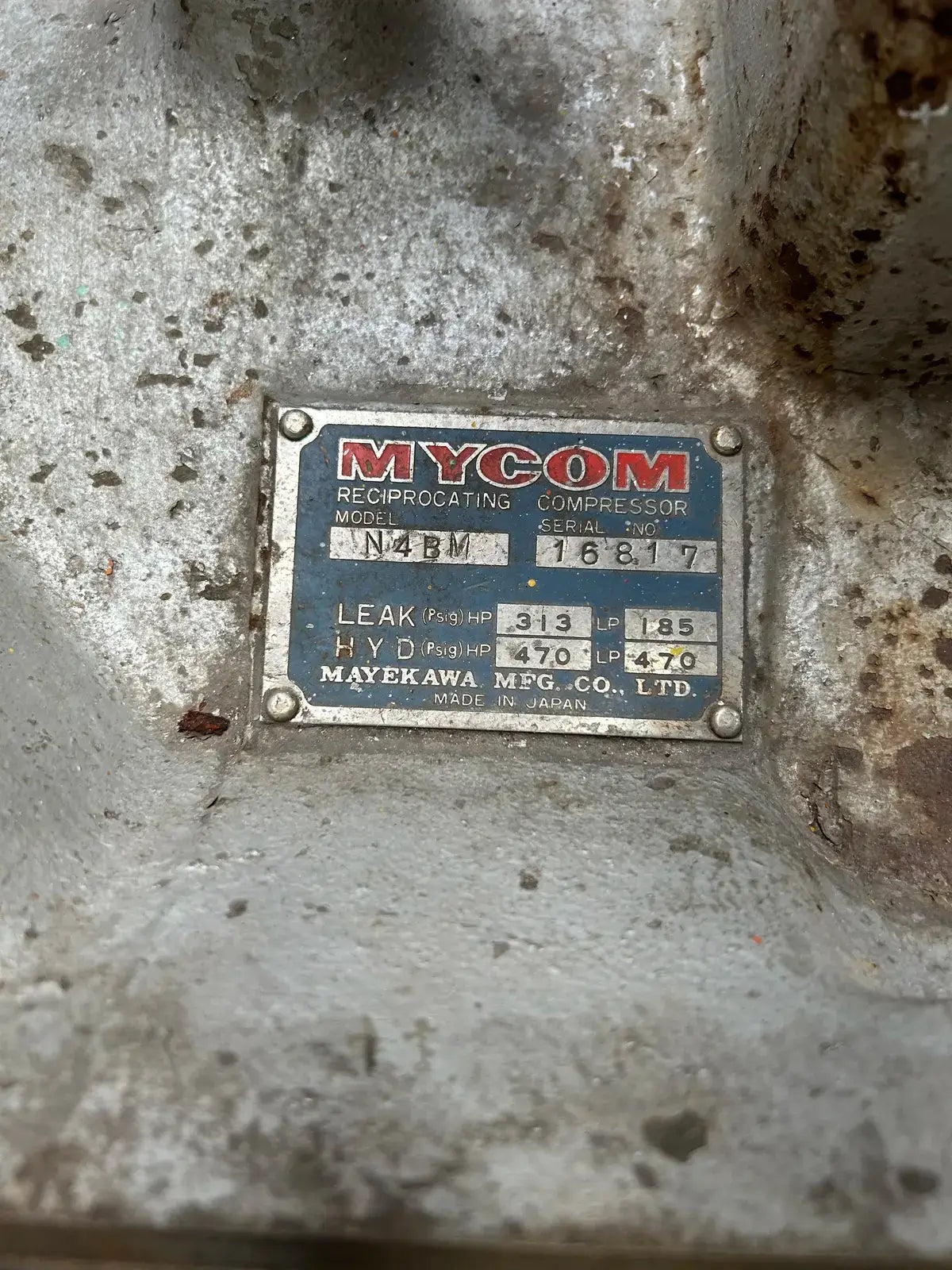Compresor alternativo Mycom de amoníaco accionado por correa. Modelo: N4BM. N.° de serie: 16817. Número de cilindros: 4. Presión de fuga (PSIG): 313 HP, Presión de gas licuado (LP): 185. Presión de agua (PSIG): 470 HP, Presión de gas licuado (LP): 470.