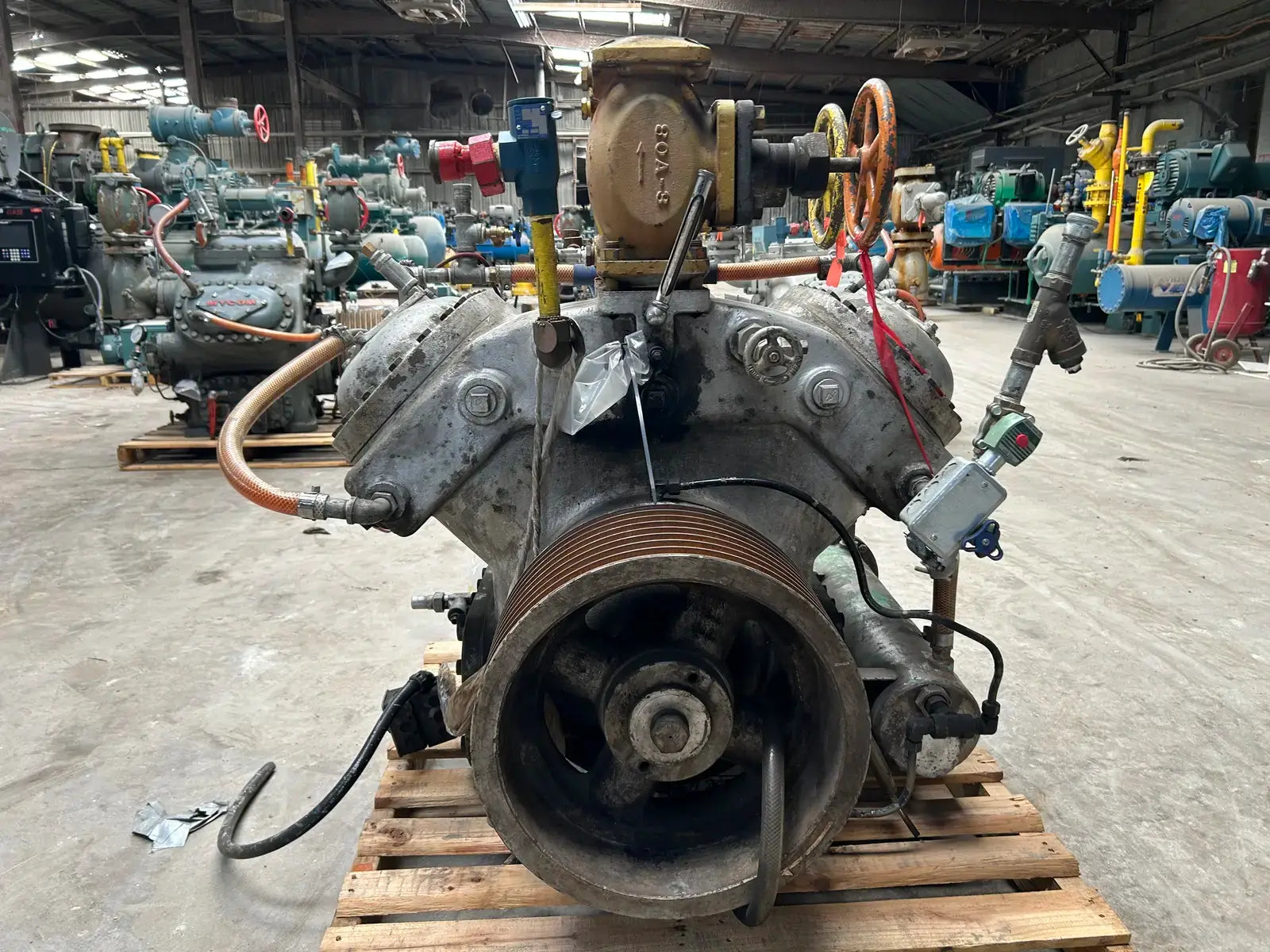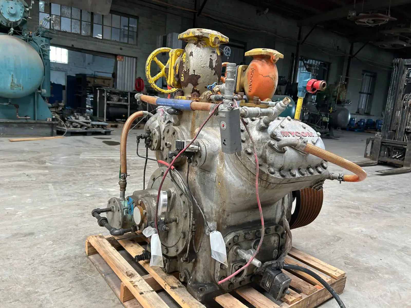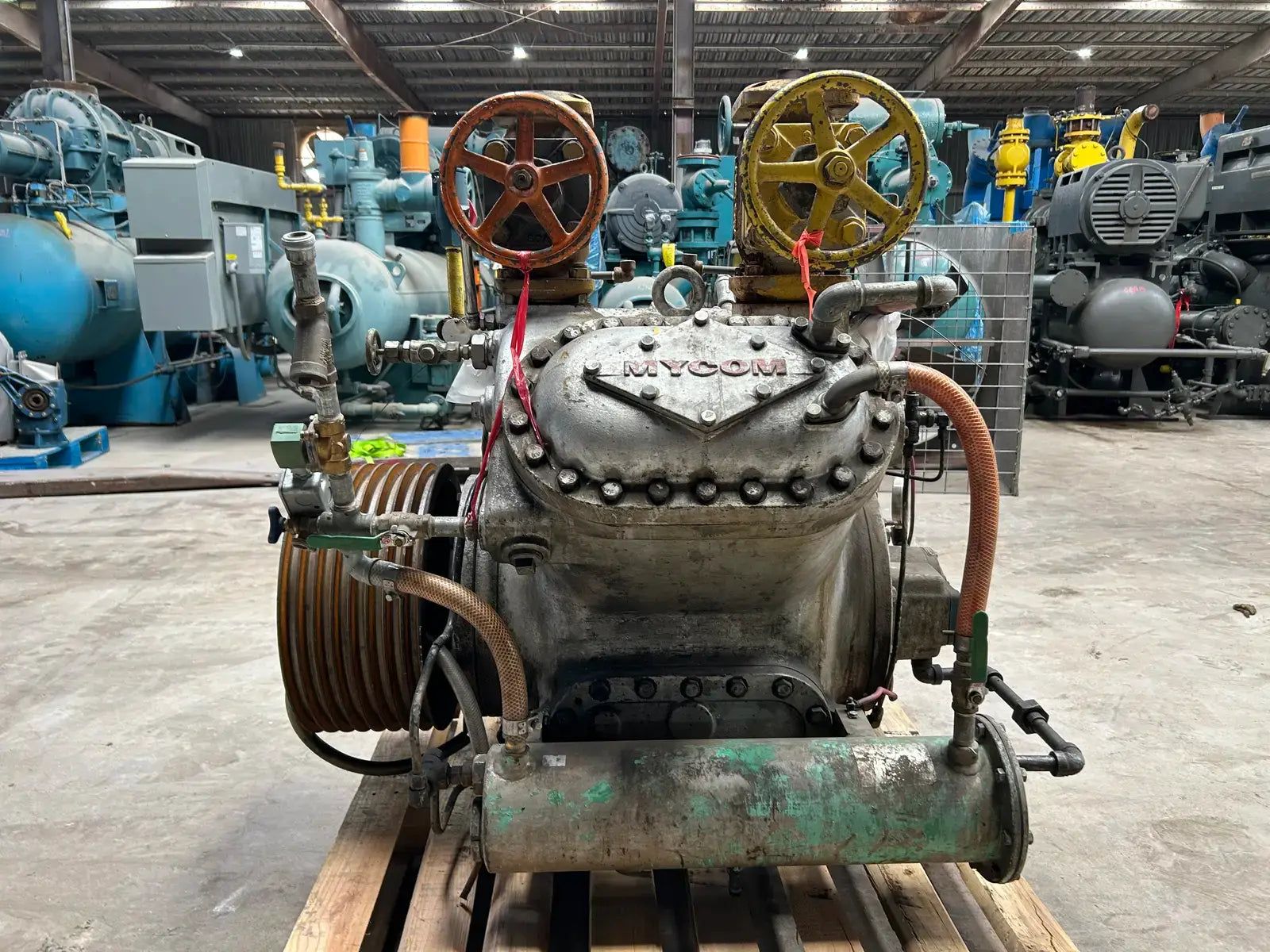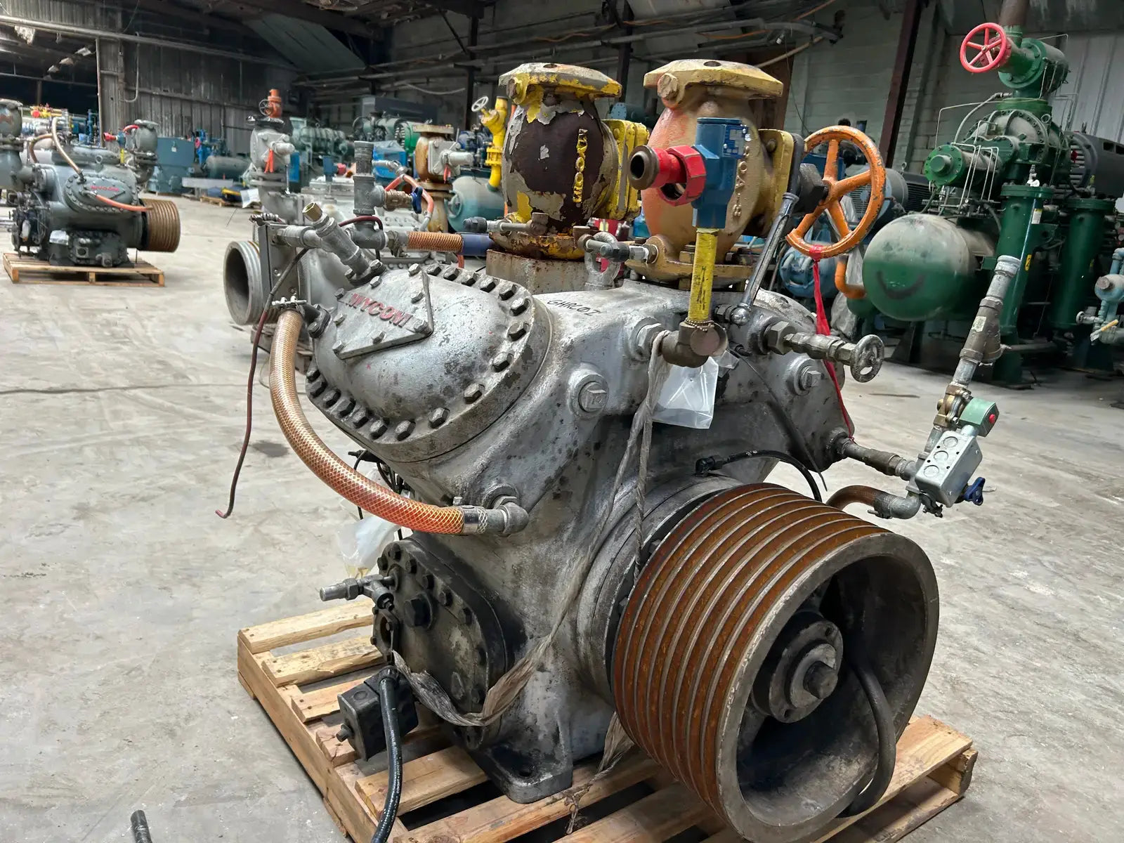 Compresor alternativo Mycom de amoníaco accionado por correa. Modelo: N4BM. N.° de serie: 16817. Número de cilindros: 4. Presión de fuga (PSIG): 313 HP, Presión de gas licuado (LP): 185. Presión de agua (PSIG): 470 HP, Presión de gas licuado (LP): 470.