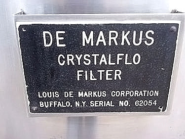 Filtro Crystalflo de acero inoxidable Louis De Markus, 50 galones. S/N: 62054. Fabricado en Buffalo, NY Dimensiones interiores: 23-3/4 pulgadas de diámetro. x 28 pulg. H. Entradas: (1) 3 pulg. Puerto de brida ANSI de 150 lb. Salidas: (1) 3 pulg. de diámetro. puerto. Dimensiones totales: 31 pulgadas de diámetro. x 54 pulgadas de alto.