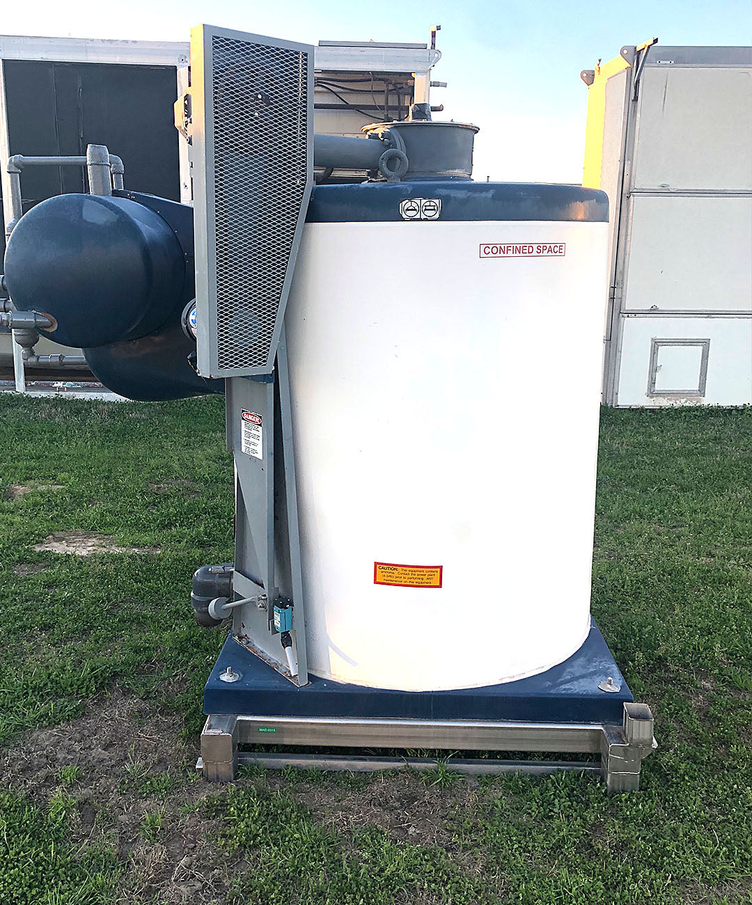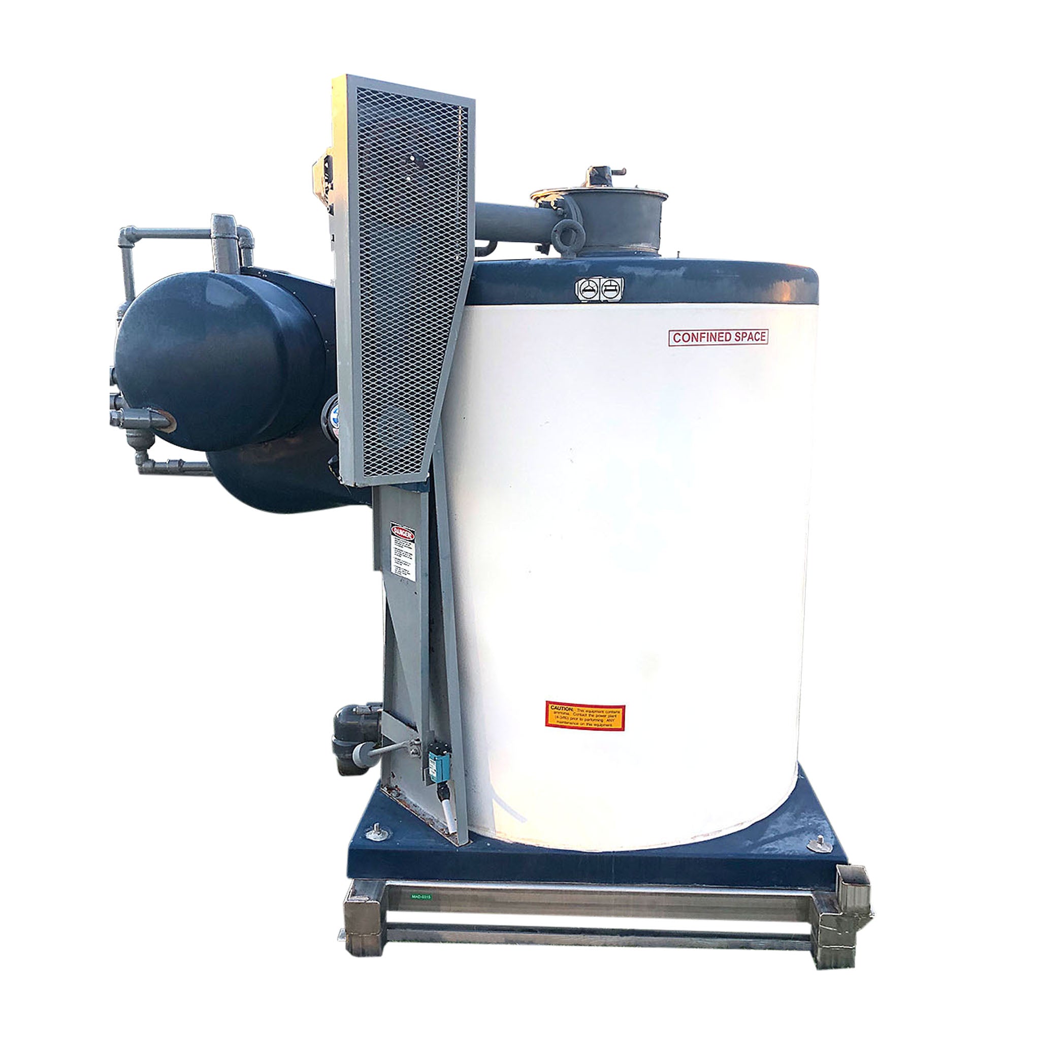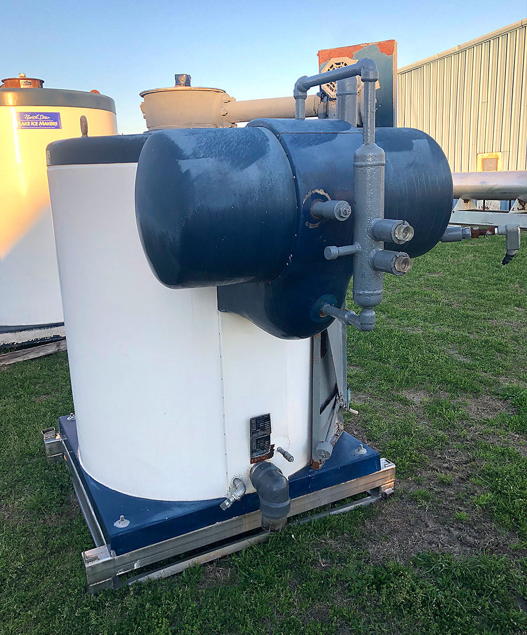 Máquina de hielo en escamas North Star Ice M40 SS LMG-95 (refrigeración con amoníaco, 22,6 toneladas por día) Superficie de congelación de acero inoxidable y soporte estructural de acero inoxidable. N.º de serie 0308. Dimensiones generales con soporte estructural y modificación de tuberías: 96 largo x 66 ancho x 82 alto. Peso 4800 libras.