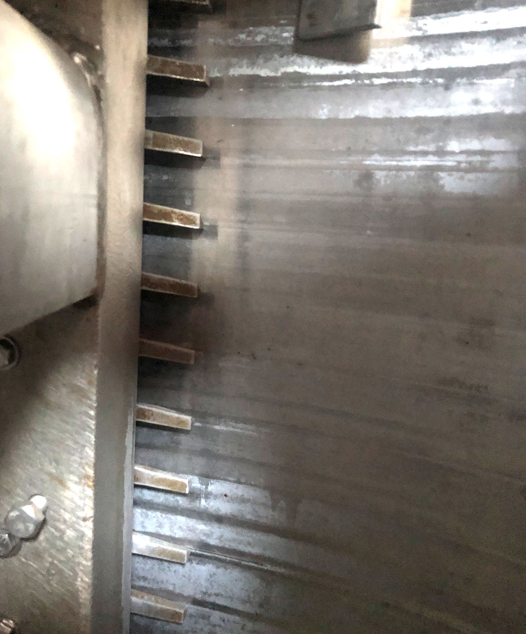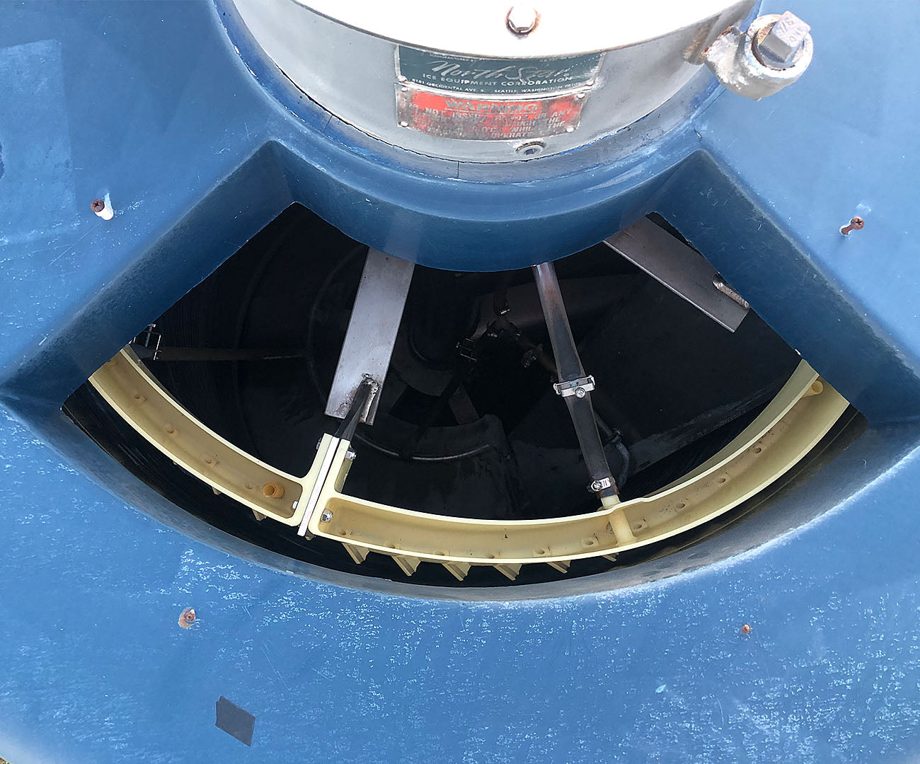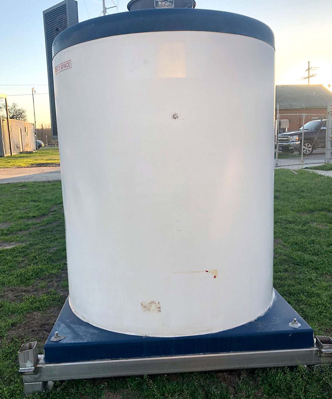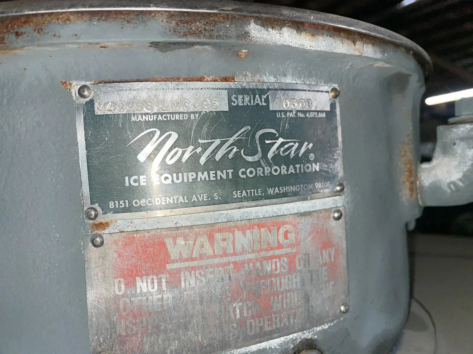 Máquina de hielo en escamas North Star Ice M40 SS LMG-95 (refrigeración con amoníaco, 22,6 toneladas por día) Superficie de congelación de acero inoxidable y soporte estructural de acero inoxidable. N.º de serie 0308. Dimensiones generales con soporte estructural y modificación de tuberías: 96 largo x 66 ancho x 82 alto. Peso 4800 libras.