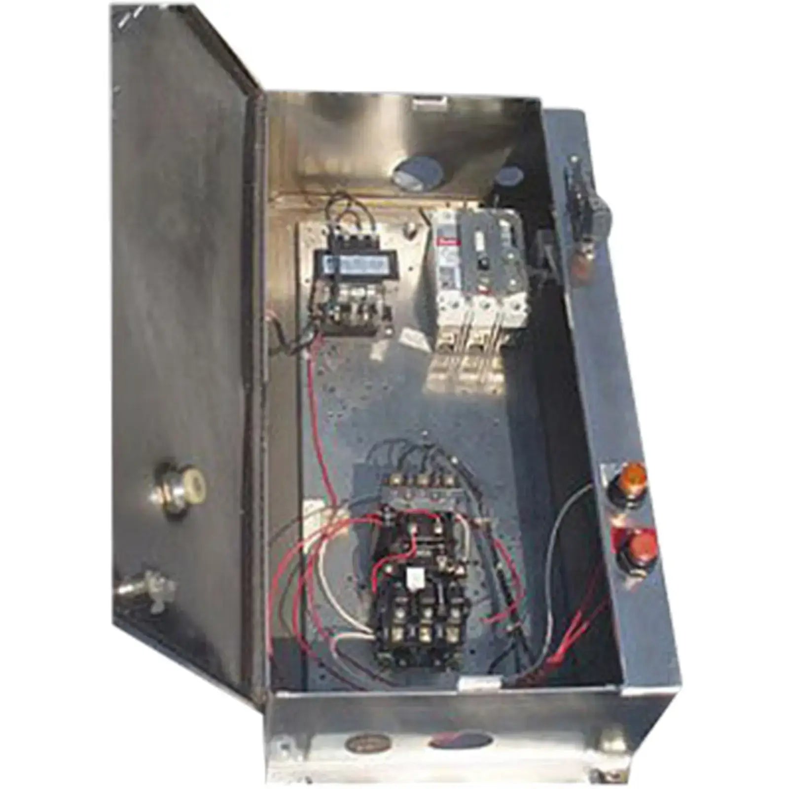 Panel de control Cutler-Hammer. Árbitro. Número: A40EWA0. Protector de circuito de motor Cutler-Hammer, cat. No: HMCPO30H1, fuente de alimentación: 600 VAC/250 VDC, 30 amperios. Transformador Acme de 150 VA, n.º de tipo: TA-2-81212, 50/60 Hz. Contactor Allen-Bradley. Número de gato: 509BOD. Dimensiones totales: 1 pie 3 pulgadas de largo x 10 pulgadas de ancho x 2 pies 7 pulgadas de alto.