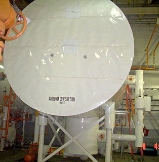 Paquete acumulador de amoníaco RVS. Tanque recirculador RVS: dimensiones: 9 pies de diámetro. x 19 pies 10 pulgadas de largo. Dimensiones interiores de pared recta: 8 pies 4 pulgadas de diámetro. x 15 pies L. MAWP original: 150 psi @ -20°F a 300°F. MDMT: 60 psi a -40°F. Recertificado por Fru-Con en 2004 con MAWP: 60 psi a -60 °F. Tanque acumulador de válvulas y sistemas de refrigerante: dimensiones de pared recta: 2 pies 7 pulgadas de diámetro. x 5 pies 8 pulgadas L. MAWP: 250 psi a 300 °F. MDMT: -20 °F a 250 psi. Recertificado por Fru-Con Construction Corp: MAWP: 100 psi a -60°F. Regulador de presión de Refrigerating Specialties Inc.: tipo A2BK, recipiente de aceite Henry Technologies - 10 galones. Modelo: RA-10034-600. Dimensiones interiores de pared recta: 10 pulg. de diámetro. x 2 pies 6 pulgadas L. MAWP: 300 psi a 300 °F. MDMT: -55/-60 °F a 300/100 psi. Dimensiones totales: 20 pies de largo x 8 pies 4 pulgadas de ancho x 17 pies de alto.