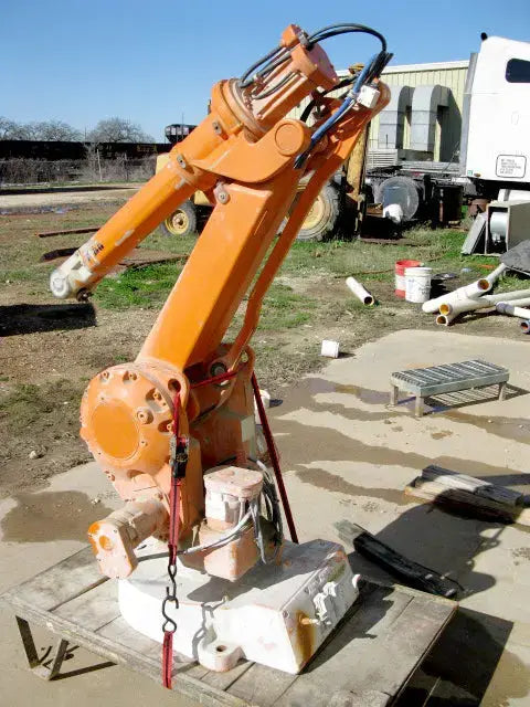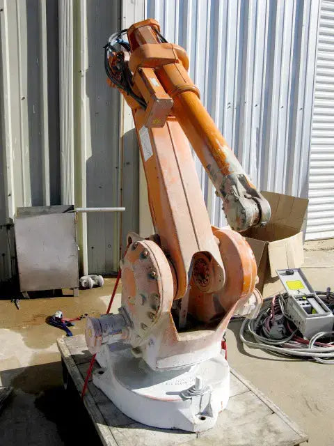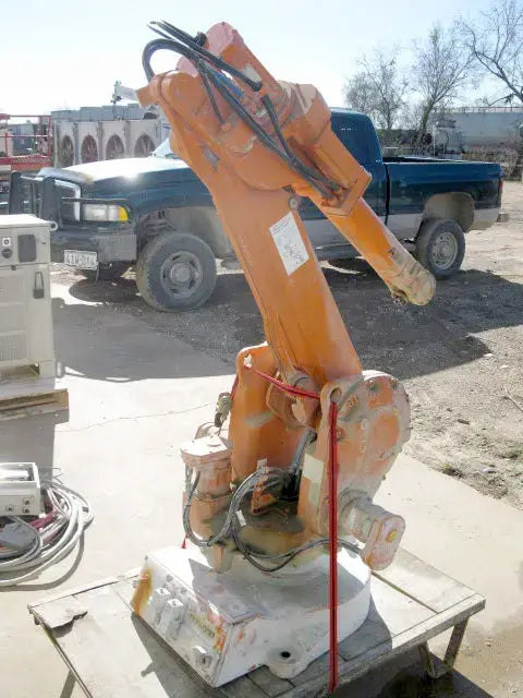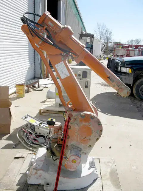 Paquete de brazo robótico industrial de la serie IRB 2400 de ABB Robotics. Modelo de robot: IRB 2400FL. Modelo de controlador: IRB2400 M98A. Carga útil máxima aproximada: 15 libras. Al tener un diseño de estructura abierta, este brazo robótico se adapta fácilmente para un uso flexible que opera en 6 ejes y presenta una opción de alcance extendido de brazo largo (5 pies 10 pulgadas). También es adecuado para trabajar en entornos hostiles (fundición). Las aplicaciones incluyen: soldadura por arco, corte, rectificado y manipulación de materiales. Las actualizaciones funcionales también están disponibles al igual que los programas de software variables de Industriess y las opciones de cambio de herramientas son ilimitadas con los accesorios aplicables. Dimensiones generales del controlador: 3 pies de largo x 2 pies 1 pulgada de ancho x 3 pies 2 pulgadas de alto. Dimensiones generales del robot: 3 pies 3 pulgadas de largo x 3 pies de ancho x 5 pies 5 pulgadas de alto. (ACN480).