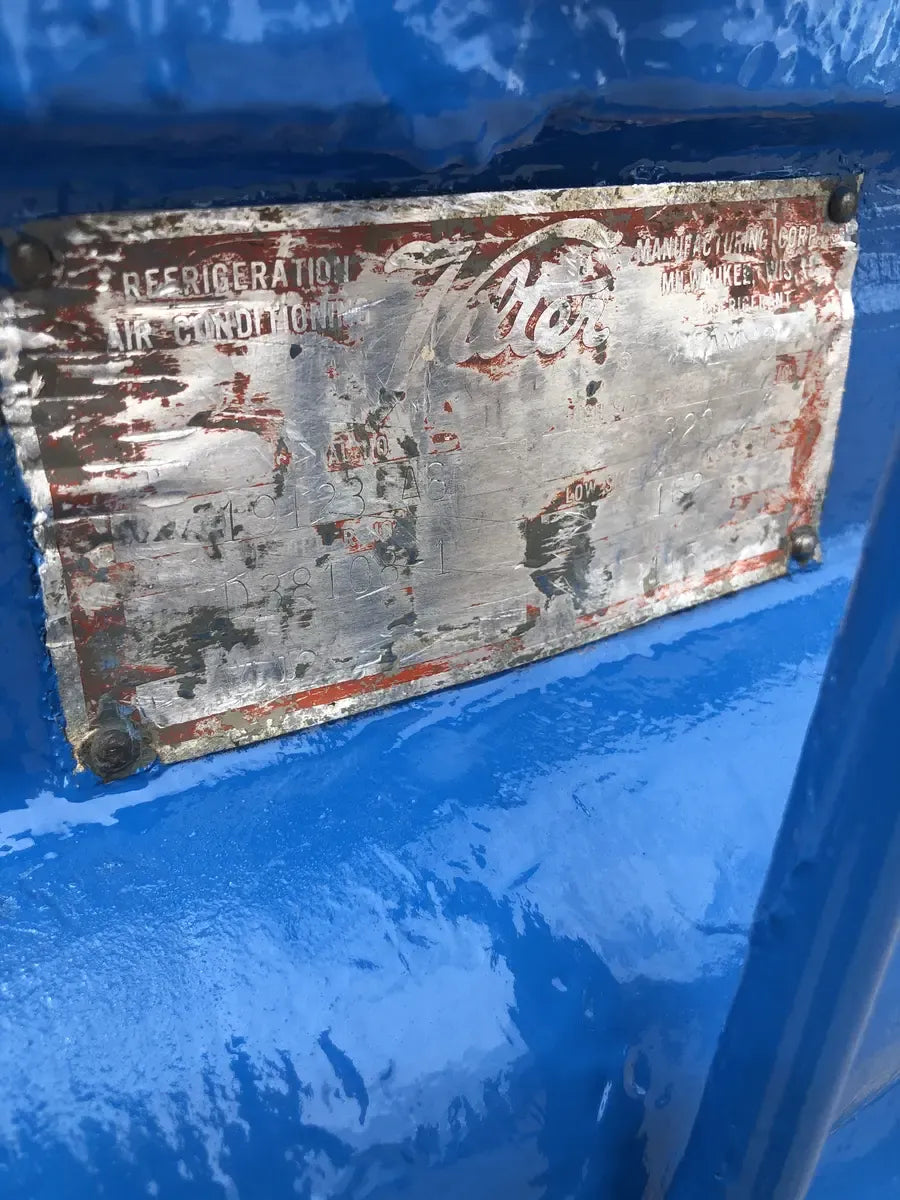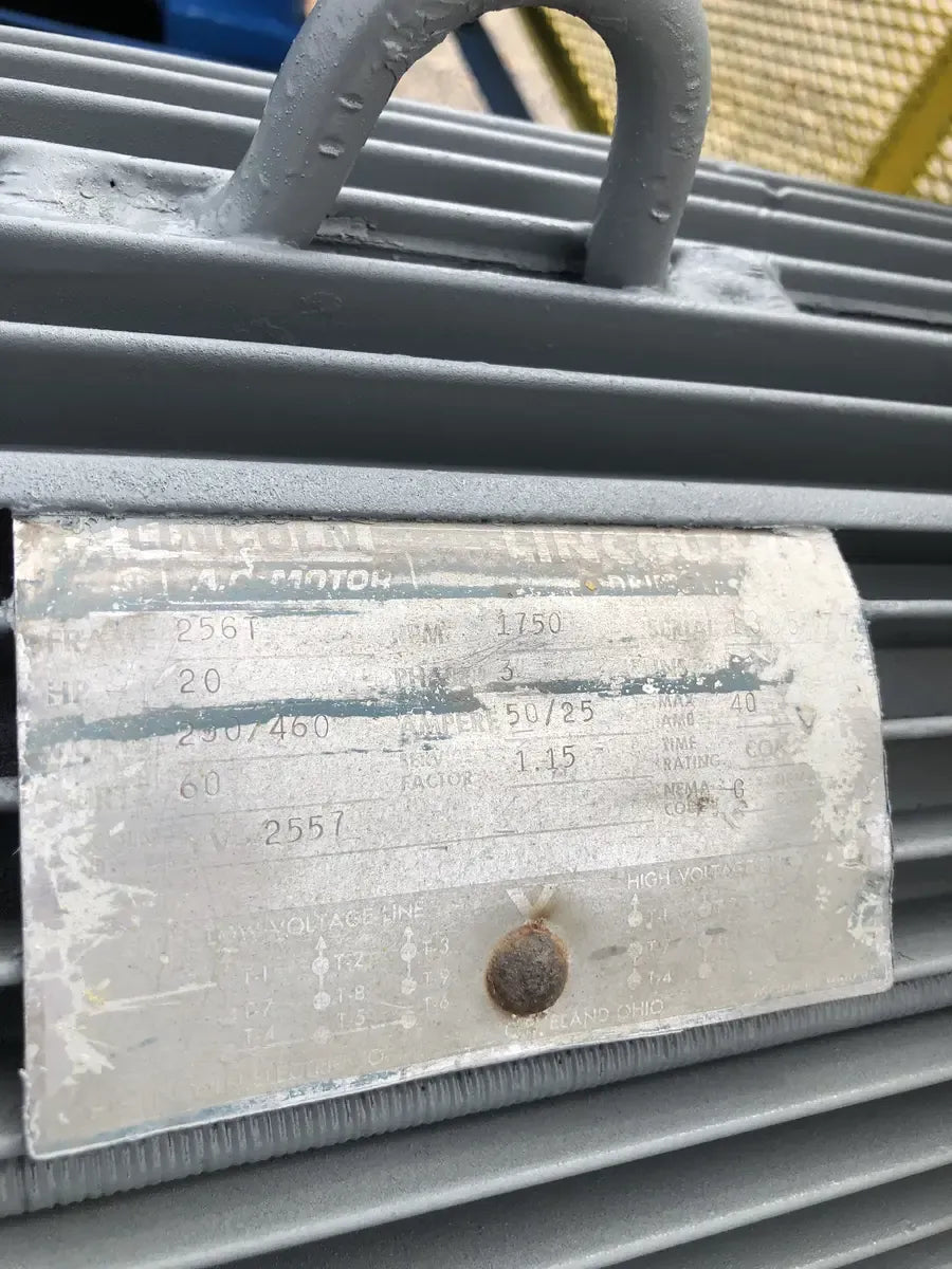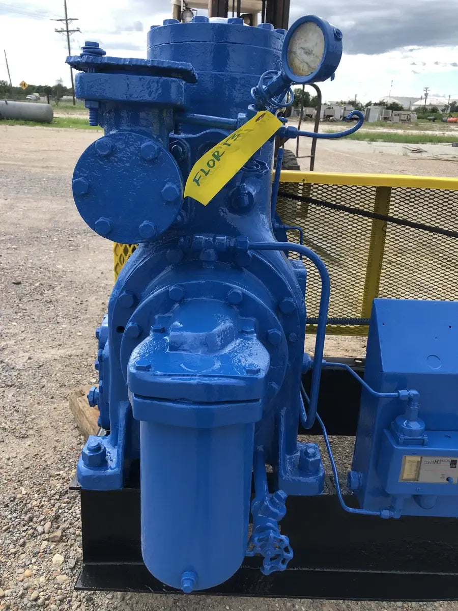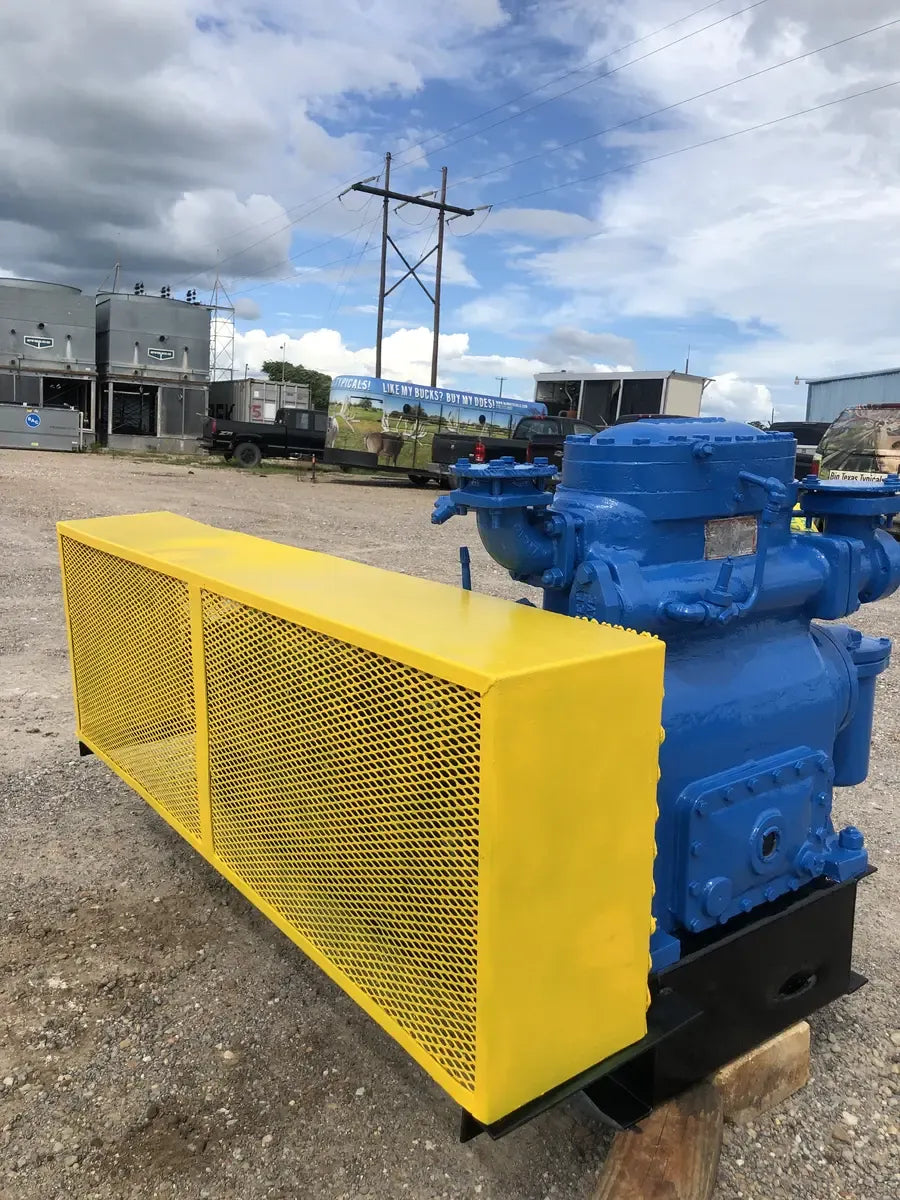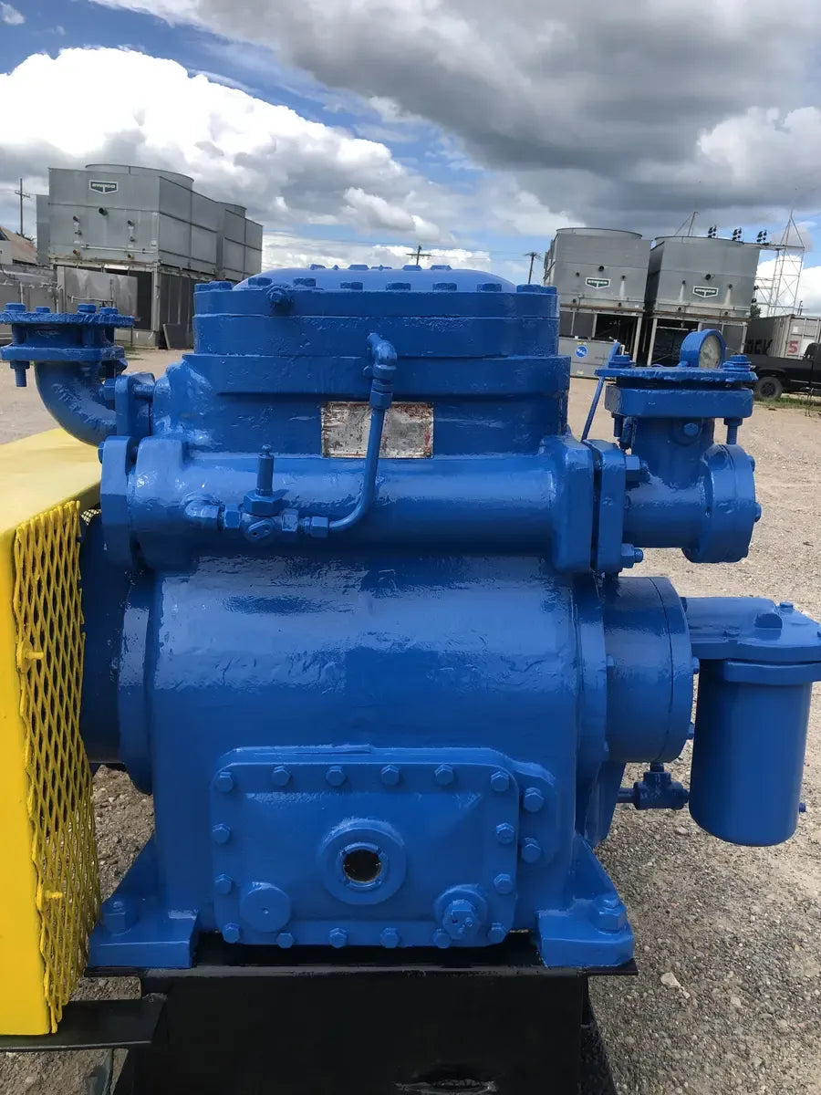 Compresor alternativo Vilter 442 de 2 cilindros con transmisión por correa. Número de serie: 19123 AS, Número de pedido: D38108-1, Tamaño: 442. Presión de diseño del lado alto (PSIG 320) Diseño del lado bajo (PSIG 162) Voltaje: 115. Motor Lincoln: Estructura: 256T, Rpm: 1750, Ph: 3 , AMP: 50/25, HP: 20, Voltios: 230/460, Hertz: 60, Tv: 2557, Factor de servicio: 1.15, Serie: 1335977, Clasificación máxima: Cont. Código NEMA: G. Restaurado con pintura nueva