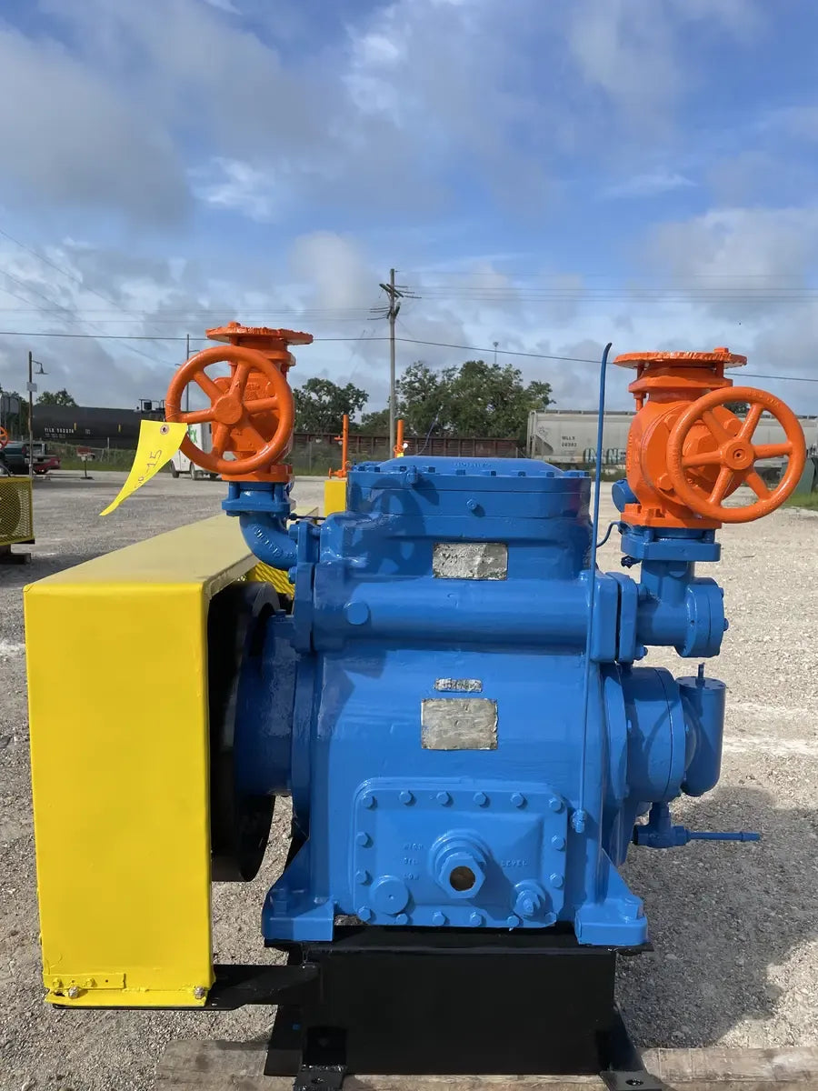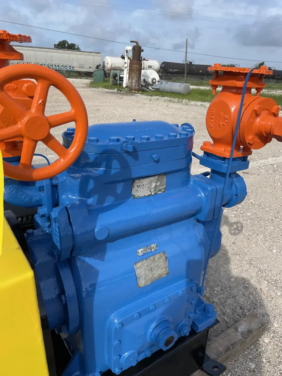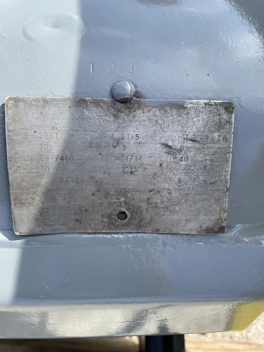 Compresor alternativo de 2 cilindros Vilter 442. Tamaño: 442. La placa de datos no se puede leer. Número de cilindros: 2. El compresor ha sido recién pintado. Motor eléctrico Lincoln - FR: 286T, RPM: 1765, Serie: 1656176, HP: 30, PH: 3, Voltios: 230/460, AMPS: 74/37, Hz: 60, Factor de servicio: 1,15.