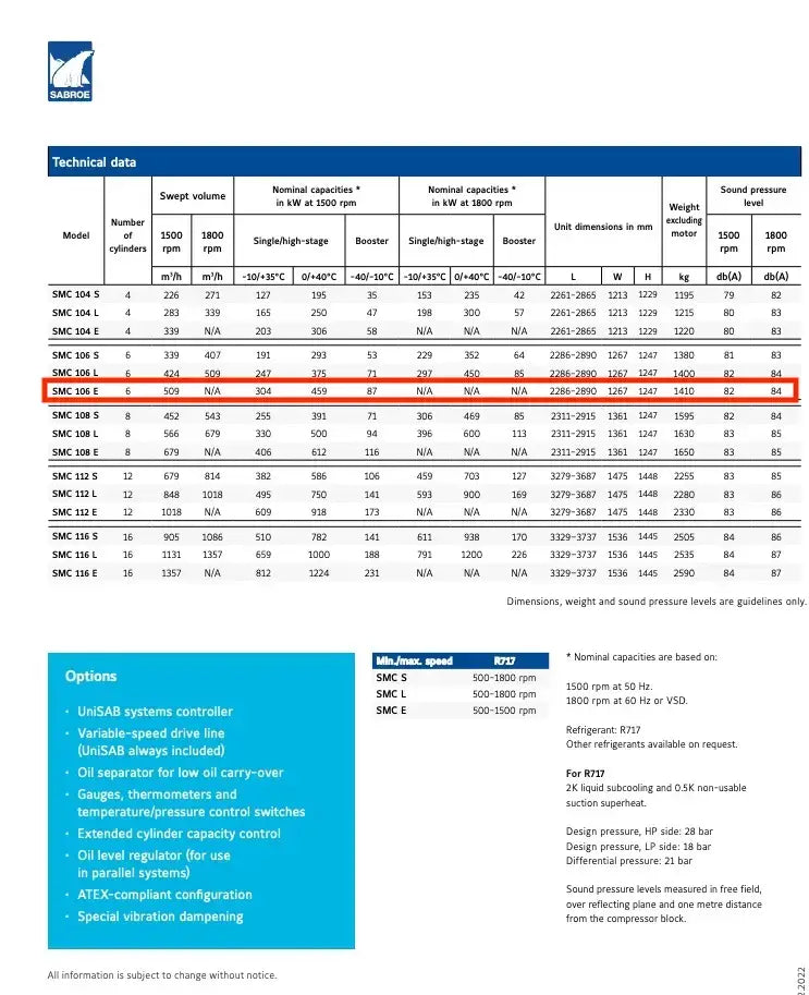 Paquete de compresor alternativo Sabroe SMC-106E de 6 cilindros (75 HP, 208-230/460 V)