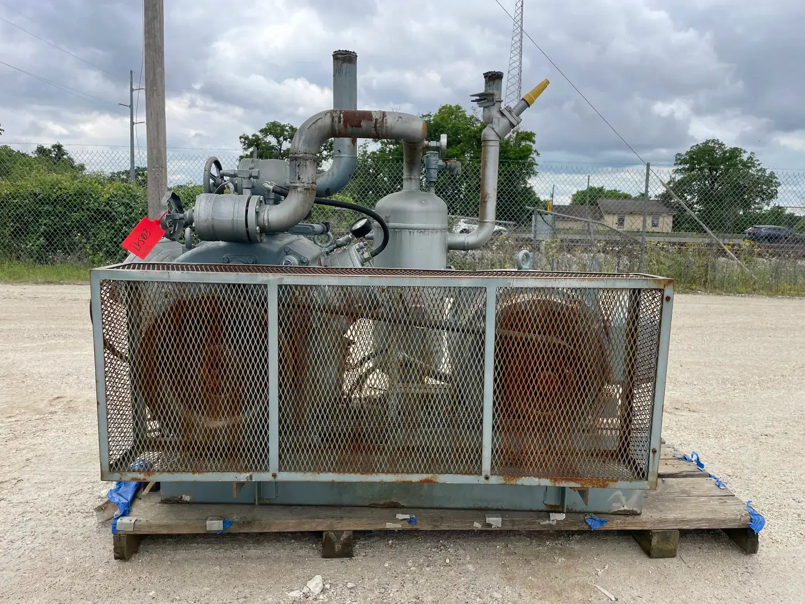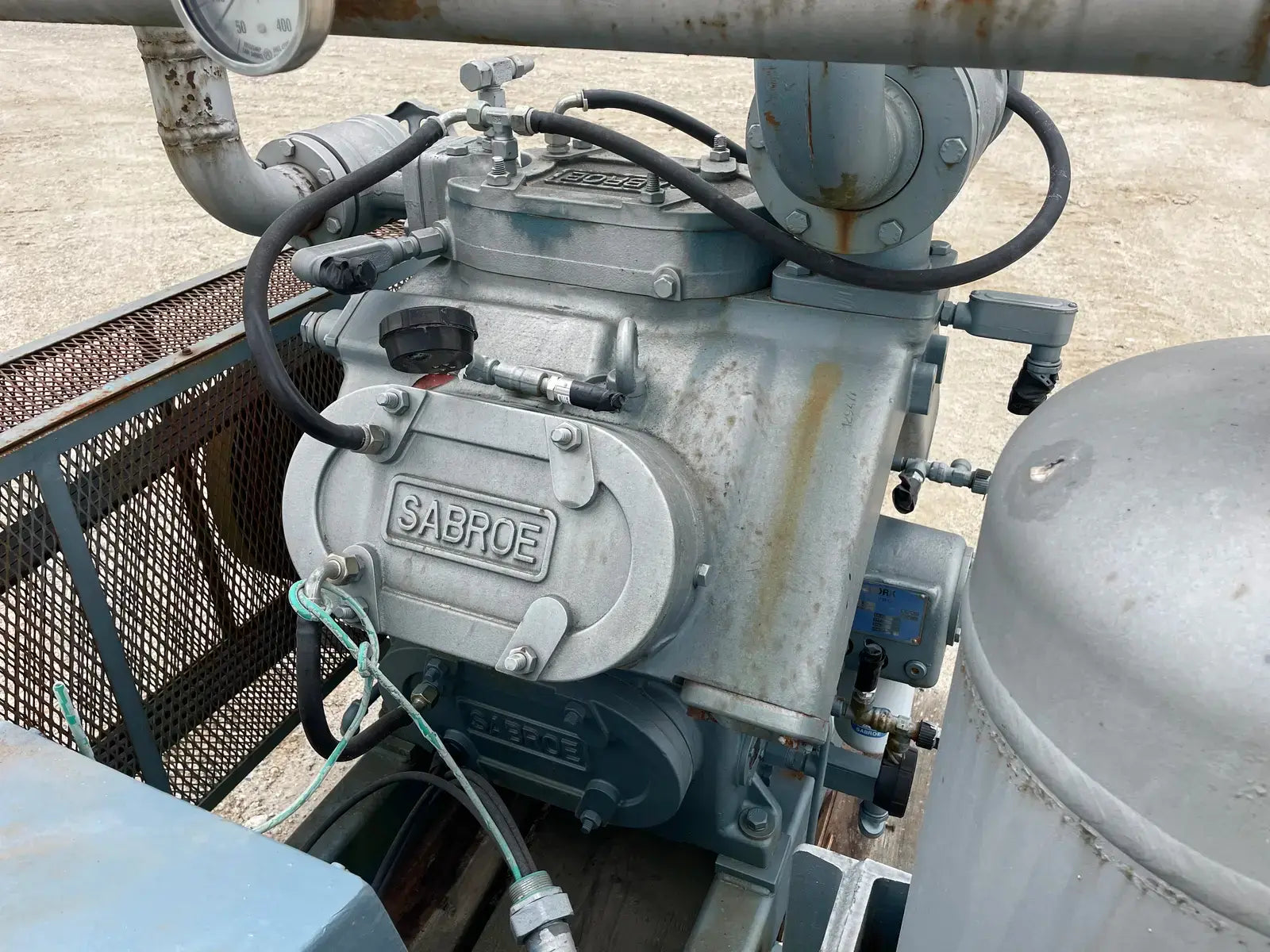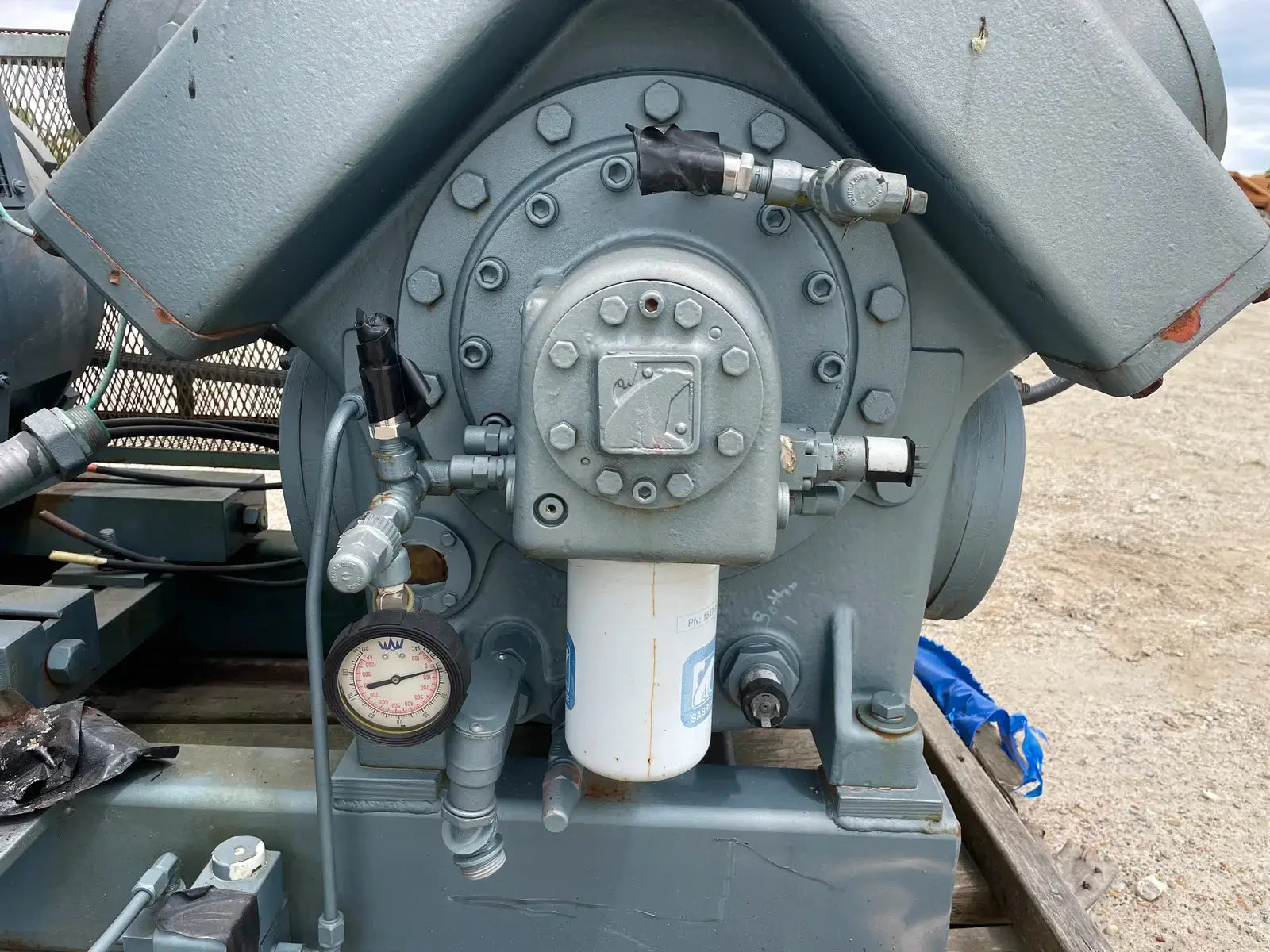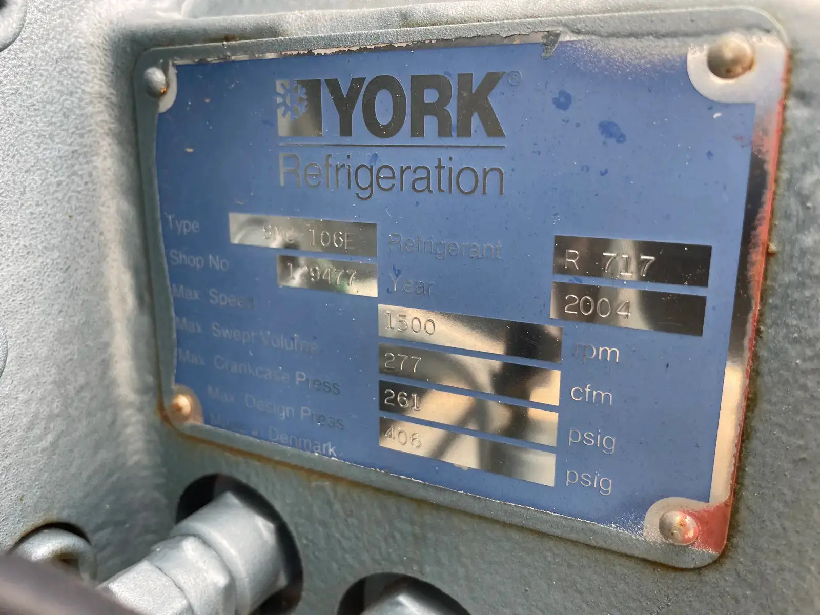 Paquete de compresor alternativo Sabroe/York. Modelo: SMC 106E, Número de serie: 129477. Refrigerante: R717. Año de fabricación: 2004. Velocidad máxima: 1500 RPM, volumen máximo de barrido: 277 CFM. Presión máxima del cárter: 261 PSIG. Presión máxima de diseño: 406 PSIG. Número de cilindros: 6. Motor eléctrico Marathon: HP: 75, Voltios: 208-230/460, RPM: 1790, HZ: 60, PH: 3.