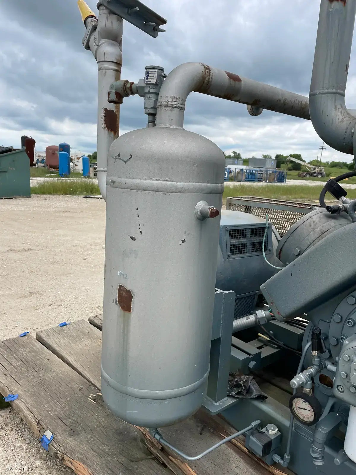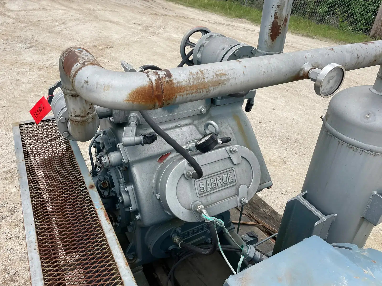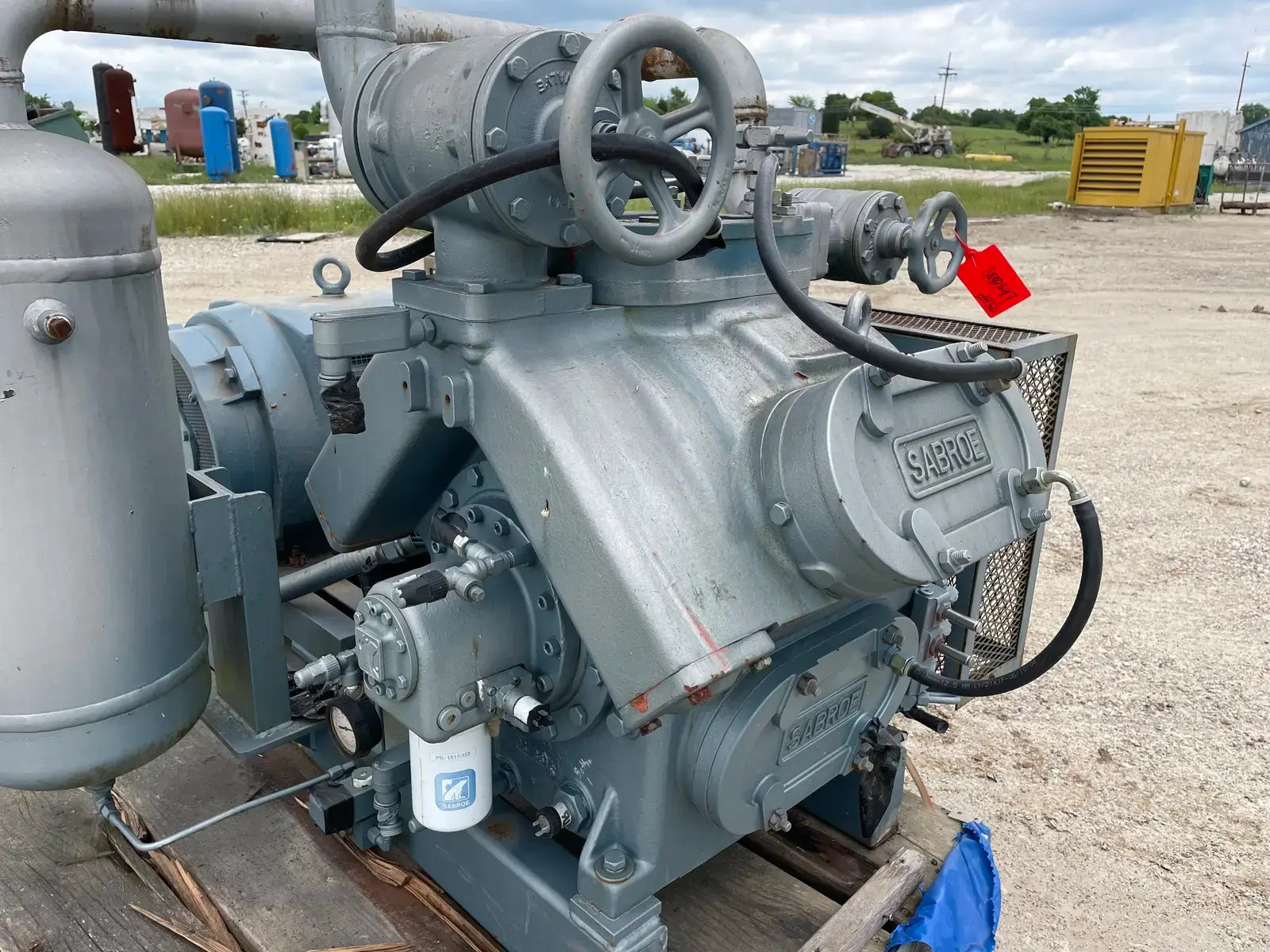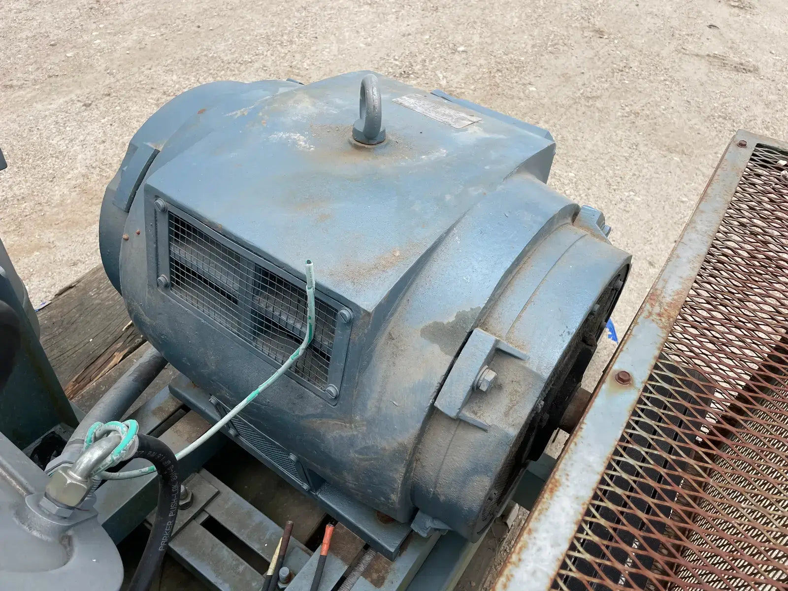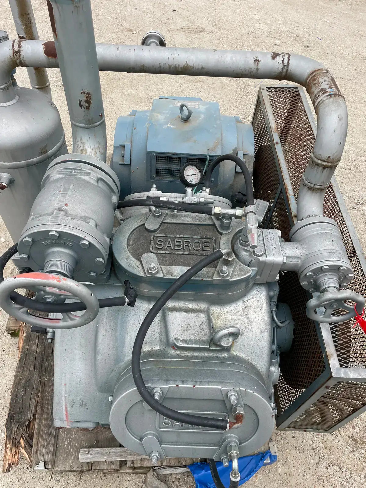 Paquete de compresor alternativo Sabroe/York. Modelo: SMC 106E, Número de serie: 129477. Refrigerante: R717. Año de fabricación: 2004. Velocidad máxima: 1500 RPM, volumen máximo de barrido: 277 CFM. Presión máxima del cárter: 261 PSIG. Presión máxima de diseño: 406 PSIG. Número de cilindros: 6. Motor eléctrico Marathon: HP: 75, Voltios: 208-230/460, RPM: 1790, HZ: 60, PH: 3.