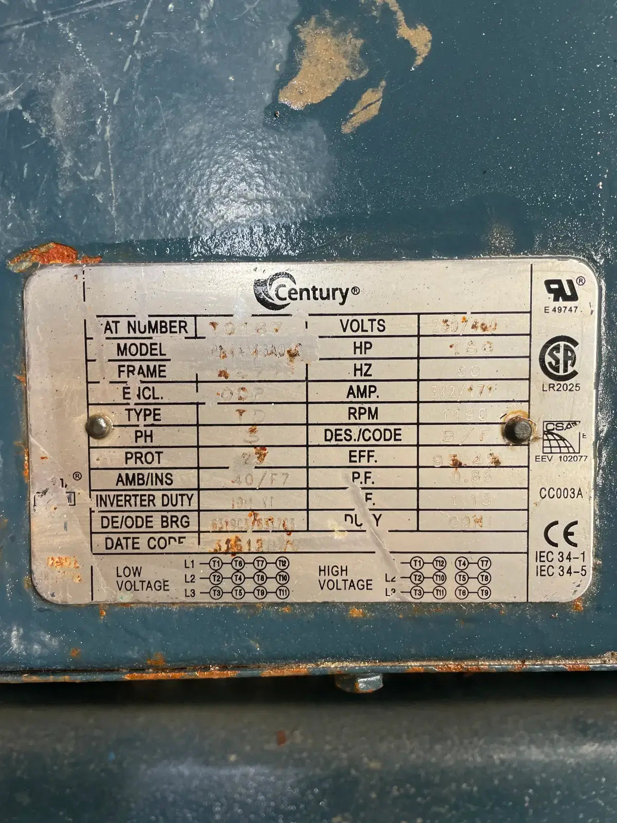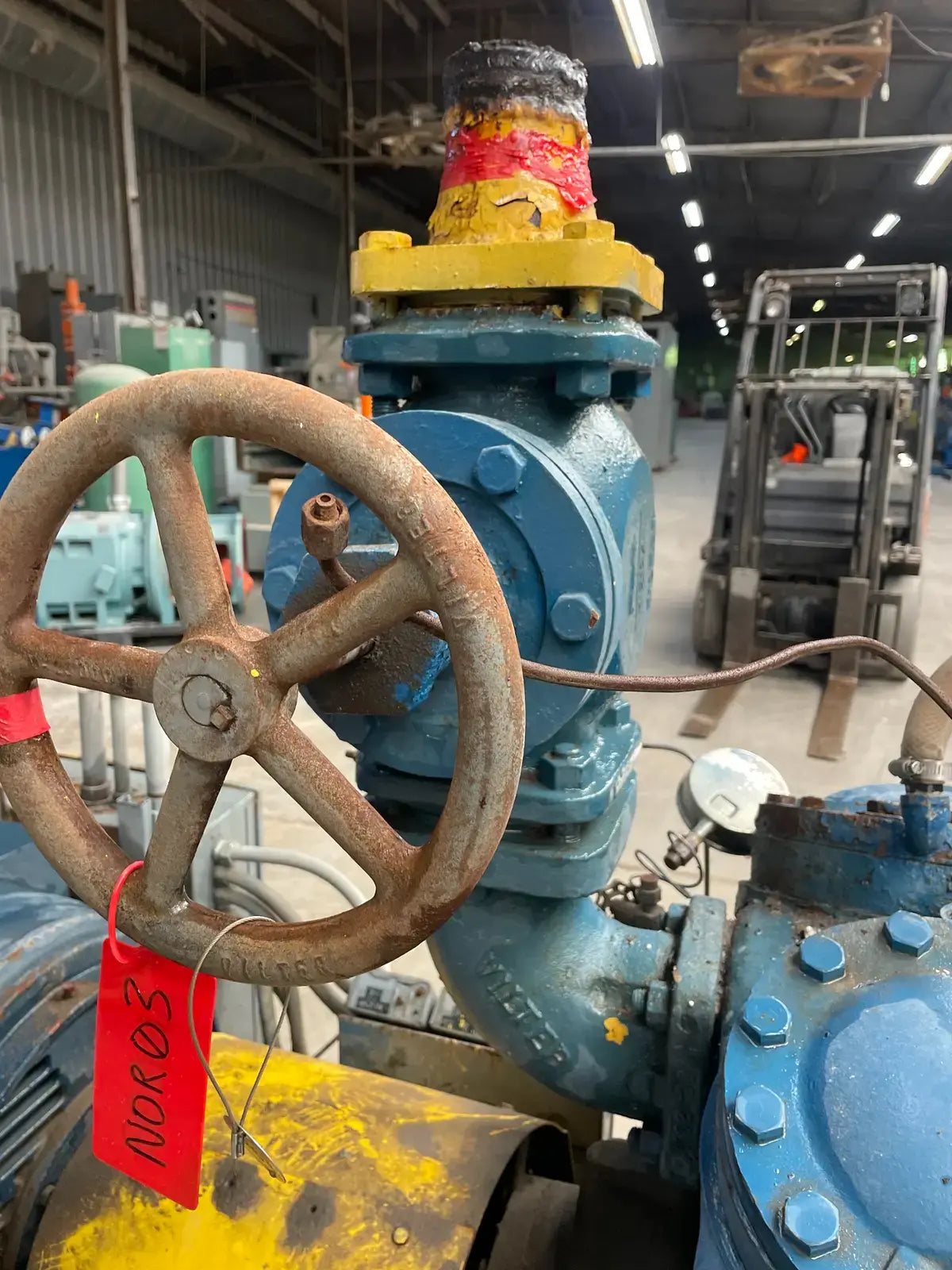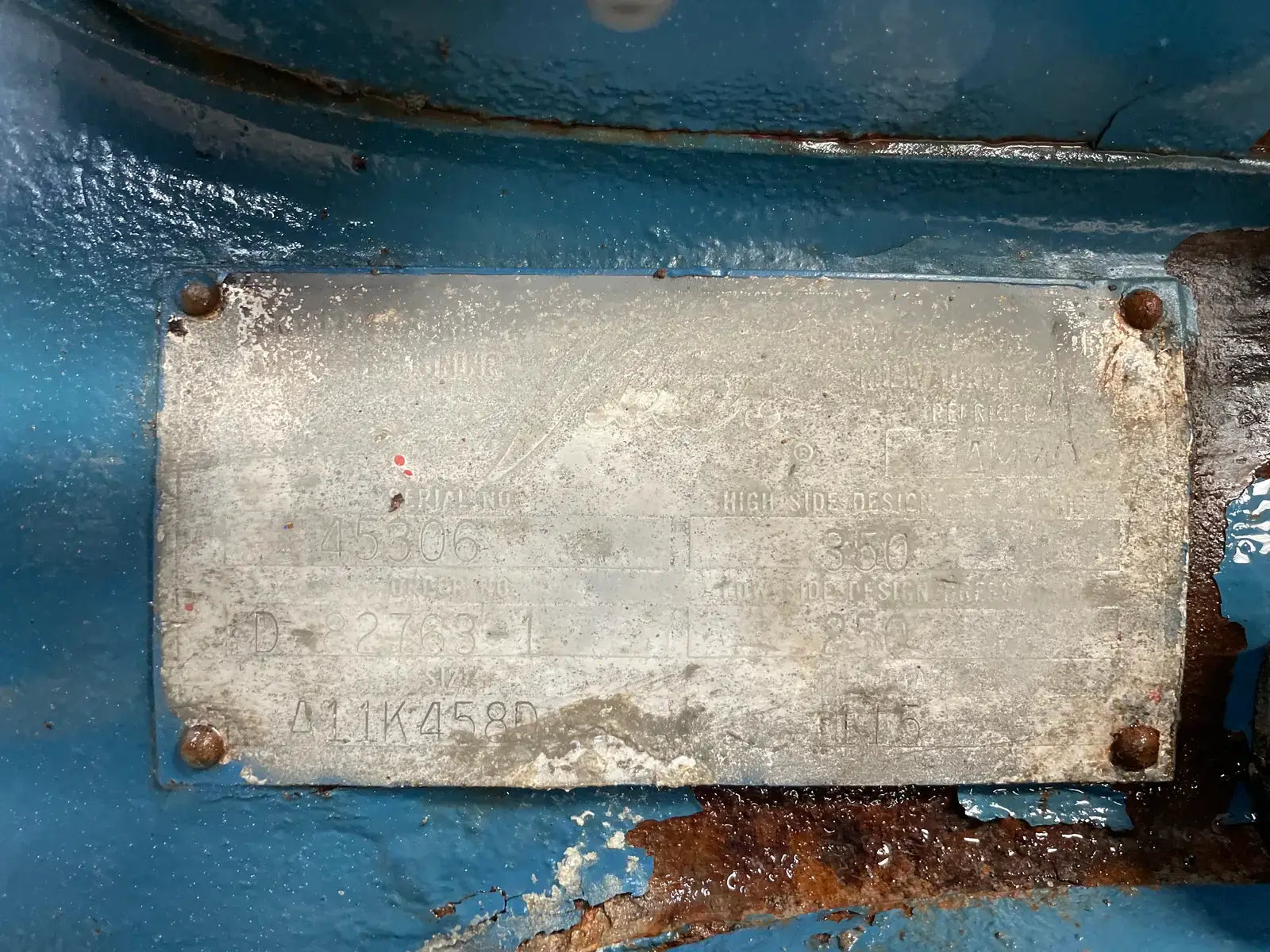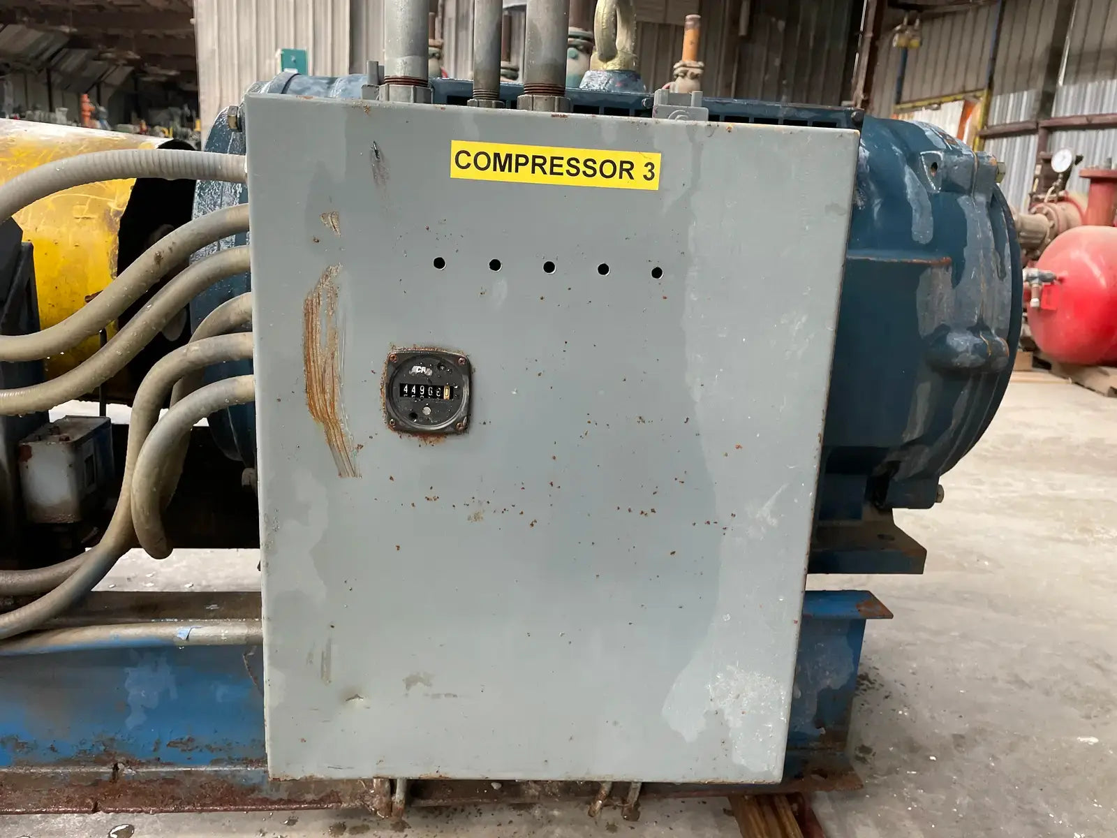 Compresor alternativo de accionamiento directo Vilter 458. Número de serie: 45306. Número de pedido: D-82763-1. Tamaño: A11K458D. Refrigerante: Amoníaco. Alta presión de diseño: 350 PSIG. Presión de diseño del lado bajo: 250 PSIG.