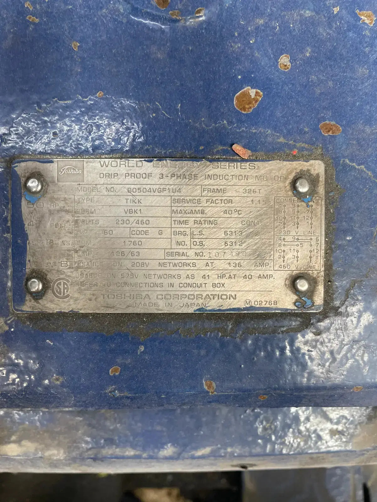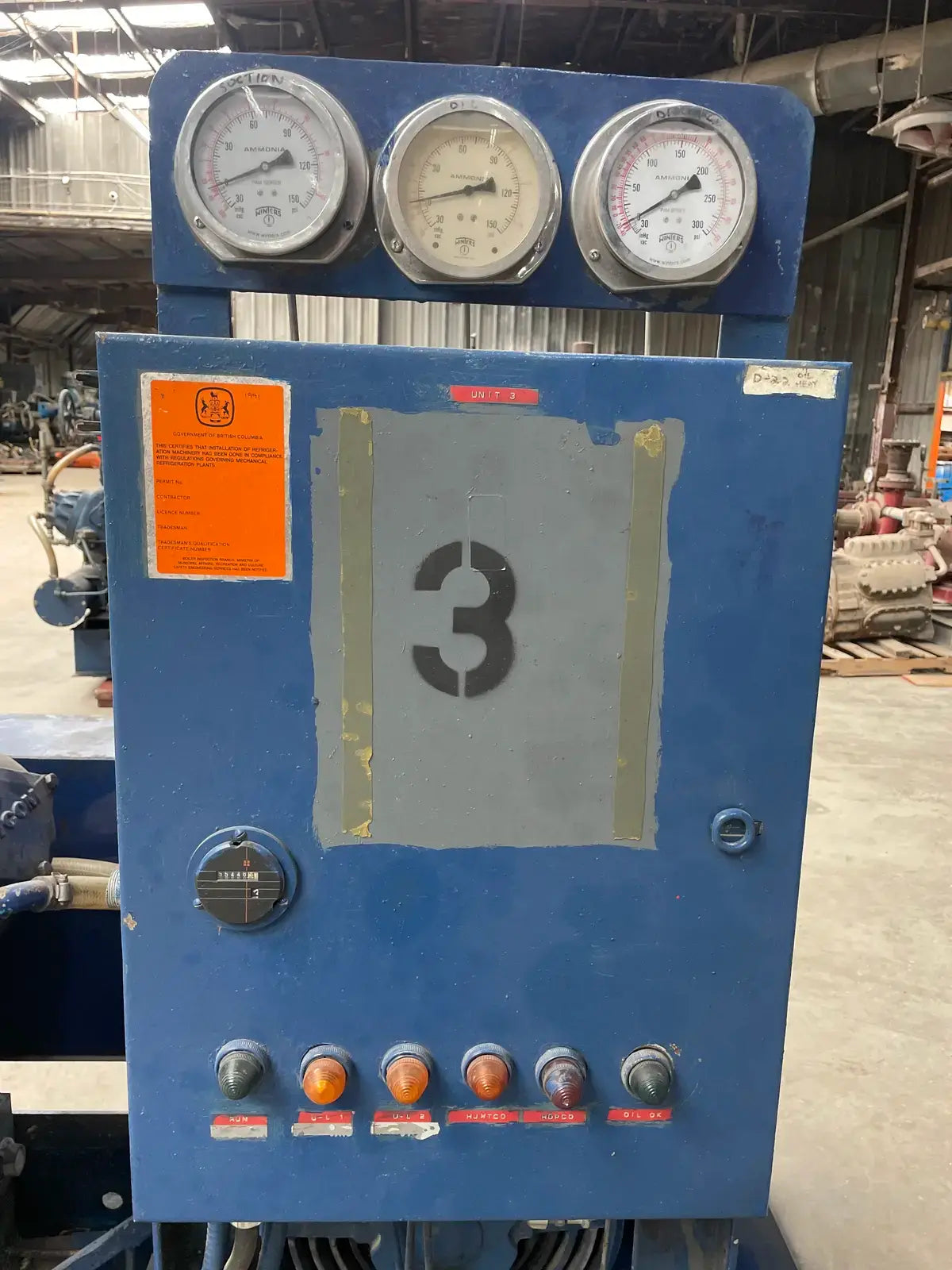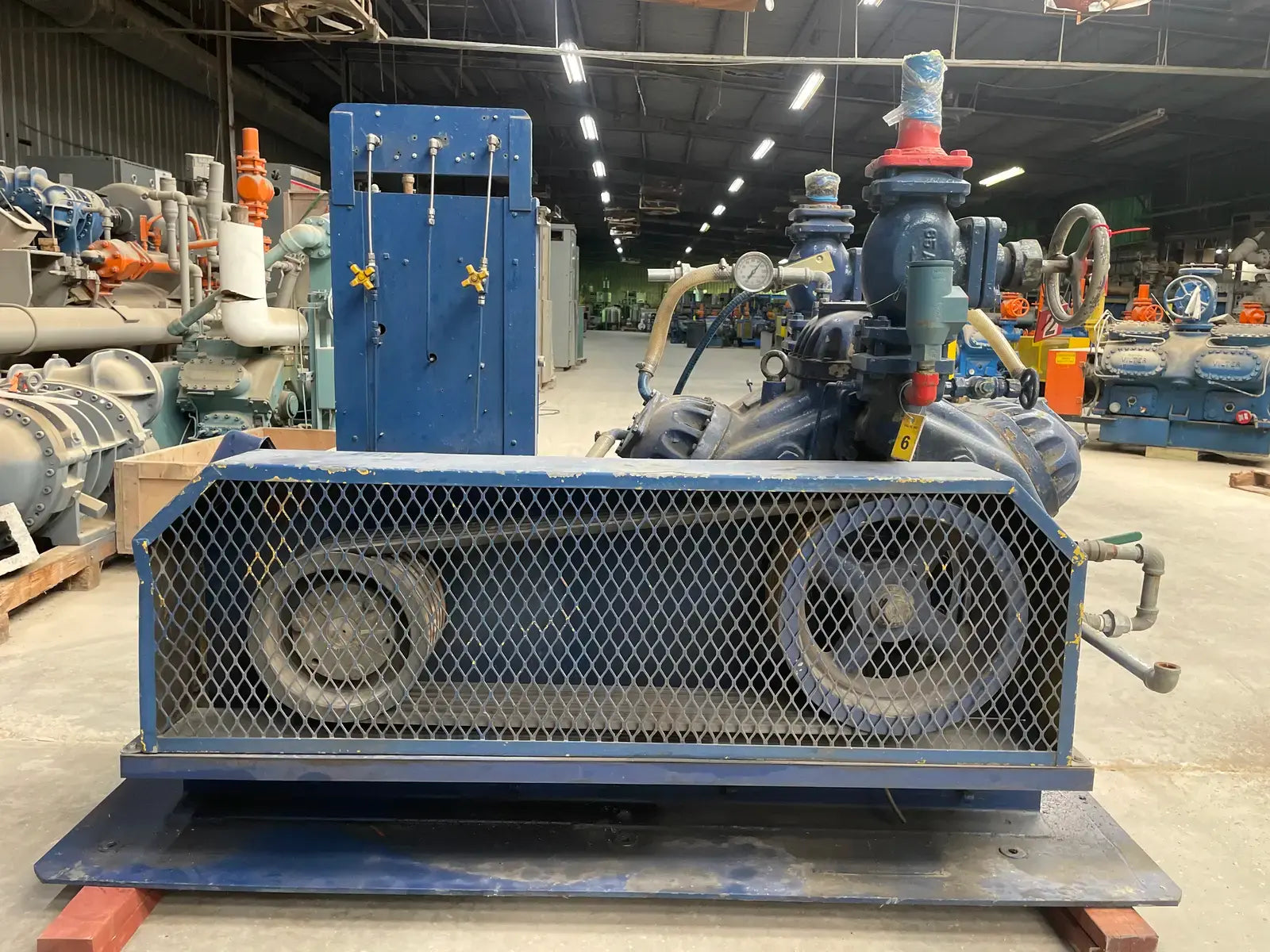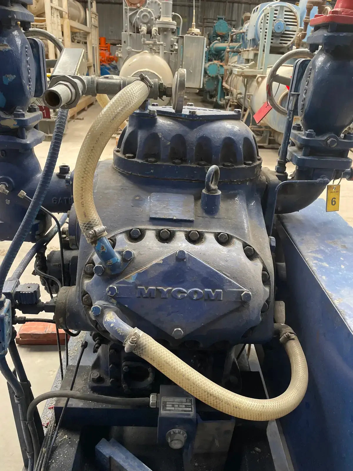 Compresor alternativo Mycom de 6 cilindros. Modelo: N6A. Número de serie: 17365. Número de cilindros: 6. FUGA (PSIG): 313 HP. 185 LP. HIDRÁULICO (PSIG): 470 HP. 470 LP. Motor eléctrico Toshiba - HP: 50. Voltios: 230/460. Hz: 60. RPM: 1760. AMPERIOS: 126/63. Cuadro: 326T. PH: 3.