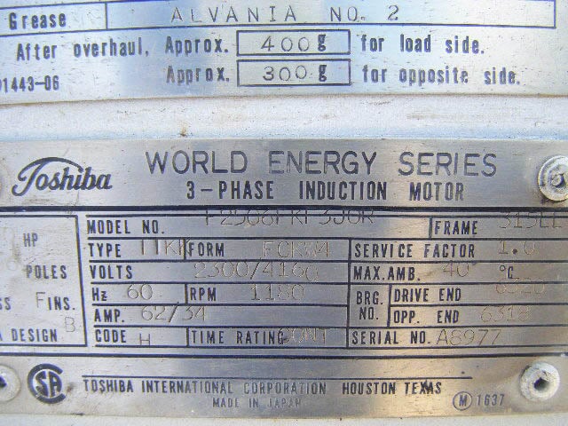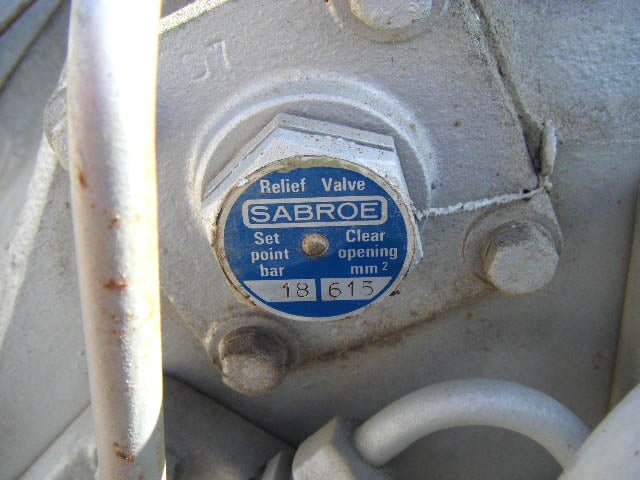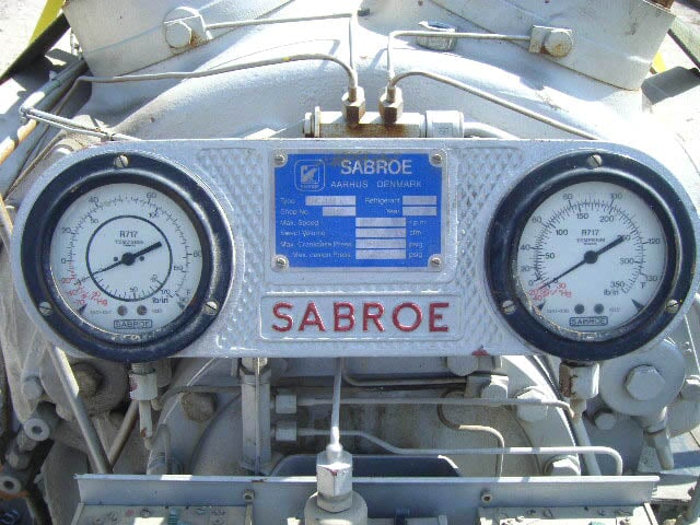 Compresor alternativo de amoníaco Sabroe. Modelo: SMC 116L. Tienda/n.º de serie 83169 Refrigerante: R717. Aproximadamente 150 TR a 95 °F CT / 17 °F SST (NH3) a 1180 RPM. Volumen barrido al máximo. rpm (1500 rpm): 666 cfm. Presión del cárter: 261 psig. Máx. Presión de diseño: 610/305 psig. Punto de ajuste de la válvula de alivio Sabroe: 261 psi (18 bar). Motor Toshiba World Energy Series. 250 hp, 1180 rpm, 2300/4160 V, 62/34 amperios, 60 Hz, trifásico. Entradas/Salidas: (1) puerto de 6 pulg., (1) tubo de ½ pulg., (1) tubo de ¾ pulg., / (1) puerto de 4 pulg., (1) FNPT de ½ pulg. Dimensiones totales: 11 pies de largo x 3 pies 9 pulgadas de ancho x 5 pies de alto. Tiempo de funcionamiento: 22929,9 horas (H12)