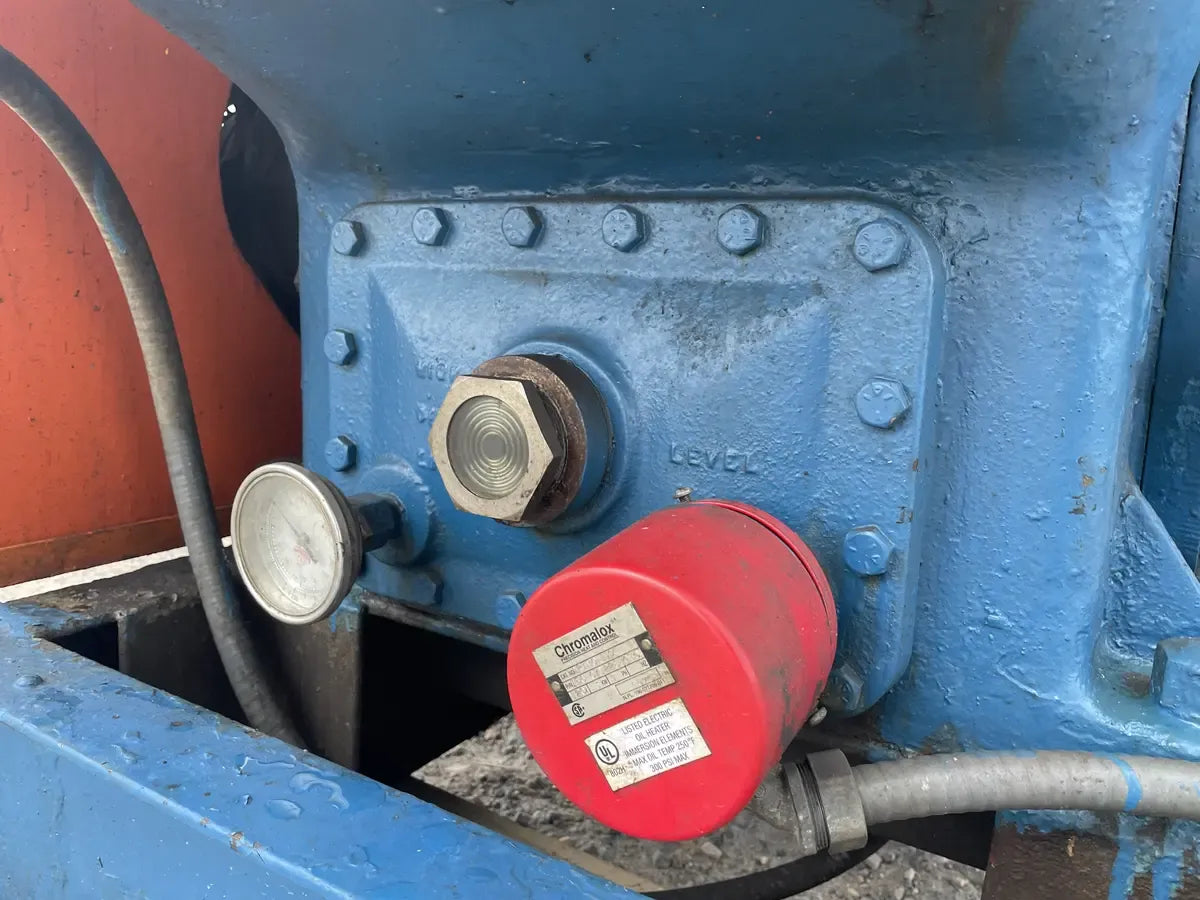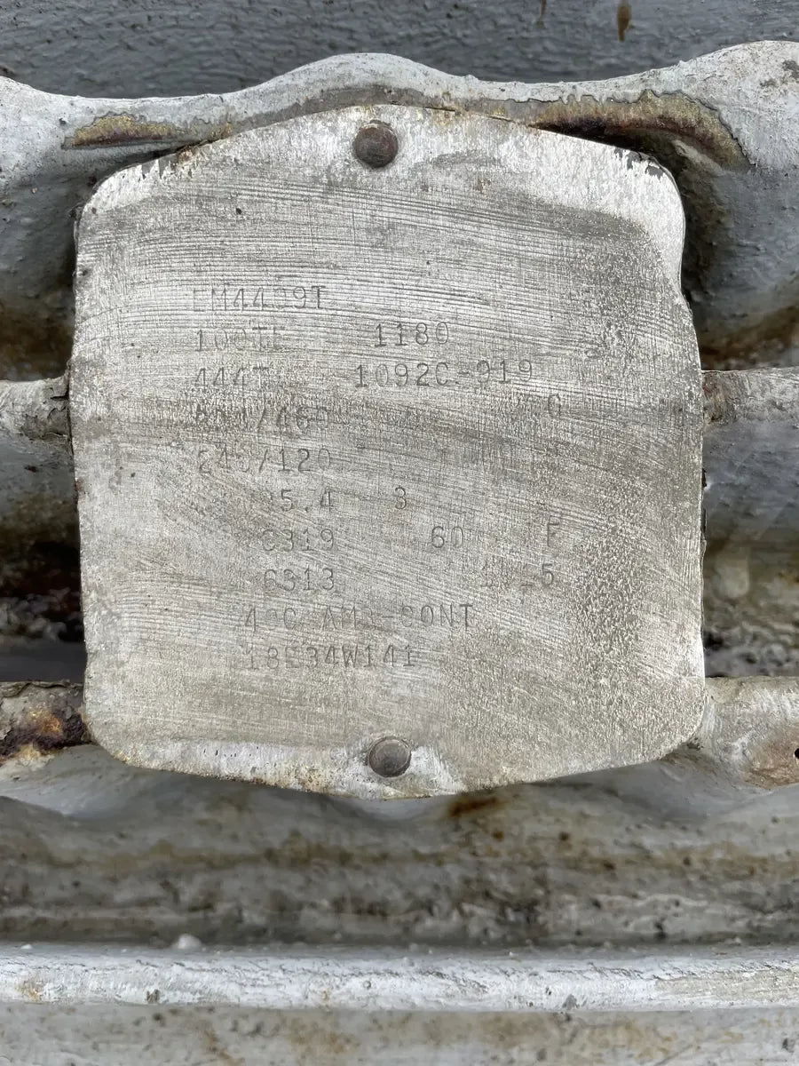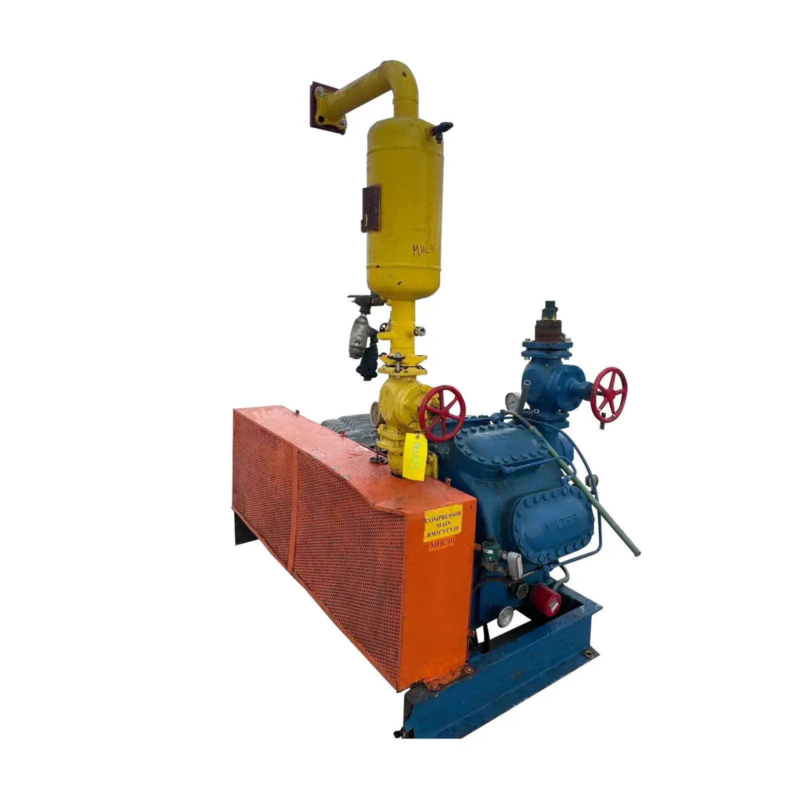Compresor alternativo de 8 cilindros Vilter 438 - Modelo: 438, cilindros: 8. Desplazamiento a RPM máximas (CFM): 235. Año de fabricación: 2004. Falta placa de datos. Los datos proporcionados sobre el compresor se obtuvieron de un manual de Vilter y de Prodalim Group, donde se compró la unidad. Motor de inducción Baldor - Número de serie: EM4409T, HP: 100TE, RPM: 1180, FR: 444T, Voltios: 206/460, AMPS: 240/120, Ph:3, Hz: 60, Servicio: Cont. Separador de aceite de refrigeración Phillips - Separador de aceite Phillips - Certificado por HA Phillips & Co: INT. MAWP 300 PSI a 450 F, MDMT: -20 F a 300 PSI, EXT. MAWP: 15 PSI.